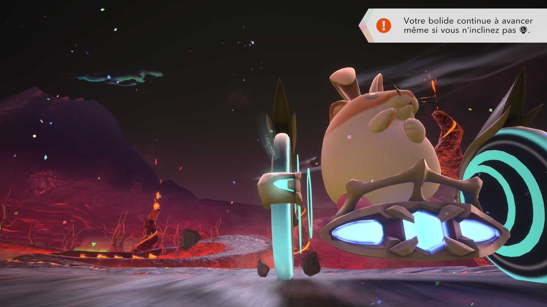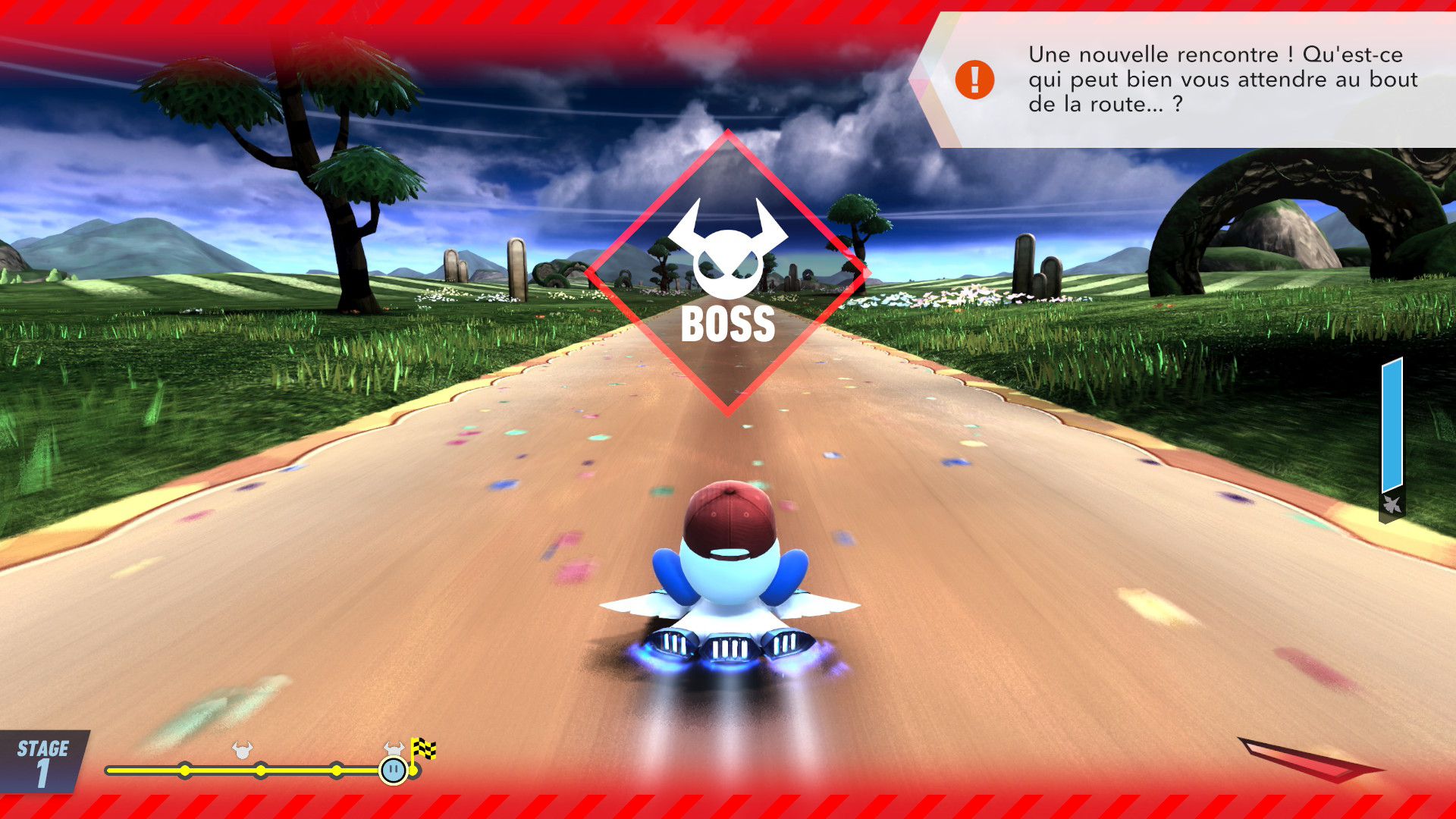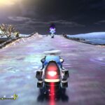 Ce mode peut également donner l’occasion de découvrir les spécificités de chaque bolide, sans s’entraîner à la dure. Pour les personnes qui débutent, le regard va se porter sur les bolides les plus maniables, comme Néochar ou Étoile vampire. Par contre, en choisissant le niveau de difficulté normal et difficile, il va surtout être recommandé de bien s’entraîner… D’autant plus que même en facile, certains défis peuvent devenir plus compliqués que d’autres au fur et à mesure que l’on progresse, surtout en choisissant les récompenses sans trop réfléchir. En effet, les récompenses gagnées en cours de partie sont similaires à celles que l’on obtient dans City Trial. Ainsi, notre bolide peut devenir plus rapide… et donc moins maniable. Même en facile, il est important de savoir doser l’attribution des récompenses. Cela donne une dimension RPG assez appréciable, puisque le mode rajoute ainsi de la profondeur à ce titre. De plus, bien qu’elle soit assez secondaire, racontée exclusivement sous la forme de cinématiques et sans mise en scène vraiment extraordinaire compte tenu de la façon dont elle est incorporée dans le titre, l’histoire est un ajout bienvenu, qui réserve son petit lot de surprises… Par ailleurs, c’est aussi dans ce mode que l’on trouve d’autres célébrations de la série, avec l’apparition de nombreux personnages et ennemis de la franchise sous la forme d’illustrations animées. Ce n’est pas si secondaire que cela, puisque chaque personnage rencontré de cette façon permet d’accéder à des stades différents en fonction de celui que l’on choisit de rencontrer sur la route.