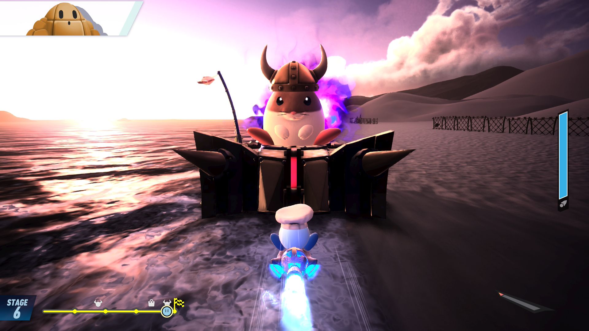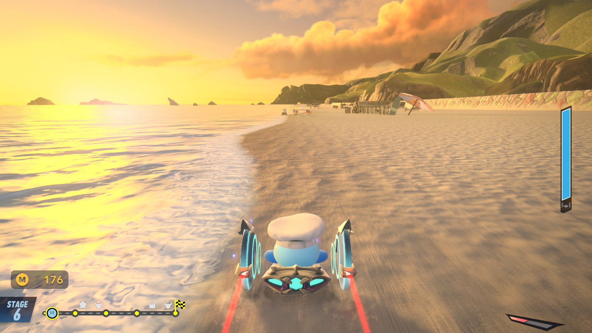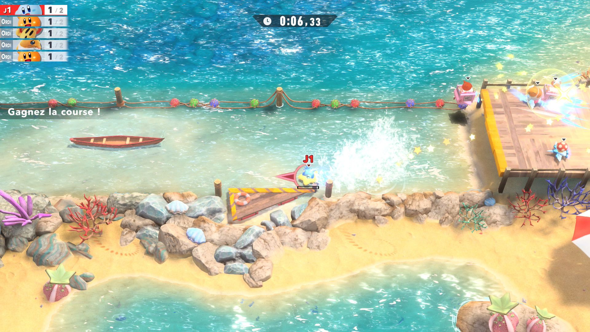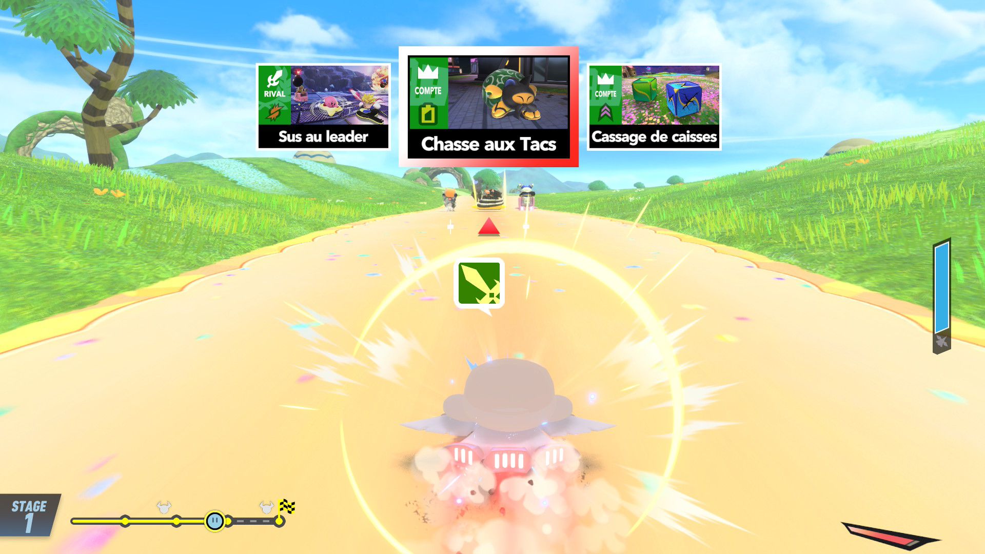 Maintenant que l’on a fait le tour de chaque mode de jeu principal, il convient de revenir sur d’autres aspects du jeu. En plus d’avoir eu accès au jeu complet, nous avons eu la chance de participer à plusieurs parties en ligne. Lors des premières, il faut avouer qu’il y avait un peu d’inquiétude : les erreurs de connexion s’enchaînaient. Cependant, il s’est avéré que c’était tout à fait provisoire. La cause est encore inconnue aujourd’hui, mais la plus probable est la possible mauvaise qualité de la connexion d’une ou plusieurs personnes présentes en ligne (dont évidemment celle de l’auteur de ce test). Il n’y a eu aucun problème lors des autres parties : tout était parfaitement fluide et le fun était bien là. C’était assez similaire à ce que l’on pouvait trouver dans la démo, mais ici, la liberté était forcément plus grande avec, déjà, la possibilité de jouer à Top Ride ou encore de jouer avec plus de personnages et des bolides personnalisés. Niveau multijoueur, on rappelle que les possibilités sont encore plus nombreuses avec la possibilité de jouer en local jusqu’à huit. En ligne, on rappelle qu’il est possible de rejoindre un foyer, ce qui constitue d’ailleurs l’un des éléments les plus mignons de ce titre, et de partager ou d’acheter des bolides personnalisés. Il y a également un mode spectateur.