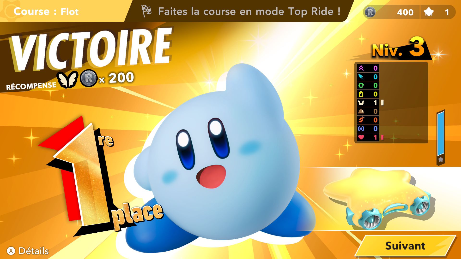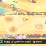 Ensuite, il y a le mode Top Ride, qui n’était pas prévu à l’origine. En effet, les développeurs ne prévoyaient pas d’ajouter ce mode directement inspiré de Kirby Air Ride, car il était compliqué de l’ajouter dans Kirby Air Riders, car il y avait déjà tant de contenu dans le nouveau titre. Néanmoins, il a quand même été ajouté. Bien que le gameplay soit assez particulier et limité (on pilote en choisissant deux styles différents, stick libre en inclinant le stick L dans la direction où on va et stick volant en inclinant le stick L à gauche ou à droite pour tourner), il s’avère plutôt amusant, les sensations sont bonnes et on peut s’étonner à participer à plusieurs sessions assez longtemps. D’ailleurs, il n’est pas simplement un mode bonus : il comporte plusieurs missions qui permettent là aussi de débloquer de nouveaux éléments. Comme dans Air Ride, il y a aussi des modes contre-la-montre et essai libre, et il est possible de jouer en ligne.