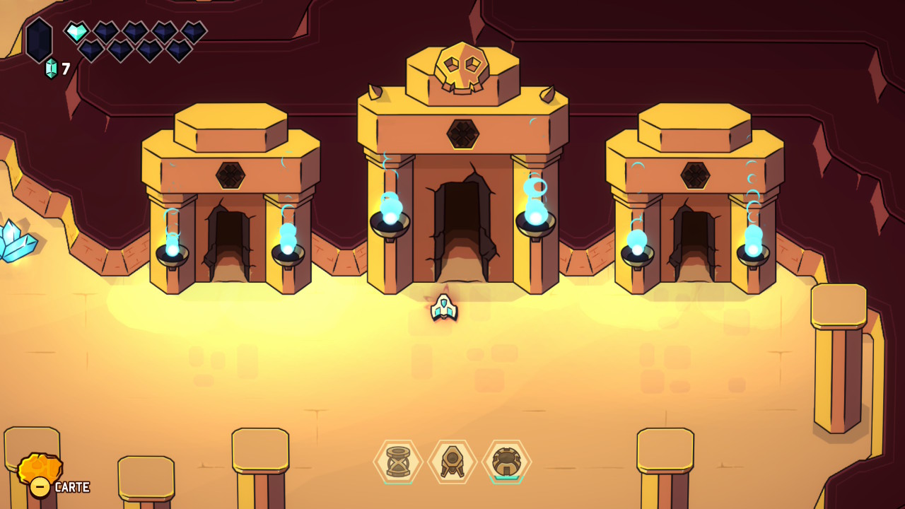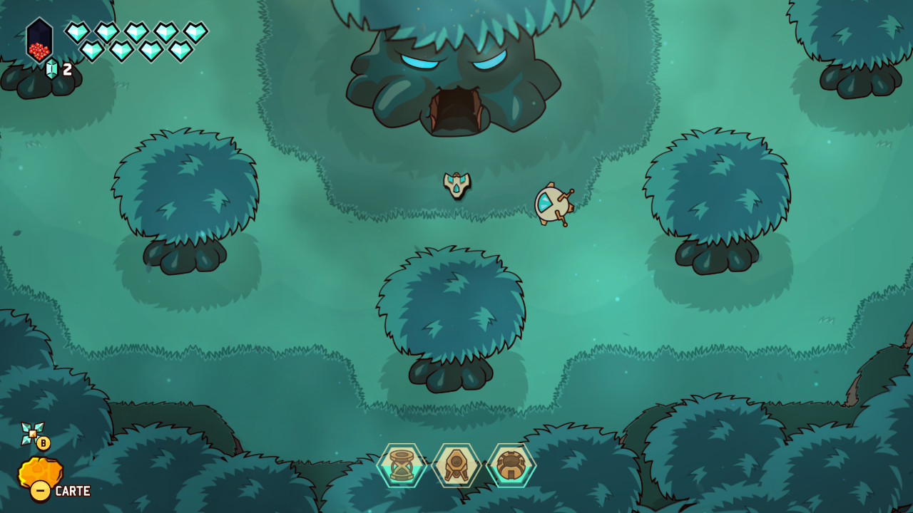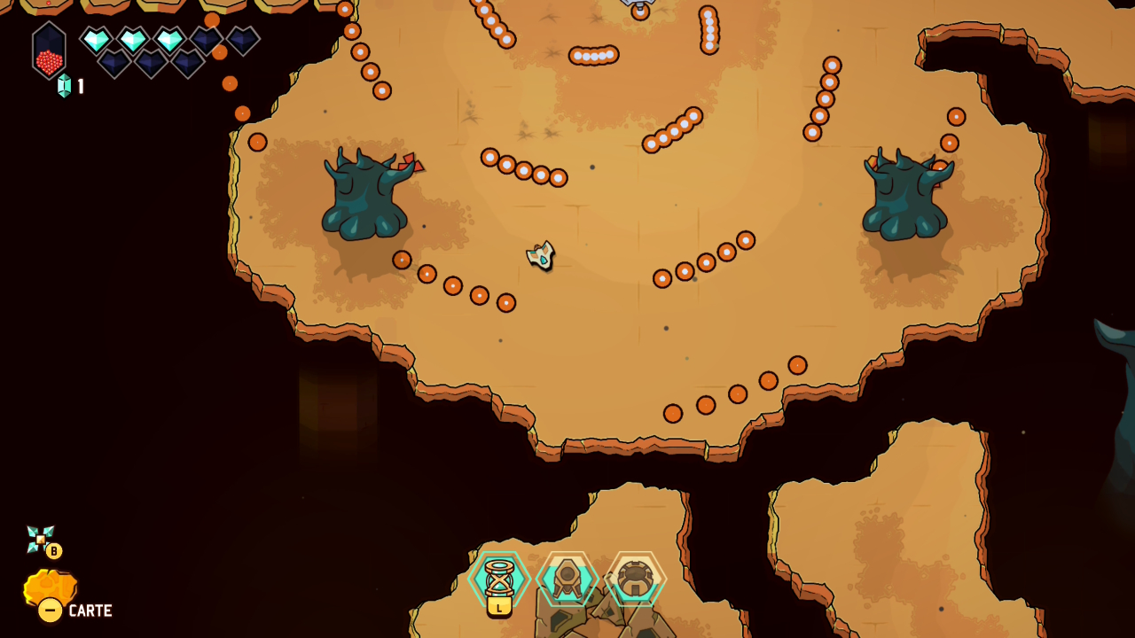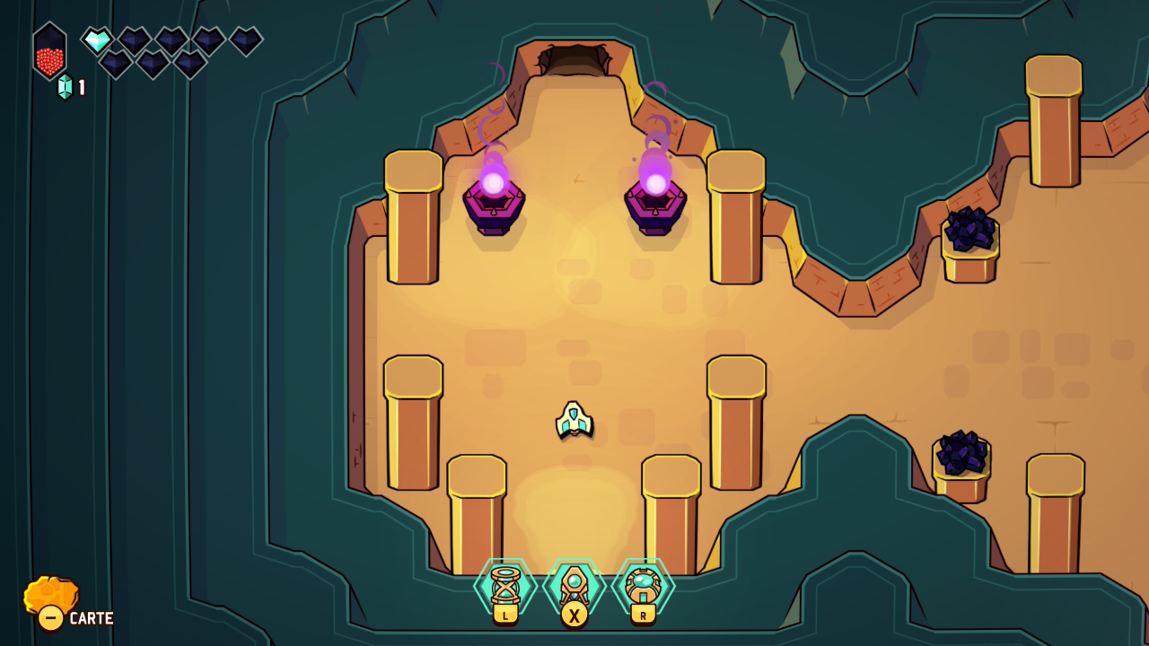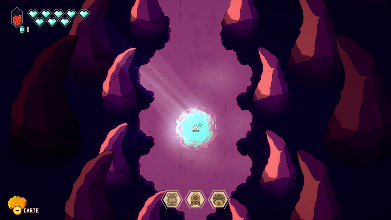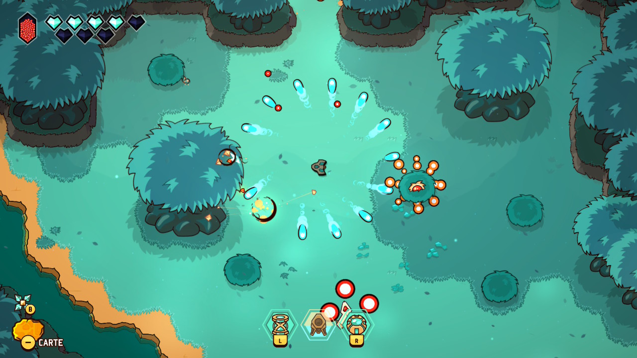 Le principe initial est donc bien connu : on prend la structure et le graphisme d’un Link to the Past avec ses donjons, sa progression dépendante de capacités acquises, ses rencontres de PNJ nous permettant d’évoluer, et on y injecte les mécaniques d’un twin-stick shooter inspirées des standards du bullet hell, dans la veine de Touhou Project, avec son approche de l’immédiateté du gameplay, ses déplacements fluides, et ses gestes d’esquive parfois au poil près. Jamais artificielle, cette greffe offre une sensation d’évidence très tôt dans le jeu. Le vaisseau incarné par le joueur se déplace avec une souplesse remarquable, tandis que le tir directionnel devient une extension naturelle du mouvement. Et c’est une des premières forces de cette proposition, puisque les deux approches coexistent en permanence, en s’alimentant mutuellement et en rendant son concept toujours parfaitement lisible et instinctif.