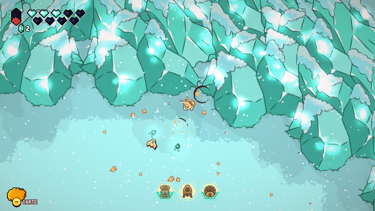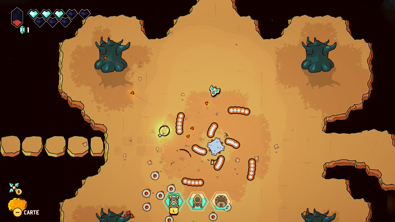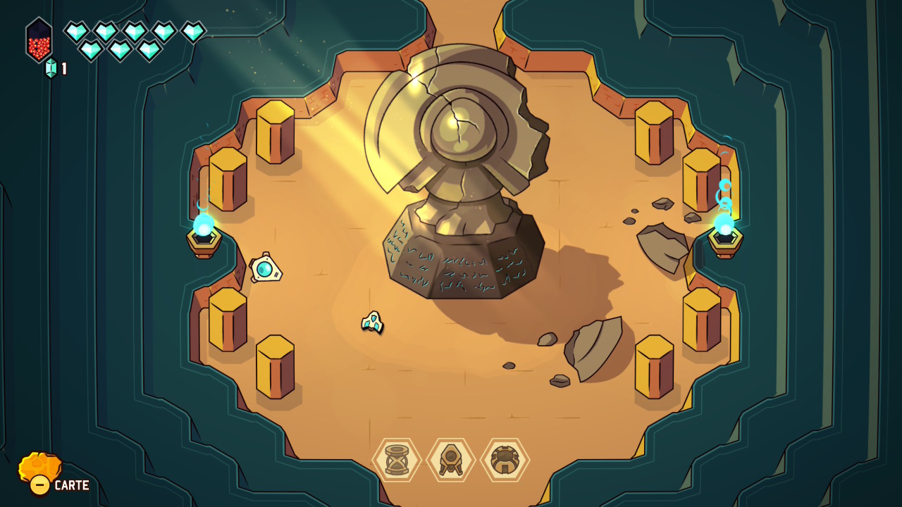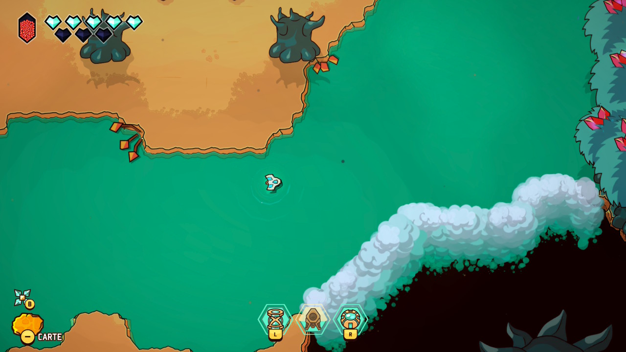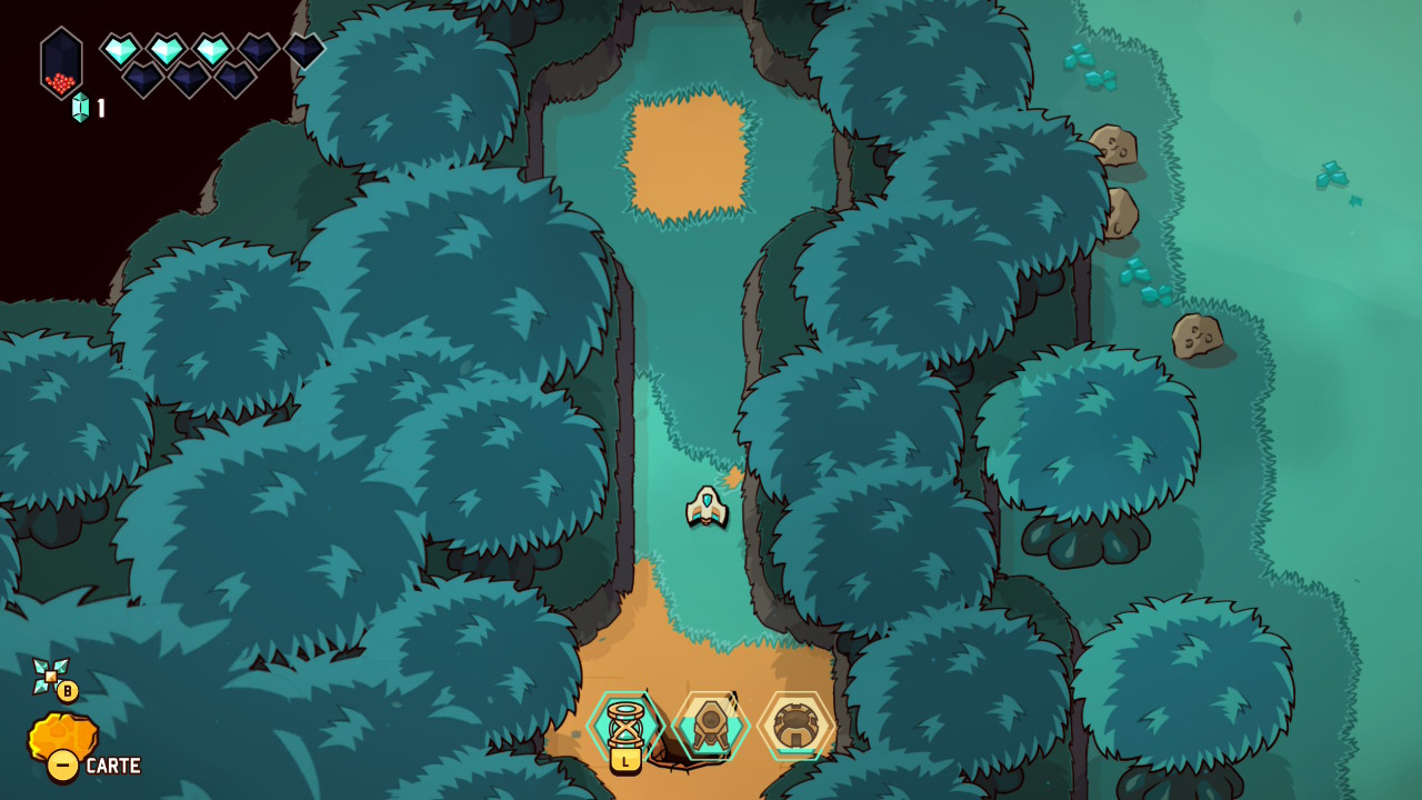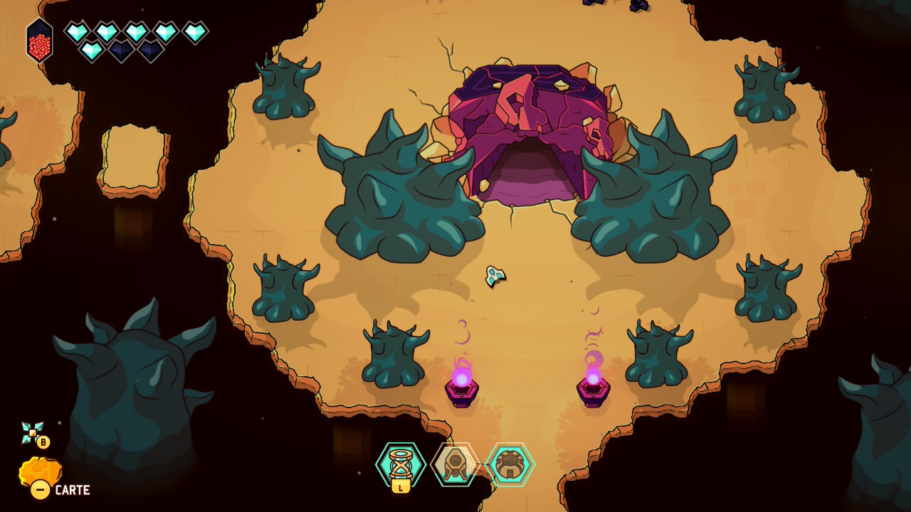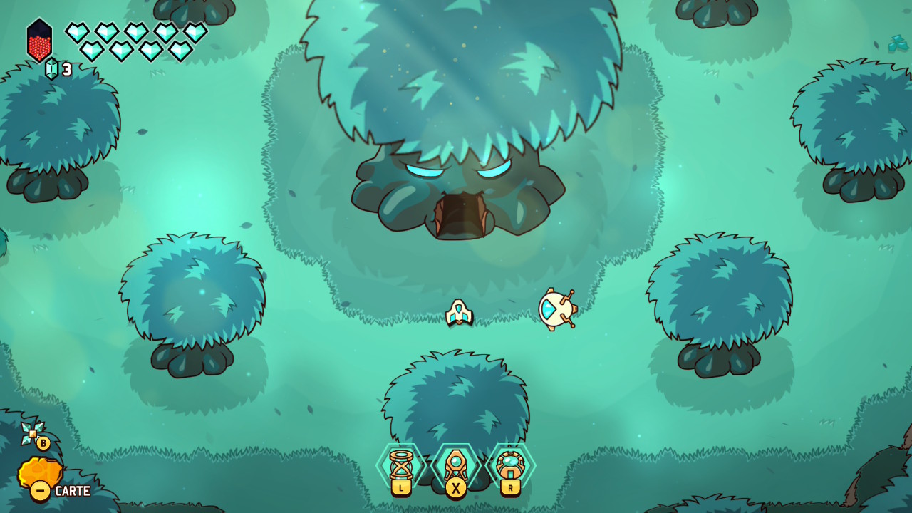 Le principe initial est donc bien connu : on prend la structure et le graphisme d’un Link to the Past avec ses donjons, sa progression dépendante de capacités acquises, ses rencontres de PNJ nous permettant d’évoluer, et on y injecte les mécaniques d’un twin-stick shooter inspirées des standards du bullet hell, dans la veine de Touhou Project, avec son approche de l’immédiateté du gameplay, ses déplacements fluides, et ses gestes d’esquive parfois au poil près. Jamais artificielle, cette greffe offre une sensation d’évidence très tôt dans le jeu. Le vaisseau incarné par le joueur se déplace avec une souplesse remarquable, tandis que le tir directionnel devient une extension naturelle du mouvement. Et c’est une des premières forces de cette proposition, puisque les deux approches coexistent en permanence, en s’alimentant mutuellement et en rendant son concept toujours parfaitement lisible et instinctif.