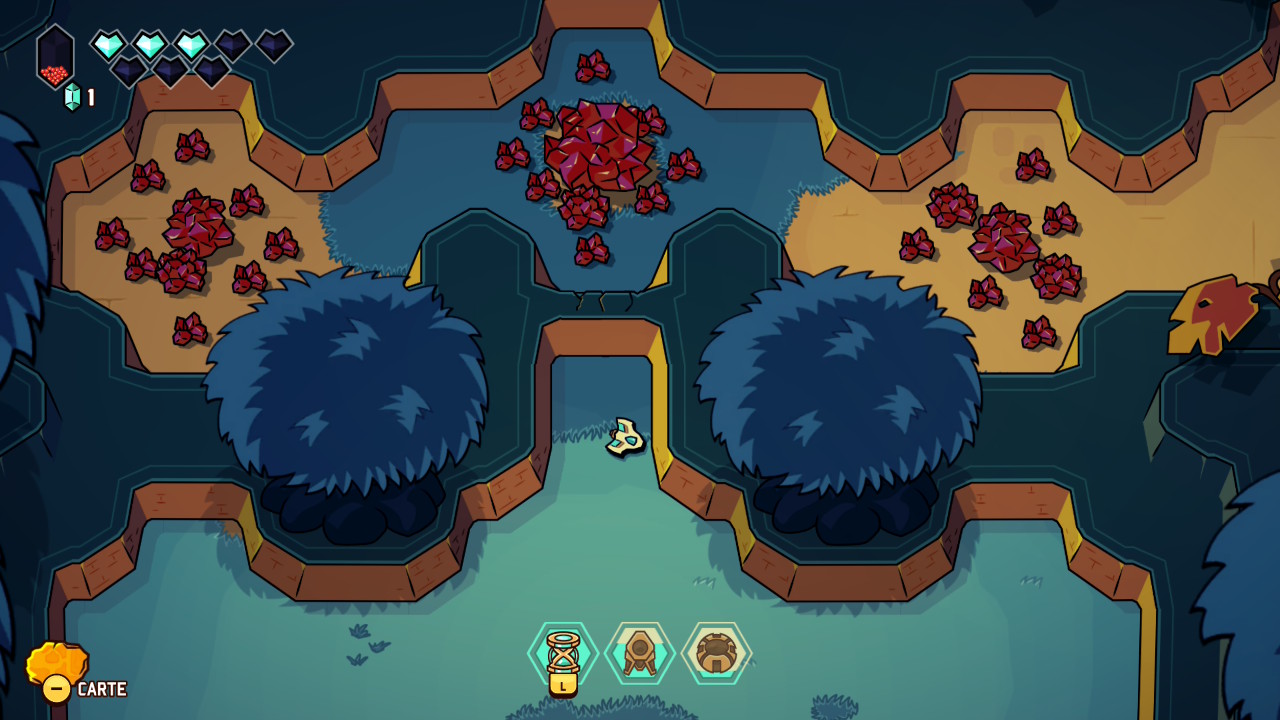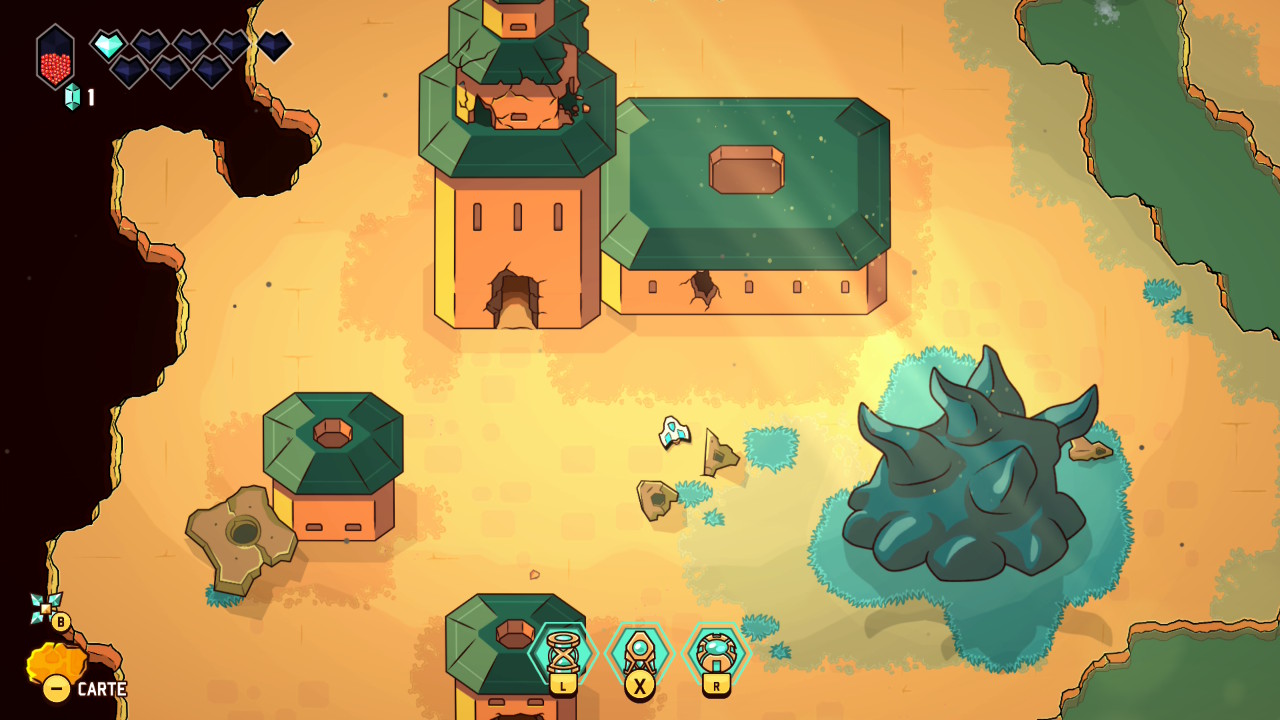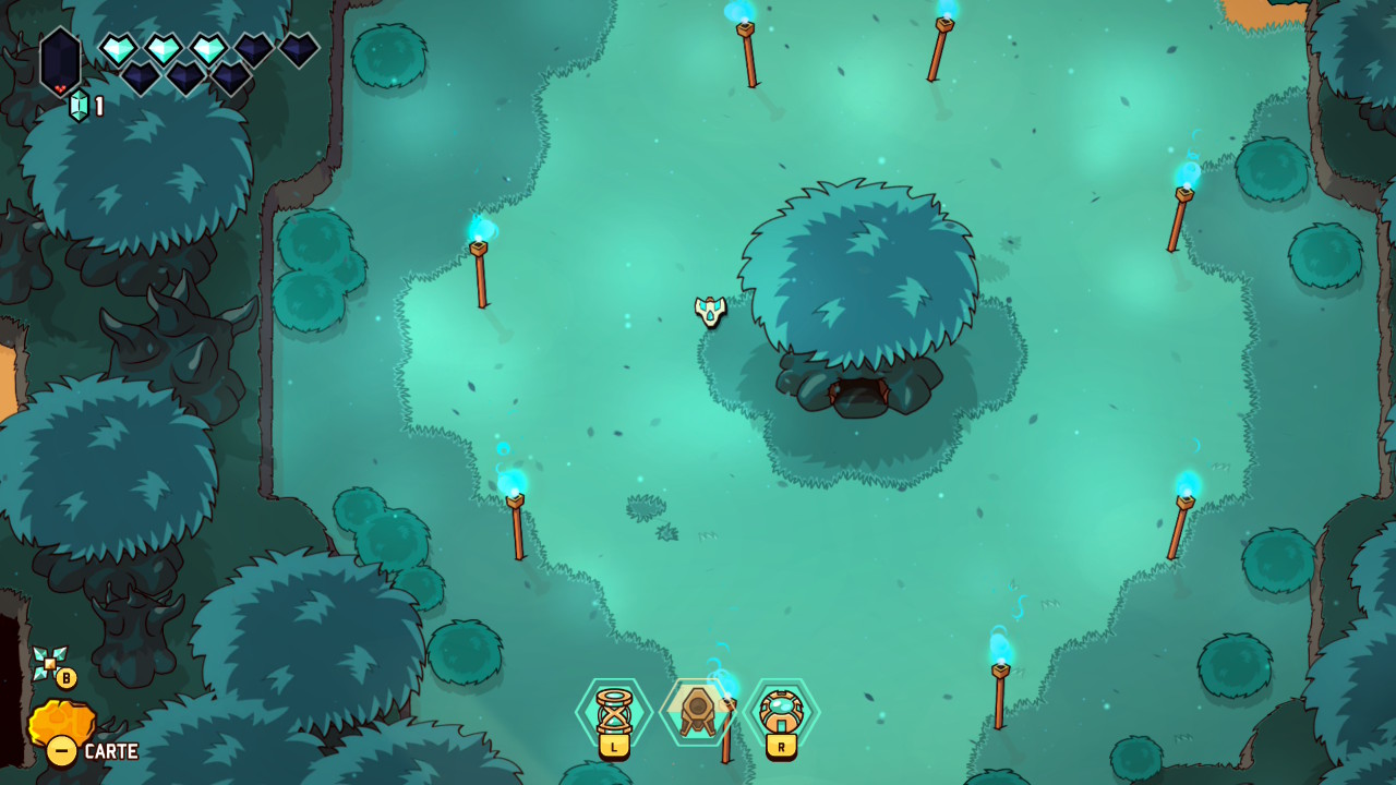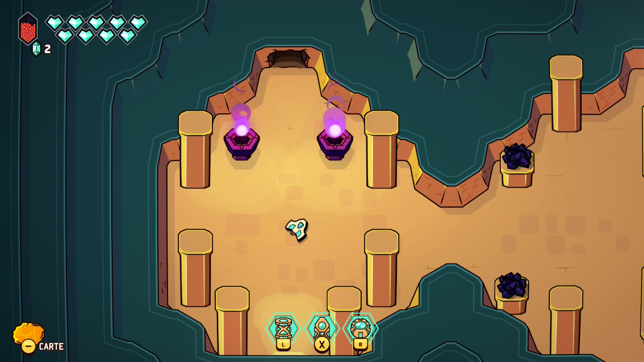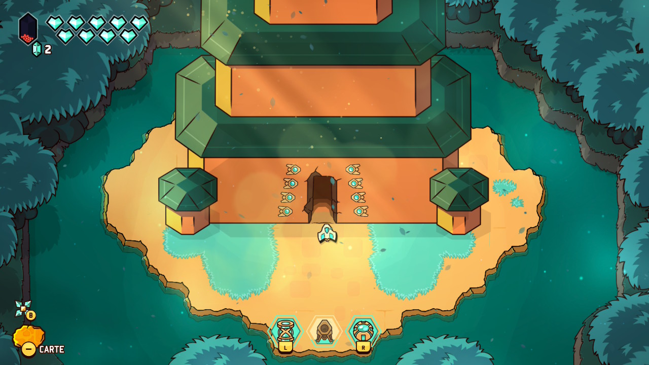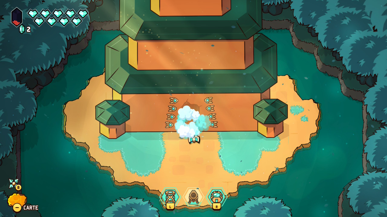 Les donjons et énigmes veillent également à maintenir le rythme appliqué à l’expérience, en reprenant les poncifs du genre avec leurs portes verrouillées, les clés, les pièges et les boss, mais ne venant jamais bloquer durablement le joueur. Les petits défis demeurent simples et lisibles, aux solutions presque toujours décelables du premier coup, mais avec suffisamment de variété, tout en sollicitant le pouvoir « thématique » propre au donjon exploré. Le système de progression suit aussi ce mouvement, organisé autour de cristaux rouges à accumuler et à transformer en points de capacités, alimentant un arbre de compétence suffisamment simple pour ne pas perdre de temps dans le menu. Ce système épouse par ailleurs l’impression de grande liberté offerte par le jeu, permettant de réinitialiser ses choix sans pénalité et d’adapter les options en fonction de chaque profil, de chaque donjon, ou de chaque boss.