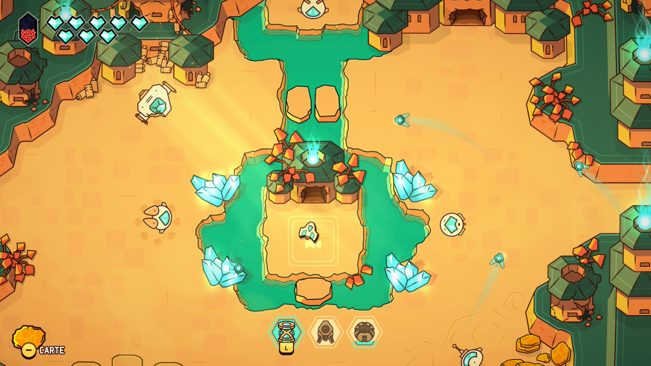 La seule rupture constatée se trouve justement auprès des boss et de quelques « arènes », qui concentrent toute la dimension bullet hell du jeu, multipliant les patterns, les phases ou les variations. Des moments de tension pure, où la maîtrise du déplacement et du tir est mise à l’épreuve, qui montrent que sous ses couleurs vives et son esthétique mignonne, Minishoot’ Adventures cache une réelle exigence, en tout cas pour ceux étant friands de ce type de challenge. Il propose en effet plusieurs niveaux de difficulté, ainsi que des options d’accessibilité permettant d’ajuster finement l’expérience, comme l’assistance à la visée, le ralentissement de l’action, ou l’invincibilité. Côté compositions musicales enfin, si les morceaux ne vont pas rester infiniment en tête, les nappes électro discrètes en cours d’exploration et les fulgurances plus rythmées et plus denses en combat injectant une énergie plus marquée, savent intelligemment s’oublier pour soutenir le flow en filigrane et mettre l’accent sur les points forts du jeu, tout au long des dix à douze heures nécessaires pour terminer l’aventure à 100 %.