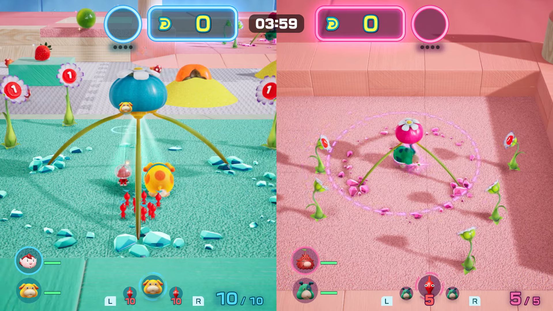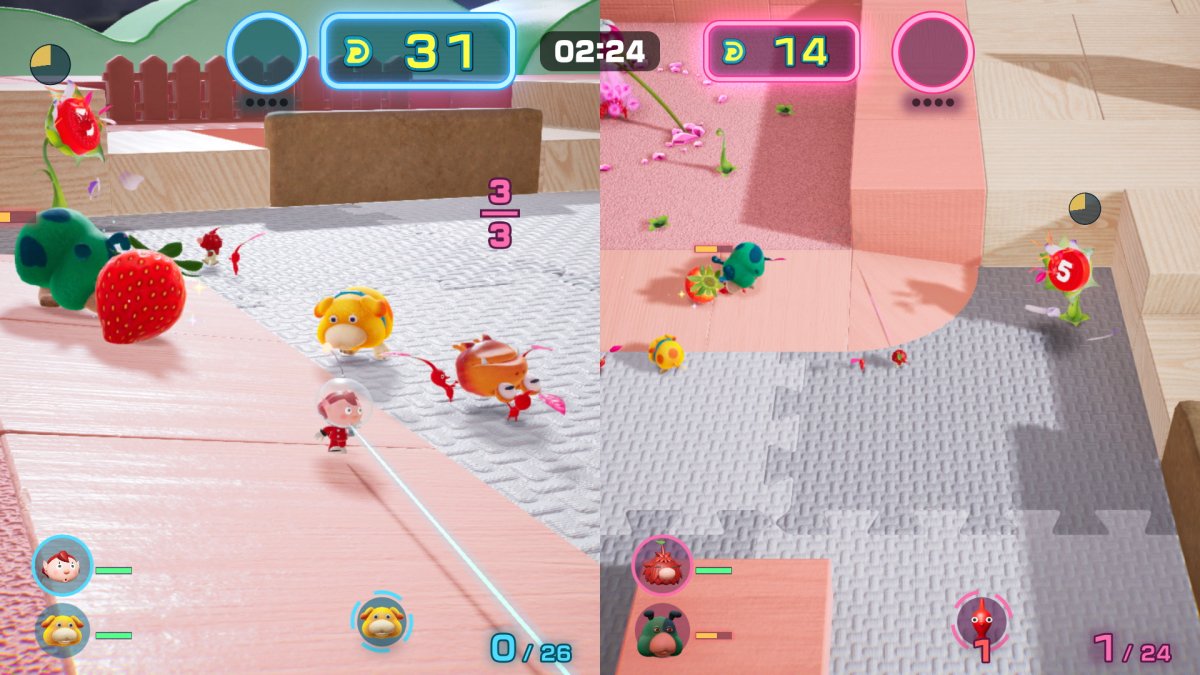 Si ces phases de jeu permettent de varier les plaisirs, on s’avoue finalement peu convaincu par l’ensemble de la proposition. Alors qu’on s’attendait à une véritable exploration de nuit, à savoir une expérience plus dangereuse qu’à l’accoutumée ou même une revisite des niveaux traversés, on a finalement droit à des missions extrêmement linéaires et franchement répétitives dans leur fonctionnement et approche ; seule leur difficulté croissante les différenciera. En parlant des feuillus, certains d’entre eux attendront le joueur devant un souterrain. Ceux-là gardent les Défis et Duels Dandori, une activité pas si nouvelle que ça, mais qui devient une mission dans l’aventure et non plus un mode de jeu annexe. En effet, à la manière d’un Duel Bingo de Pikmin 3 ou du mode Bataille 2 joueurs de Pikmin 2, le joueur sera amené à affronter une IA : il lui faudra récolter plus de points que son adversaire, tout en essayant de lui mettre des bâtons dans les roues et se défaire de ses attaques. Chaque trésor, palet et monstre rapporte des points, ceux-ci pouvant être doublés ou triplés selon les bonus intervenant au cours de la partie. Les Défis Dandori eux, sont similaires à une course contre-la-montre dans laquelle il faudra absolument récupérer le plus de trésors possible avant que le temps ne soit écoulé.