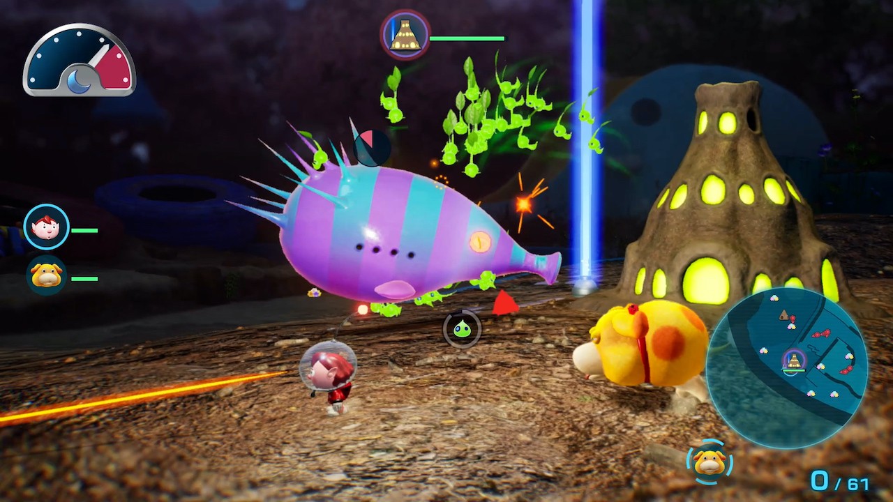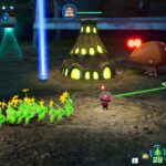 Ainsi sont introduites les expéditions de nuit, une nouveauté de ce Pikmin 4 dans laquelle le joueur doit retourner sur le terrain une fois le soleil couché. Les amateurs de la série le savent : trainer dans la nature lorsque la lune pointe le bout de son nez est extrêmement dangereux. Par chance, ces sorties nocturnes permettront de se lier d’amitié avec les fameux Pikmin luisants. À travers de courtes missions prenant la forme ou presque d’un tower-defense (sans l’aspect construction de tour), il faudra récolter un maximum de pierres étoilées pour donner naissance à une véritable armées de pousses fluorescentes et repousser des vagues de monstres assoiffés de nectar. Ce même nectar capable de guérir les feuillus repose au sein d’une « lumilière » qu’il faudra protéger à tout prix, notamment en éliminant les créatures ennemies, mais aussi en les ralentissant avec des « lumileurres » (des lumilières factices pouvant attirer momentanément l’attention des monstres). Une fois tombée, c’est la défaite, mais en repoussant assez d’ennemis ou en résistant suffisamment longtemps, la mission est un succès et une dose capable de remettre sur pied un feuillu nous est offerte par le médecin de l’équipage, une fois celui-ci sauvé.