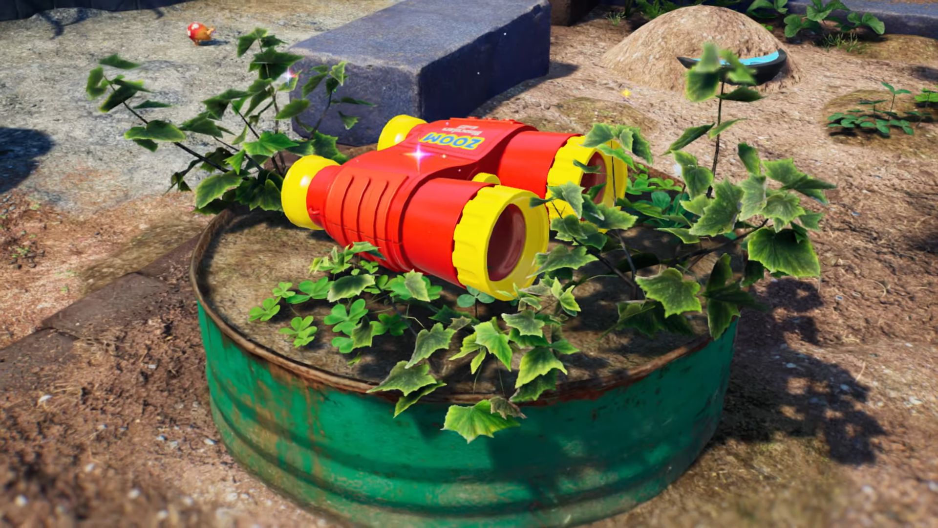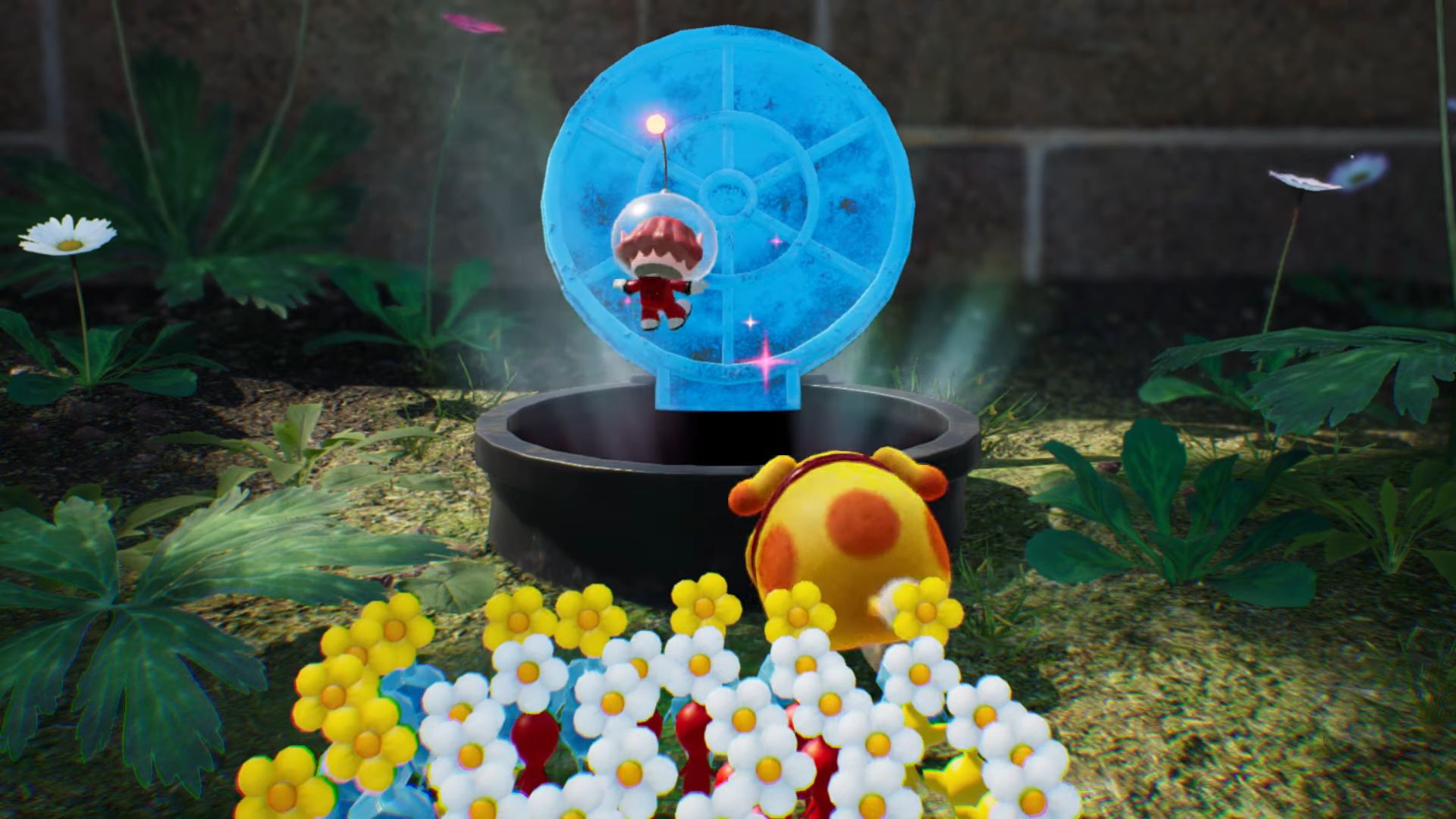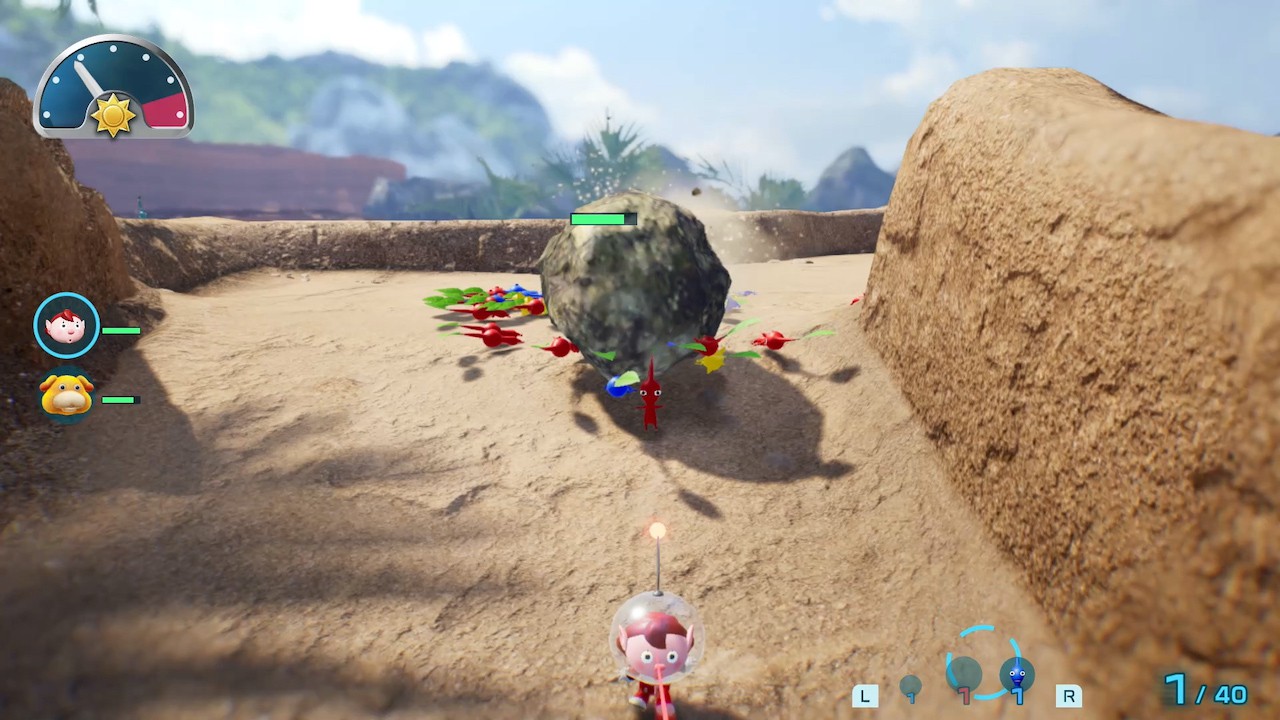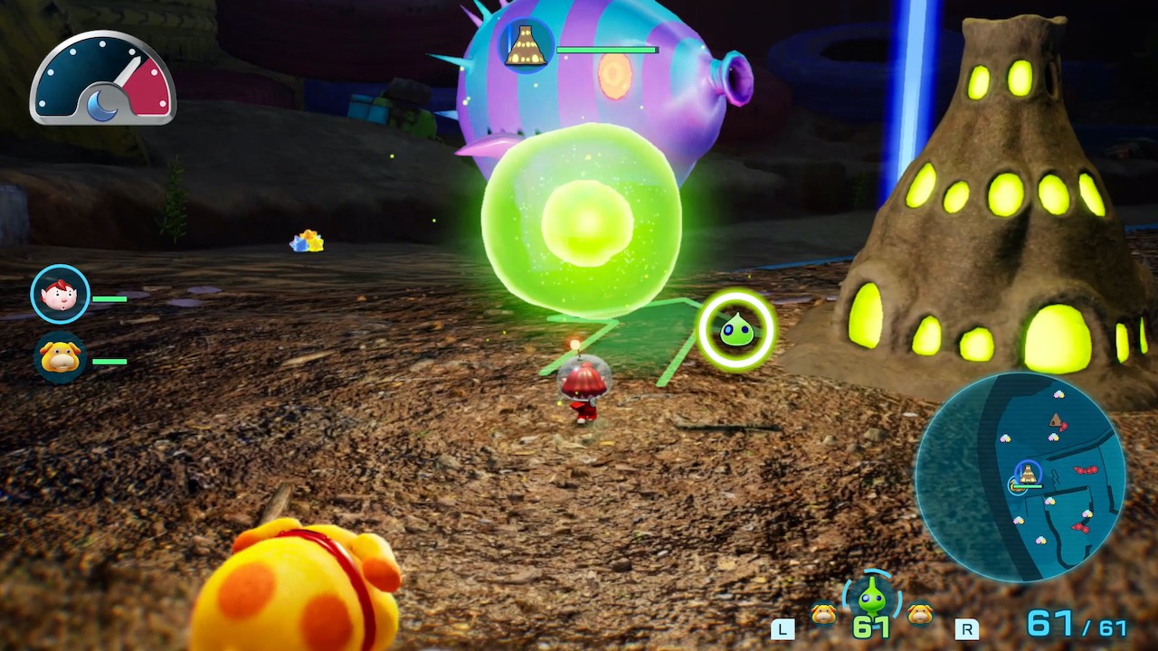 Sur le terrain, en plus des ennemis et des trésors, les secouristes de tous poils trouveront également moult obstacles, comme des barrières de glace ou d’électricité à détruire avec les Pikmin correspondants, des murs friables à attaquer sans relâche, mais aussi des murs en béton dont il faudra se défaire à l’aide de bombes-roc, des explosifs à usage unique et relativement rares dans la nature. Ce sera aussi l’occasion de partir à la recherche d’oignons, des vaisseaux-maisons dédiés aux Pikmin, dont chaque espèce est représentée par un oignon de la couleur associée. Une fois l’un d’eux amené au camp de fortune, ils peuvent donner naissance à de nouvelles pousses en échange du cadavre d’un monstre ou du palet d’une fleur (un pistil prenant la forme d’un palet et dont la somme inscrite dessus indique combien de pousses naitront de leur absorption). Un autre type d’oignon (les « tétailles »), à peine plus petit et à la couleur neutre, sert quant à lui à augmenter le nombre maximum de Pikmin pouvant nous accompagner ; la base minimale étant de trente unités, elle peut être améliorée jusqu’à cent individus.
