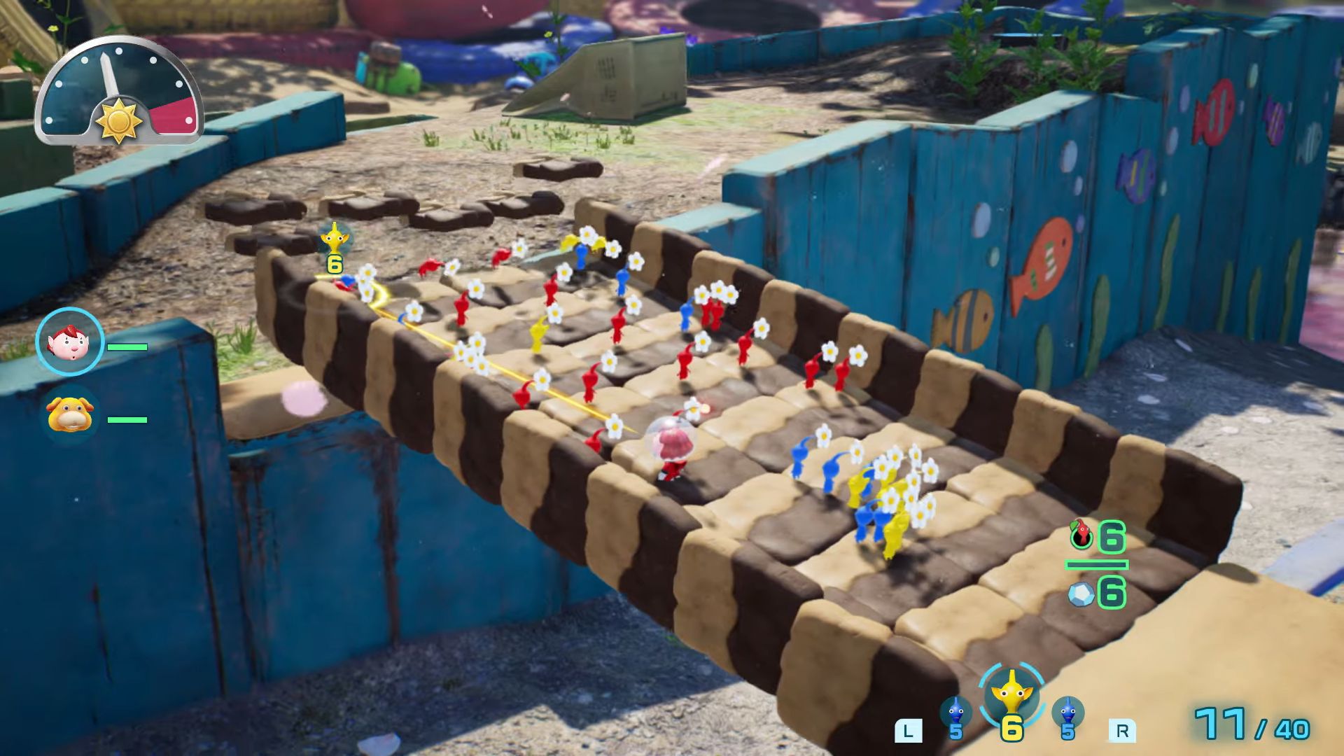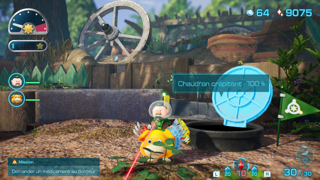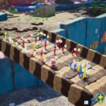 On vous en parlait justement dans notre preview, mais ces à-côtés dans le game design du titre tendent à hacher et ralentir le rythme de l’aventure, jusqu’alors un point parfait dans la série. On imagine aisément que ces mécaniques usées jusqu’à l’écœurement dans les plus gros titres du moment ont pour but de donner un sentiment de progression aux joueurs, tout en leur facilitant la tâche s’ils le désirent, mais devoir consacrer quelques minutes entre deux journées à se balader dans le hub pour améliorer ses équipements et Otchin nous a paru contre-intuitif dans un Pikmin. Là où les capacités se débloquaient avec la progression dans l’aventure et où les équipements devaient être dénichés dans la nature, Nintendo nous demande ici de sauver suffisamment de naufragés ou de récolter assez de matériaux bruts pour confectionner son matériel de survie. Problème : ces matériaux bruts sont aussi utilisés comme matériau pour construire des ponts ou des murs d’escalade pour progresser dans les aires de jeu.