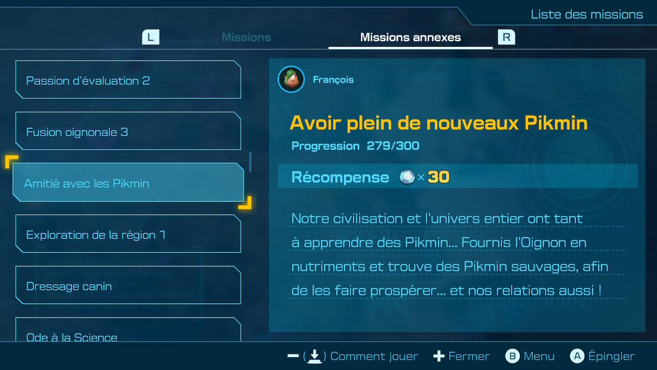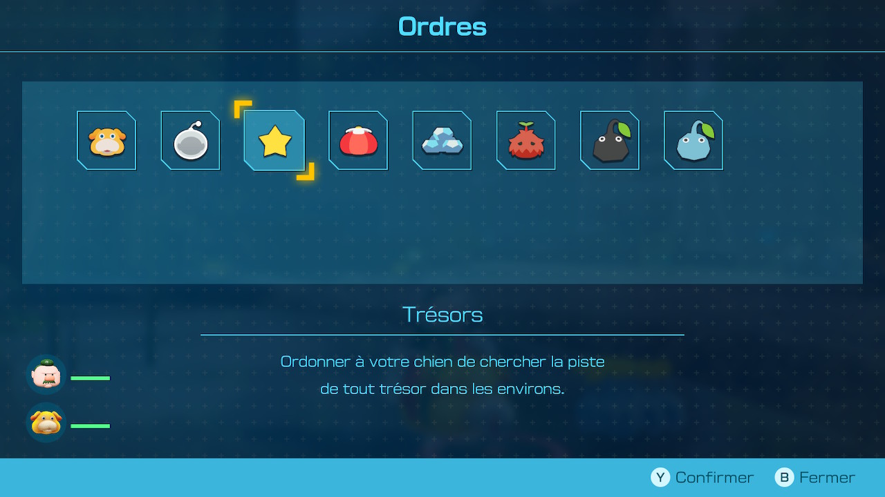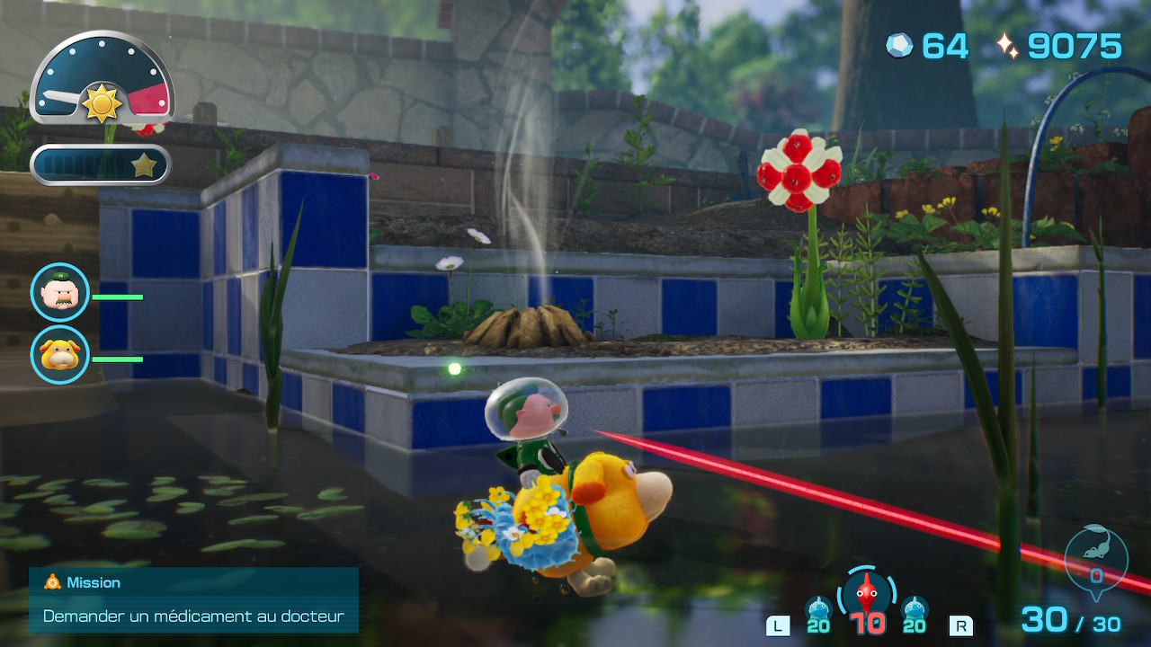 Otchin quant à lui, peut-être dressé auprès de la capitaine de l’équipage de secouristes en échange de naufragés amenés au camp. Chacun d’entre eux rapporte un point de motivation et, à la manière d’un arbre de compétences, il sera possible d’en dépenser pour améliorer les capacités de notre chien adoré : nage plus rapide, attaque plus élevée et même dans les airs ou sous l’eau, charge récupérée plus rapidement, déterrage plus efficace, résistances aux coups subis, qu’ils soient élémentaires ou non, etc. Là encore, la proposition nous parait un poil forcée et aurait pu être intégrée plus naturellement et de manière automatique au fil des sauvetages. Au lieu de cela, il faut accéder une fois de plus à des menus superflus qui tendent à segmenter le temps de jeu. Il est tout à fait possible de finir le titre sans acheter un quelconque équipement, ni améliorer notre compagnon, mais c’est assurément s’imposer un challenge supplémentaire, pour le meilleur comme pour le pire. Les naufragés sauvés seront également pourvoyeurs de quêtes annexes, parfois répétables, dont la récompense est majoritairement faite de matériaux bruts. Ces quêtes demanderont de trouver des oignons, des monstres, des trésors ou encore de faire pousser des fleurs et d’accumuler le plus de Pikmin possible.
