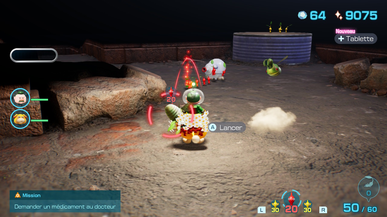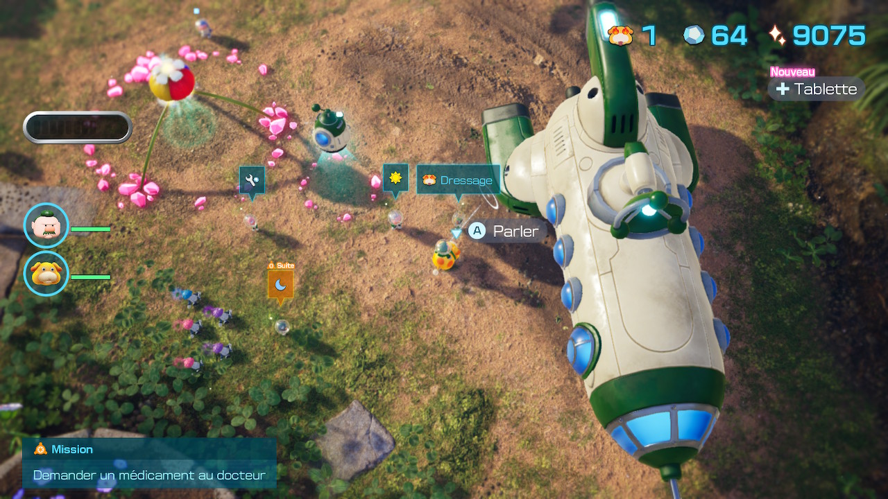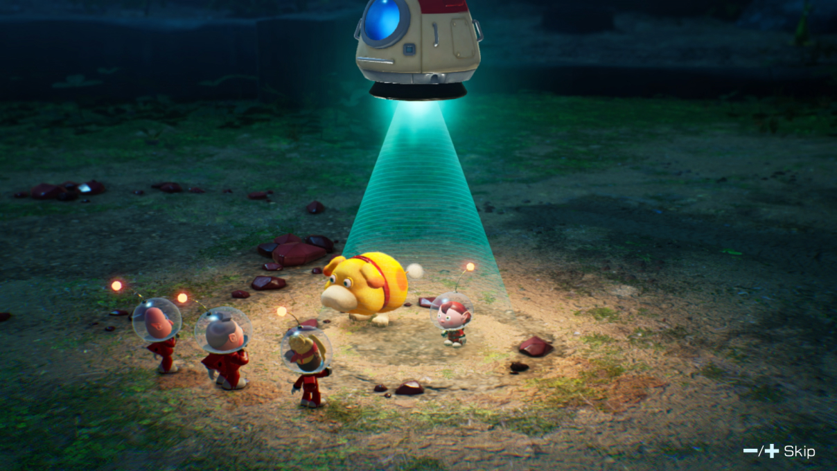 Après avoir mis la main sur les trois premiers membres de l’équipe de secouristes, dont l’adorable chien Otchin, l’heure est à la découverte du hub central. Contrairement aux précédents opus, le joueur est invité à se préparer en amont des expéditions dans un camp dont la superficie et les activités se développeront au fil de son périple. À force de sauvetages, ledit camp s’étendra pour accueillir tout un tas de nouveaux personnages, certains étant dédiés à l’amélioration du héros et d’Otchin, mais aussi donneurs de quêtes annexes. Les quêtes principales elles, demanderont de secourir Olimar, le reste de l’équipage dépêché pour sauver le capitaine du Dolphin, mais aussi de nombreux voyageurs venus sur PNF-404 pour de multiples raisons (voyages, recherches scientifiques, etc.). Il faudra également récupérer un maximum de trésors pour les convertir en Lumium, une énergie capable de redonner vie au vaisseau de l’équipe de secouristes. Une fois les lieux assimilés, il est temps de partir au secours des naufragés !