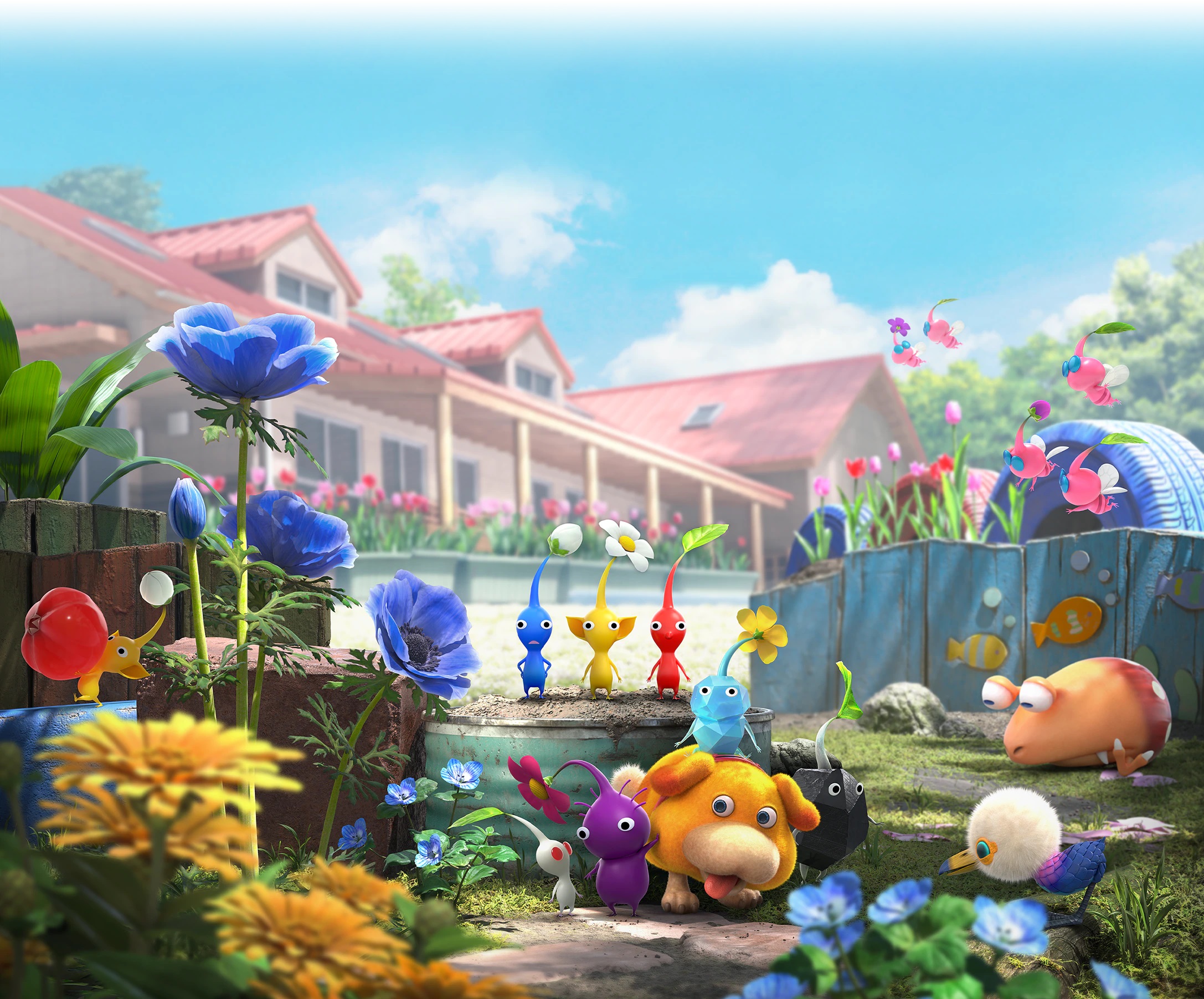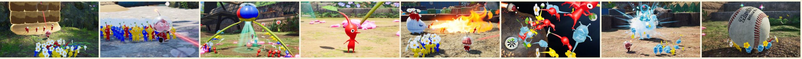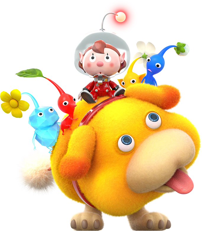 Découpés en plusieurs aires de jeu, Pikmin 4 possède davantage de zones à explorer que ses prédécesseurs. Là-bas, le joueur y fera la rencontre des Pikmin, ces petites pousses capables d’exécuter une multitude d’ordres donnés. Parmi ceux-là, il y a tout d’abord les basiques : les Pikmin rouges sont les plus efficaces au combat et résistent aux flammes, les jaunes ne craignent pas l’électricité, creusent plus vite et peuvent être envoyés plus haut de par leur faible poids, et les bleus peuvent aller sous l’eau sans craindre la noyade. Les Pikmin ailés et les Pikmin rocs issus du troisième opus sont également de retour, les premiers étant efficaces dans le combat et le transport aériens, tandis que les seconds, extrêmement résistants, infligent de lourds dégâts quand ils sont lancés sur l’ennemi, peuvent briser des obstacles en verre et en cristal, et sont insensibles aux écrasements, malgré l’impossibilité de s’accrocher à leur cible. Les Pikmin violets et blancs, quant à eux issus de Pikmin 2, ne sont trouvables que dans les souterrains ; l’espèce mauve inflige de lourds dégâts et peuvent porter jusqu’à dix fois le poids des autres Pikmin, tandis que l’espèce blanche est résistante au poison et se révèle nocive pour les monstres qui oseraient les dévorer.