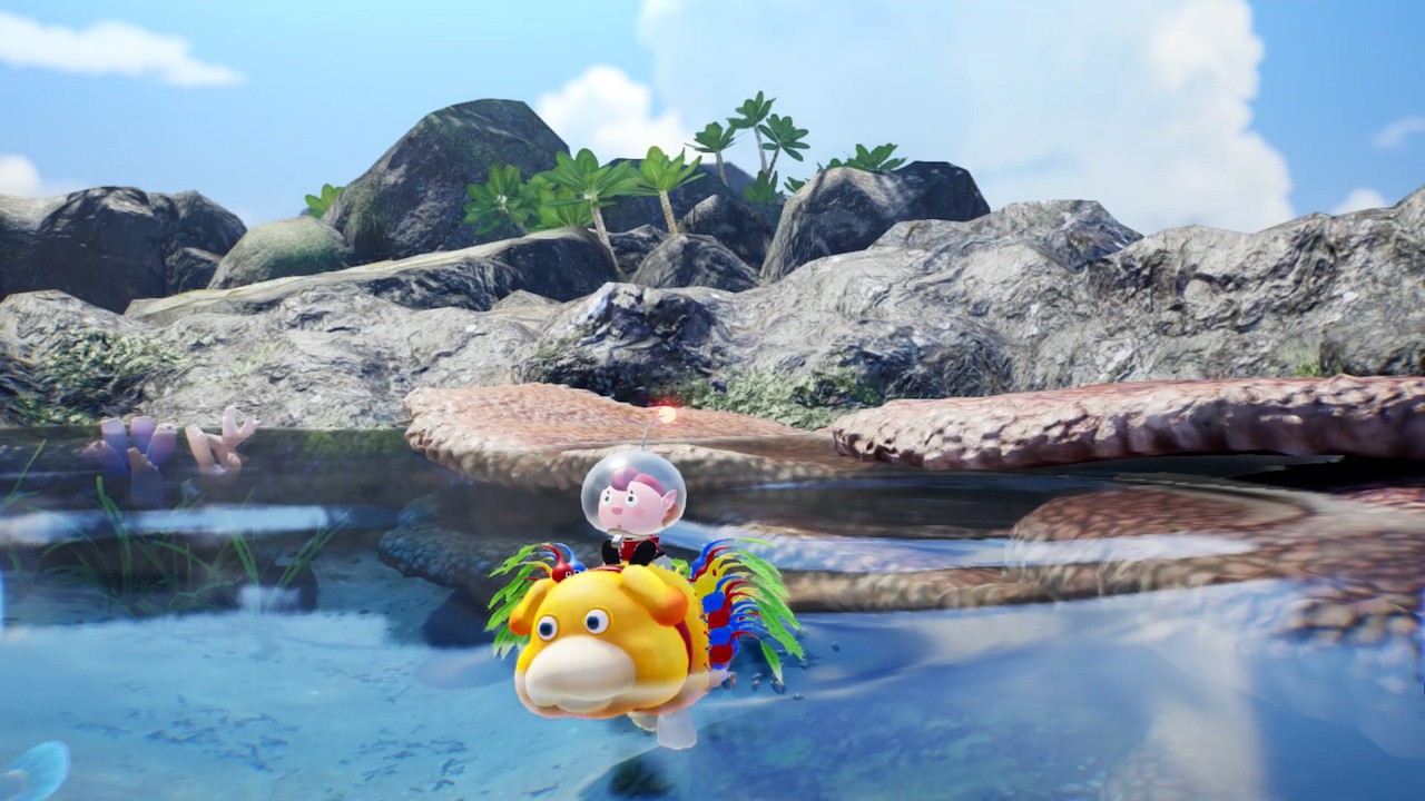 Enfin, Pikmin 4 introduit une nouvelle unité, à savoir le canidé secouriste Otchin. En plus d’être sacrément mignon, cet utile toutou peut attaquer les ennemis et obstacles, transporter des Pikmin sur son dos et des marchandises dans sa gueule, nager et creuser, pister l’odeur de trésors totalement enfouis, mais aussi rappeler les unités éloignées et se séparer de notre personnage pour mener à bien ses propres tâches. À la manière d’un capitaine de Pikmin 3, il est possible de jouer sur plusieurs fronts en même temps, malgré des manœuvres et possibilités plus réduites dans ce nouvel épisode. On imagine que cette spécificité de gameplay du troisième opus était considérée comme trop complexe pour les débutants, il n’empêche qu’on regrette un peu leur absence, à la fois pour optimiser nos déplacements et directives. Une profondeur de jeu en partie remplacée par Otchin donc, capable de réaliser tout un tas de choses à condition de le dresser efficacement.