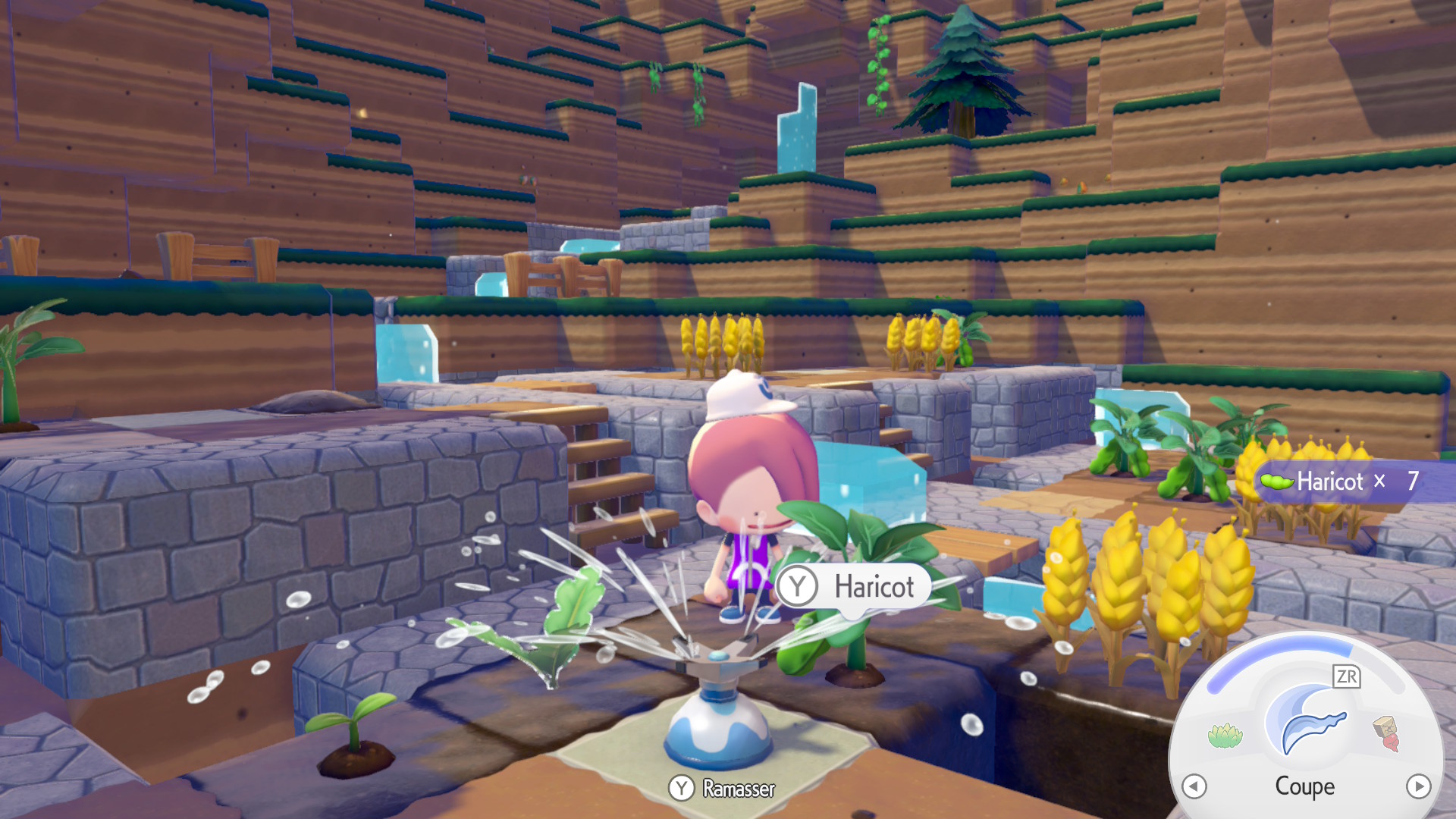 Faire réapparaître les Pokémon va notamment permettre à Métamorph d’obtenir des capacités pour reconstituer les environnements, détruire des obstacles, se déplacer plus facilement et plus encore. Les rencontres amèneront aussi les Pokémon à nous aider pour construire des bâtiments, créer des objets ou des matériaux… Par exemple, Bulbizarre offre la capacité Feuillage à Métamorph, qui lui permettra de faire pousser des hautes herbes. Mais ce n’est pas tout, le Pokémon peut également aider à faire pousser des fleurs ou des légumes plus vite. En effet, on peut demander à certains Pokémon de nous suivre pour les amener à un lieu où ils pourront utiliser leurs propres capacités, comme Salamèche qui peut allumer des feux de camp, ou encore Pohm qui peut produire de l’électricité. Dès le début, on se rend bien compte que le jeu est volontairement lent dans cette approche, car il faut toujours attendre que les Pokémon nous suivent pour les amener à un lieu d’intérêt. Certains d’entre eux se déplacent même avec une lenteur absolue, comme Ramoloss, qui accepte uniquement de se déplacer si le chemin est suffisamment bien aménagé pour lui. Si on pense que cela est volontaire, c’est aussi parce que bien d’autres éléments sont pensés de cette façon. Par exemple, lors de la construction d’une structure, il faudra toujours attendre plusieurs minutes, voire une journée entière, avant qu’elle ne s’achève. Cela pousse à faire d’autres choses, mais aussi des pauses entre chaque session.