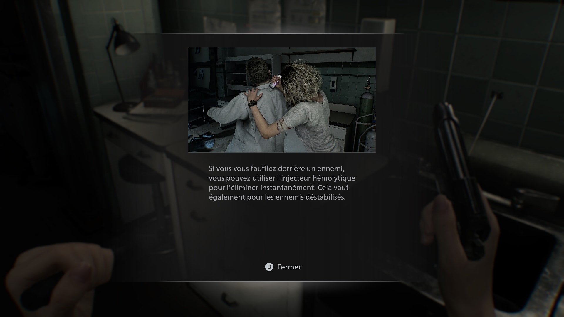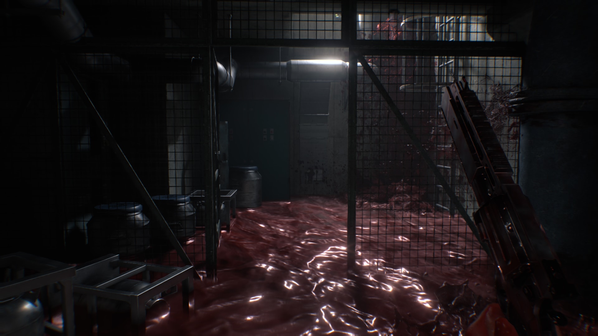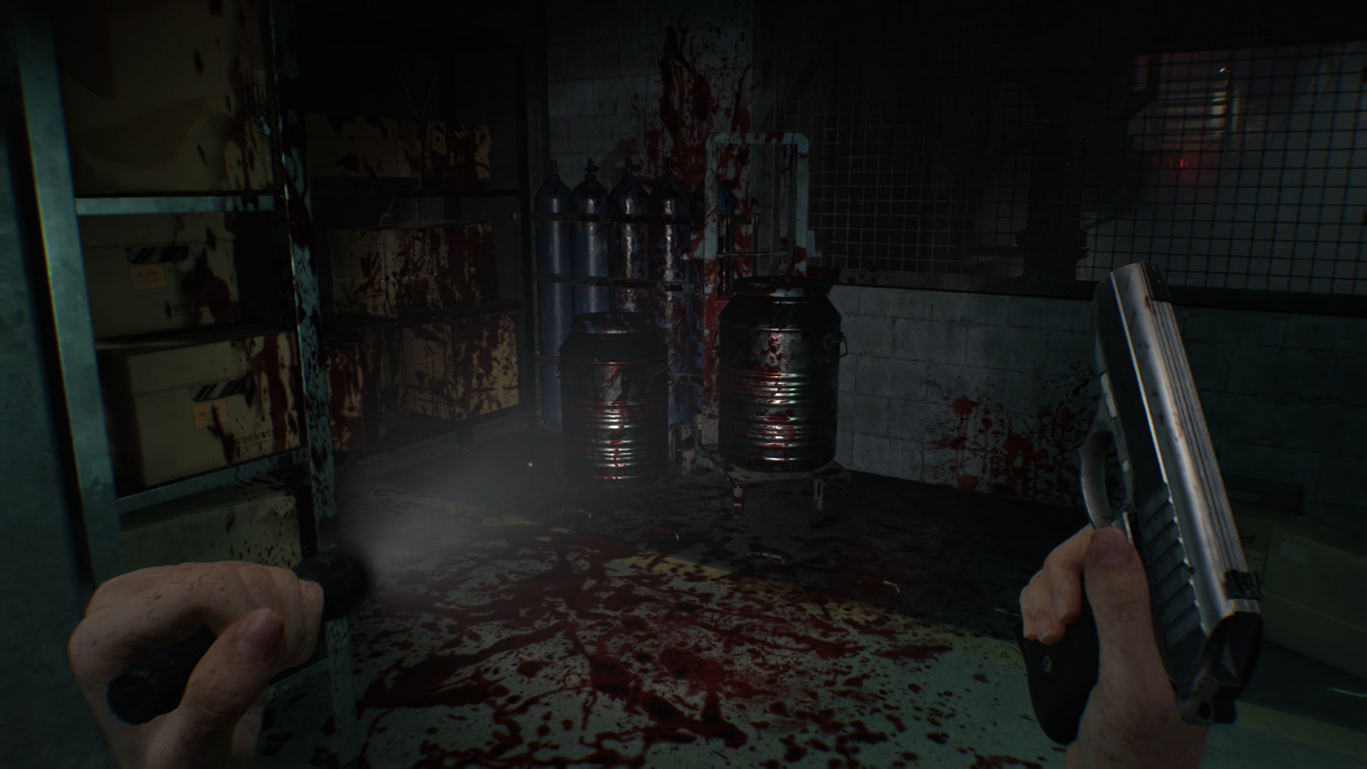 Le système de craft (création d’objet) propre à Grace repose sur un collecteur de sang particulièrement original. Ce dispositif permet de prélever du sang infecté sur les cadavres pour ensuite le combiner avec de la ferraille et créer divers objets indispensables à la survie. Cette mécanique ajoute une dimension macabre bienvenue et pousse à explorer chaque recoin pour dénicher les précieuses ressources. Il est même possible d’améliorer ses capacités de fabrication en analysant des échantillons au microscope laser, un objet que l’on trouve dans certaines zones spécifiques, mais qui reste assez anecdotique car finalement peu sollicité. Ajoutons à cela l’injecteur hémolytique, une seringue permettant d’éliminer instantanément un ennemi dans une belle explosion sanguinolente à condition d’arriver à s’en rapprocher suffisamment (par exemple en se faufilant en douce par derrière), et on obtient un arsenal de mécaniques qui transforment les phases avec Grace en véritable parcours du combattant. Chaque victoire, aussi minime soit-elle, devient alors une fierté et chaque erreur se paie cash.