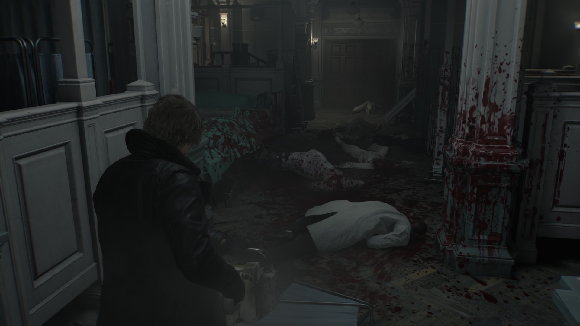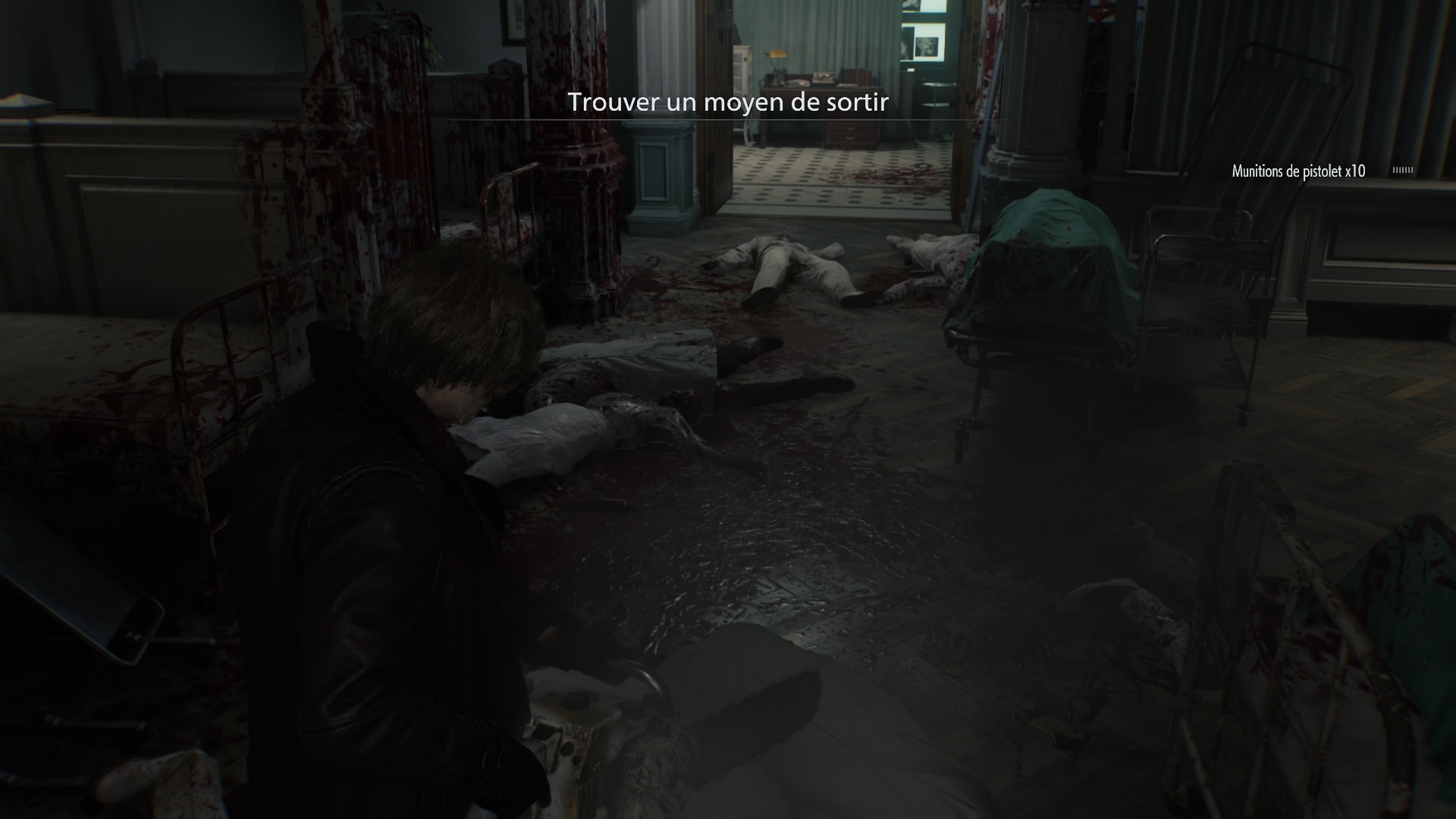 Passer de Grace à Leon, c’est comme sortir d’un cauchemar pour plonger dans un film d’action à la sauce Stallone ou Chuck Norris. La vue à la troisième personne, le large éventail d’armes disponibles, les munitions en quantité raisonnable et un inventaire plus généreux transforment radicalement l’expérience. Avec Leon, on affronte l’ennemi de face, on dégomme des hordes de créatures à tour de bras, on explose des tonneaux, on balance des grenades, on décoche des high kicks dans la tronche et on ramasse des tronçonneuses pour découper en deux tout un tas de saloperies. Bref, le jeu devient un défouloir jouissif où les corps explosent, les membres se détachent et les viscères giclent dans tous les sens, composant un ballet gore d’une rare intensité. Capcom a poussé ici le curseur de la violence graphique à son maximum, et chaque élimination transforme les décors en une véritable boucherie. Un zombie qui explose, tapissera par exemple définitivement la pièce de sang et d’entrailles, créant un effet visuel aussi saisissant qu’horrifique. Les environnements portent alors durablement les traces de nos carnages, mais cette débauche de brutalité, loin d’être gratuite, participe pleinement à l’ambiance oppressante du jeu. On ne tue pas proprement dans Resident Evil Requiem : on massacre, on mutile, on découpe. C’est brutal, c’est dérangeant et c’est exactement ce qu’on attend d’un Resident Evil qui revendique son PEGI 18.
