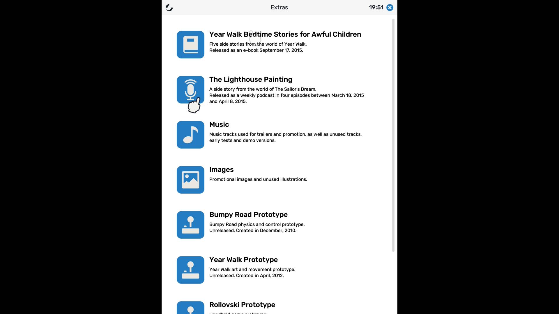 Cette compilation se veut être une sorte de vitrine ouverte sur les premières années de Simogo et inclut, en plus des jeux historiques, un contenu bonus riche et complet, tiré des archives du studio. On y trouve, tout d’abord, un recueil de nouvelles et de contes populaires, inspirés par le folklore suédois et par l’ouvrage Der Struwwelpeter (Pierre l’Ébouriffé) de l’Allemand Heinrich Hoffmann, qui proposait une suite d’histoires humoristiques cachant des leçons de morale pour les enfants. Ce livre numérique, intitulé Year Walk Bedtime Stories for Awful Children (Year Walk Contes du Soir pour Vilains Enfants), accumule les histoires conçues pour hanter les morveux et leurs parents, en revisitant toutes les créatures de Year Walk avec des illustrations de Johanna Meijer.