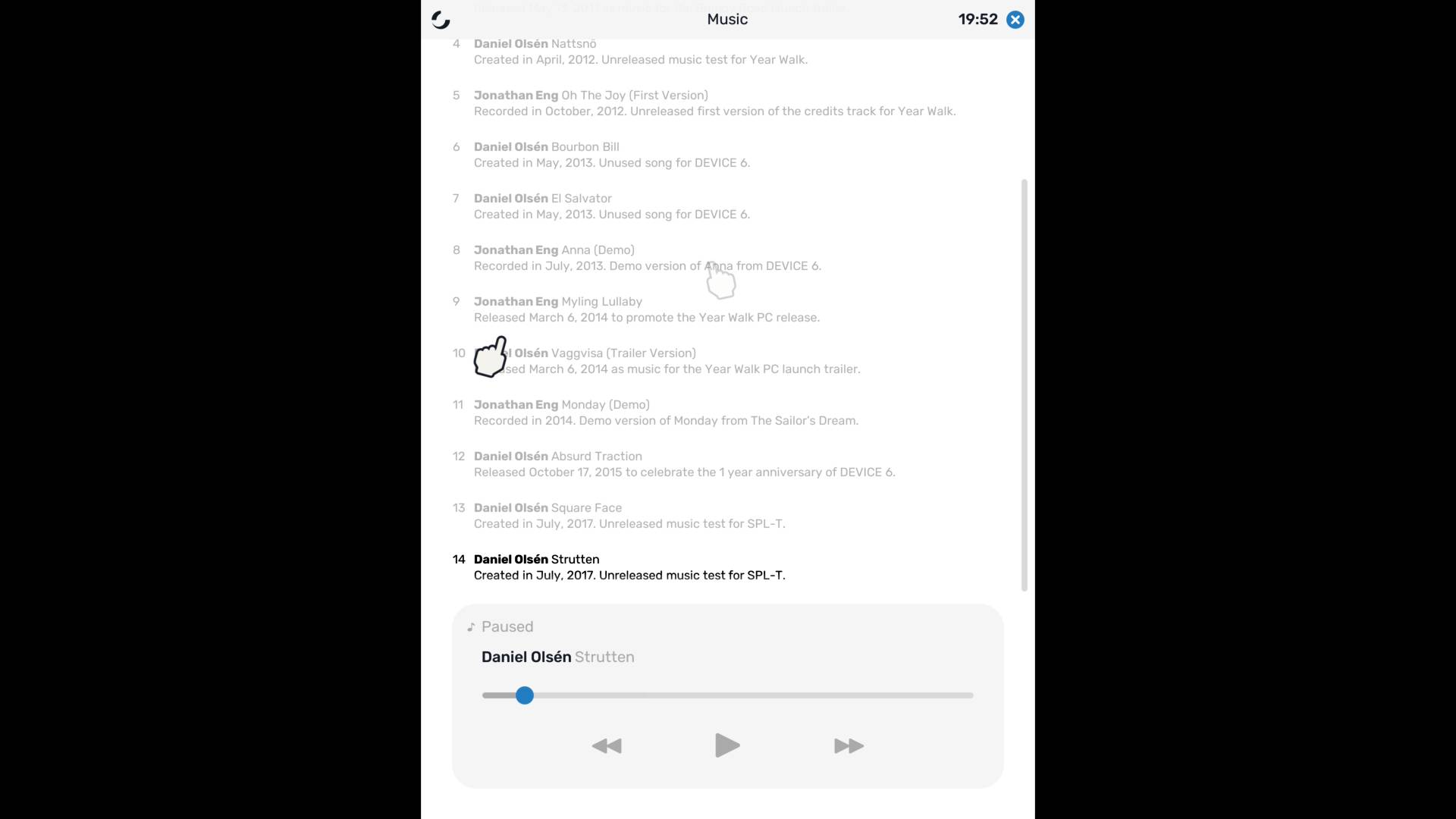 Outre des pistes audio de morceaux issus de l’histoire du studio et de ses différents jeux, incluant même des sons inédits, ainsi que des illustrations extraites des archives de Simogo, cette collection propose les prototypes jouables de Year Walk et de Bumpy Road, deux jeux de la collection. Mais elle intègre aussi celui de Rollovski. En développement juste après Beat Sneak Bandit en 2012, et destiné à l’origine à la Nintendo 3DS, le titre exploitait spécifiquement le Pad circulaire et l’affichage stéréoscopique pour simuler un mouvement physique en 3D. Rollovski se présente comme un jeu d’infiltration mettant en vedette un détective rond et sans membres qui navigue dans un hôtel aux pièces circulaires, au sein d’un univers proche des précédents titres du studio. La mécanique centrale repose sur le contrôle de l’environnement physique du jeu, plutôt que du personnage, lui permettant de rouler entre les surfaces superposées. Bien que le concept n’ait jamais été finalisé, une version très basique, sans son, fut créée pour PC et Mac en moins de deux semaines pour en démontrer les idées principales. Un acte manqué, cet avant-goût était pourtant très prometteur.