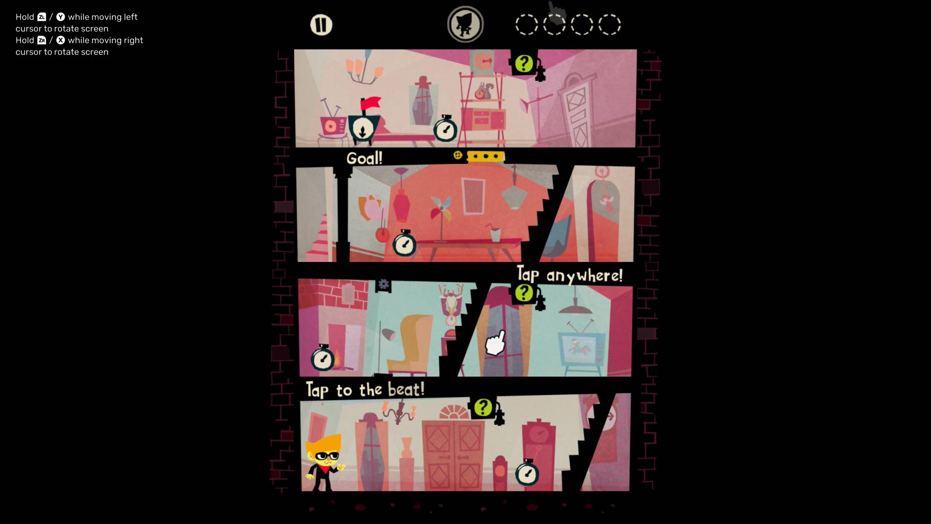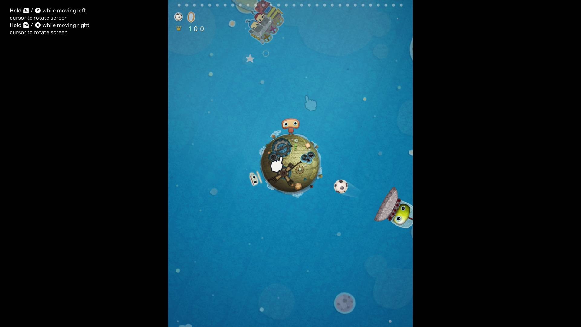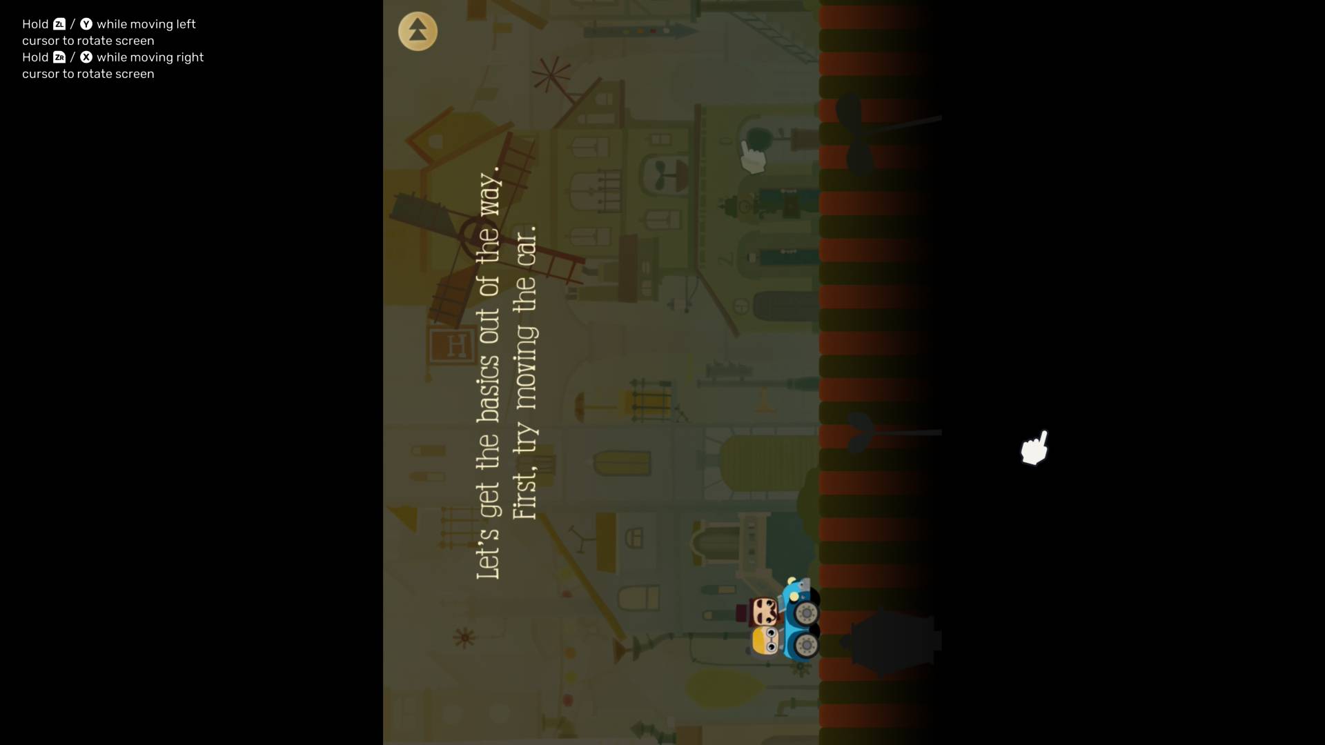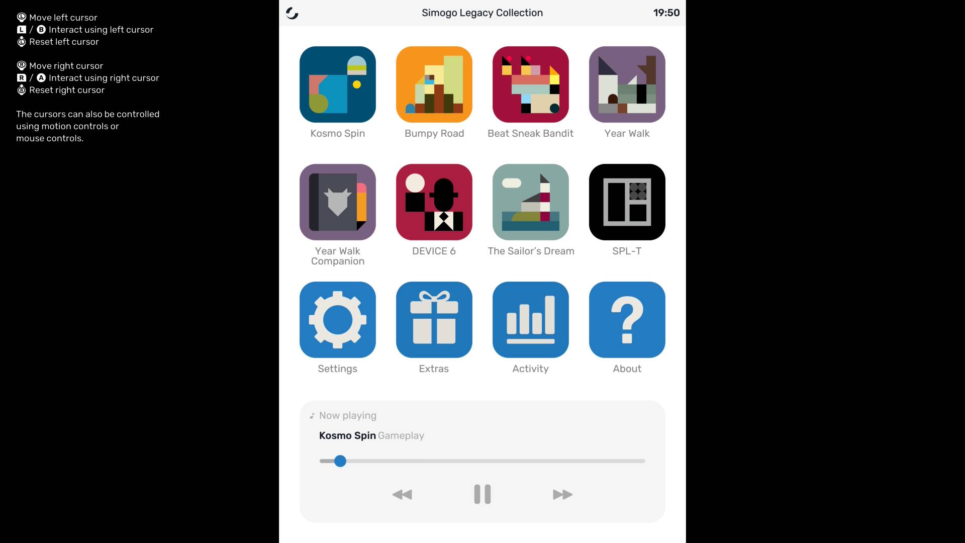 Simogo s’est ici donné pour défi de reproduire fidèlement l’expérience mobile originale, tout en adaptant les jeux au format hybride de la Switch/Switch 2. En résulte un système de contrôle unifié, en mode portable, identique à l’utilisation d’un téléphone ou d’une tablette, un appareil virtuel proposant de tenir la console à la verticale, ou à l’horizontale, et d’utiliser exclusivement l’écran tactile avec ses capacités multitouch. Il est cependant tout à fait possible de vivre l’expérience sur TV, les contrôles tactiles sont ainsi remplacés par les commandes aux Joy-Con, profitant de la gyroscopie. Pour simuler les fonctionnalités multitouch indispensables à certains jeux, Simogo a imaginé un système à deux curseurs un peu bancals, correspondant chacun à un Joy-Con, ou aux deux sticks d’une manette Pro. On ne va pas se mentir, c’est loin d’être la meilleure configuration pour profiter de l’ensemble des titres, avec une utilisation assez lourde des manettes à côté du réflexe naturel sur un écran tactile.