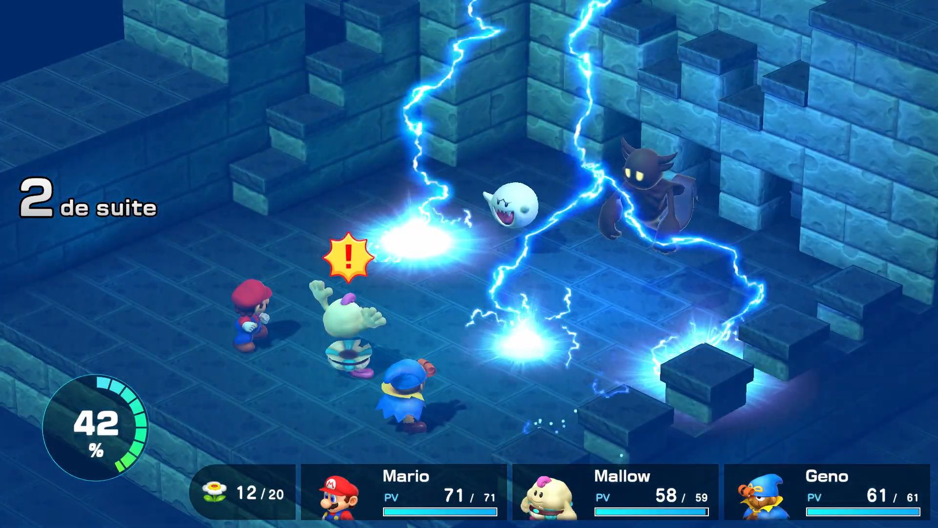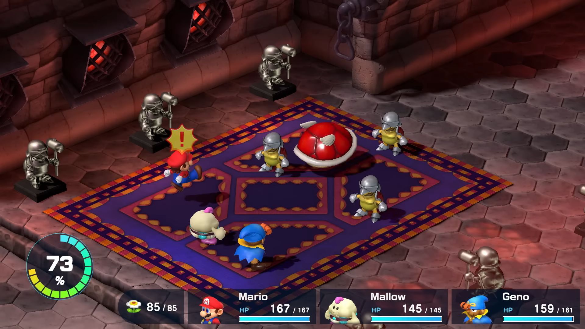 Une mécanique de jeu qui n’est pas sans rappeler les Mario & Luigi, puisqu’il s’agit là de l’inspiration des titres de feu AlphaDream. Contrairement au jeu original, le remake de Super Mario RPG indique la fenêtre d’action à l’aide d’un point d’exclamation bien visible, facilitant l’entreprise bien qu’il faille posséder des réflexes aiguisés. Si les attaques et gardes parfaites sont évidemment le point névralgique du titre, la version remise au goût du jour y incorpore également une nouveauté de taille : la jauge d’action. Celle-ci se remplit à chaque action coordonnée, parfaite ou non, le gain engrangé devenant de plus en plus important selon la justesse du timing et la durée de la chaine. Plus elle est longue, plus elle confère de bonus à l’équipe, comme une augmentation de la vitesse, de l’attaque ou de la défense magique ; un critère dépendant de la composition du groupe actif. Mieux encore : à 100 %, le joueur peut activer une « attaque trio » aux effets surpuissants et dont la nature varie selon les membres sur le terrain.