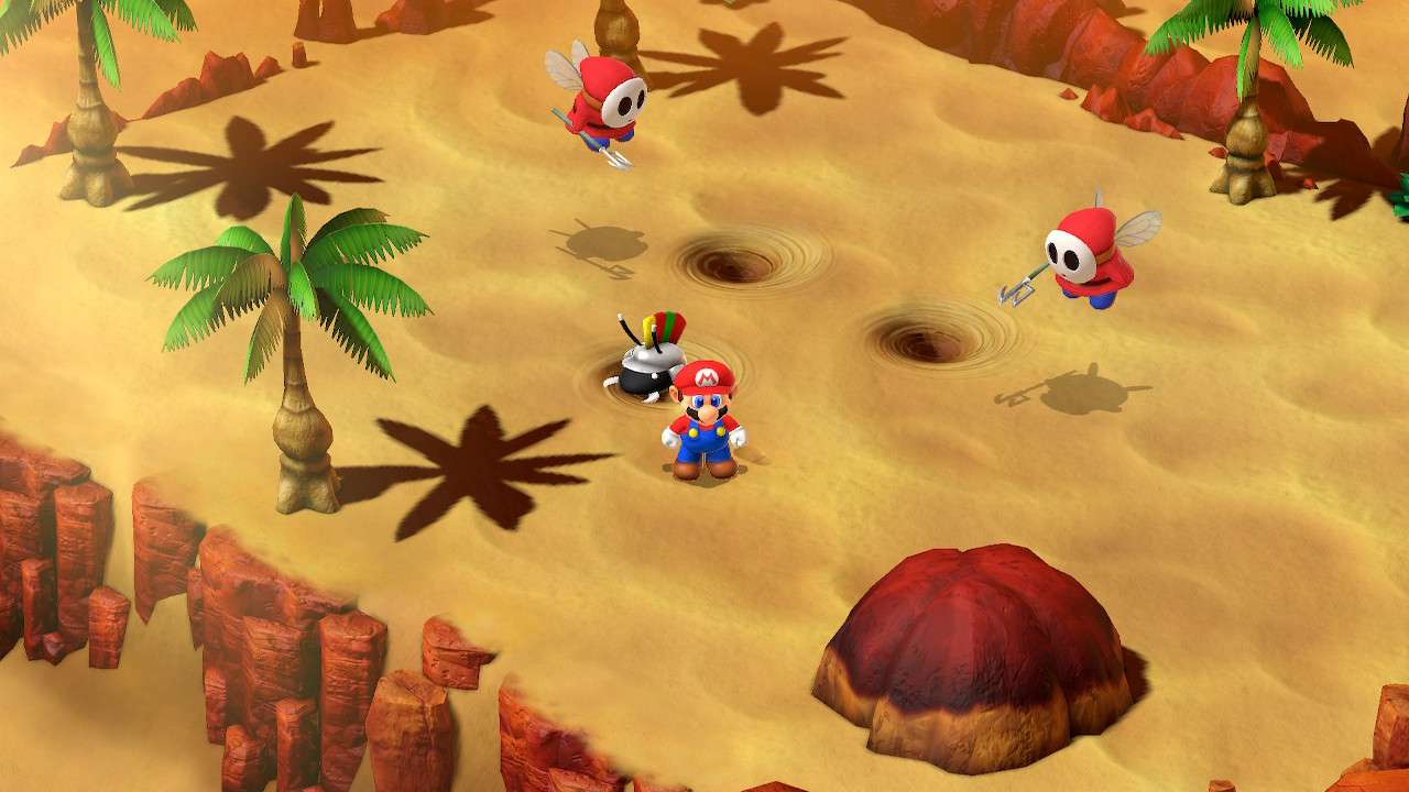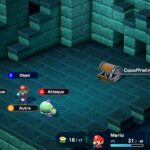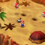 Sur leur route, Mario et ses amis viendront en aide à de nombreux personnages hauts en couleur, mais devront également se défaire d’ennemis en tous genres. Nouveauté là aussi propre au remake, un compendium dédié au bestiaire fait son apparition ; pour le remplir, il ne faut pas seulement croiser la créature, mais aussi utiliser la capacité « Mentaliste » du nuageux Mallow, laquelle révèle faiblesses élémentaires et points de vie du monstre en question. Les combats s’y déroulent au tour par tour, mais demanderont au joueur de réaliser des actions en temps réel. Après avoir choisi une technique ou une attaque, il faut en effet appuyer sur une touche en rythme avec l’animation du coup choisi. Selon la justesse du timing, la puissance des dégâts infligés peut grandement augmenter, mais également étendre une partie de l’attaque aux autres ennemis ; c’est ce que l’on appelle une action coordonnée. De même pour la défense, il suffit de presser le bon bouton au bon moment pour réduire, voire nullifier, les dégâts reçus.