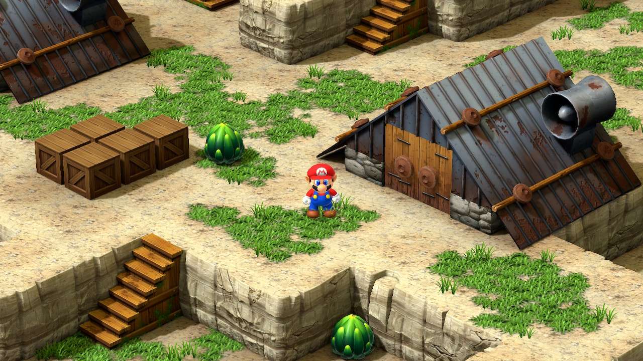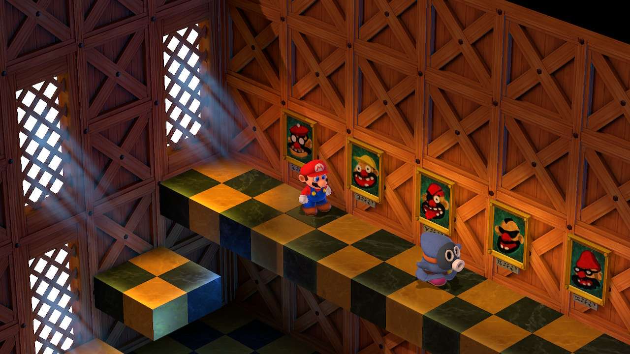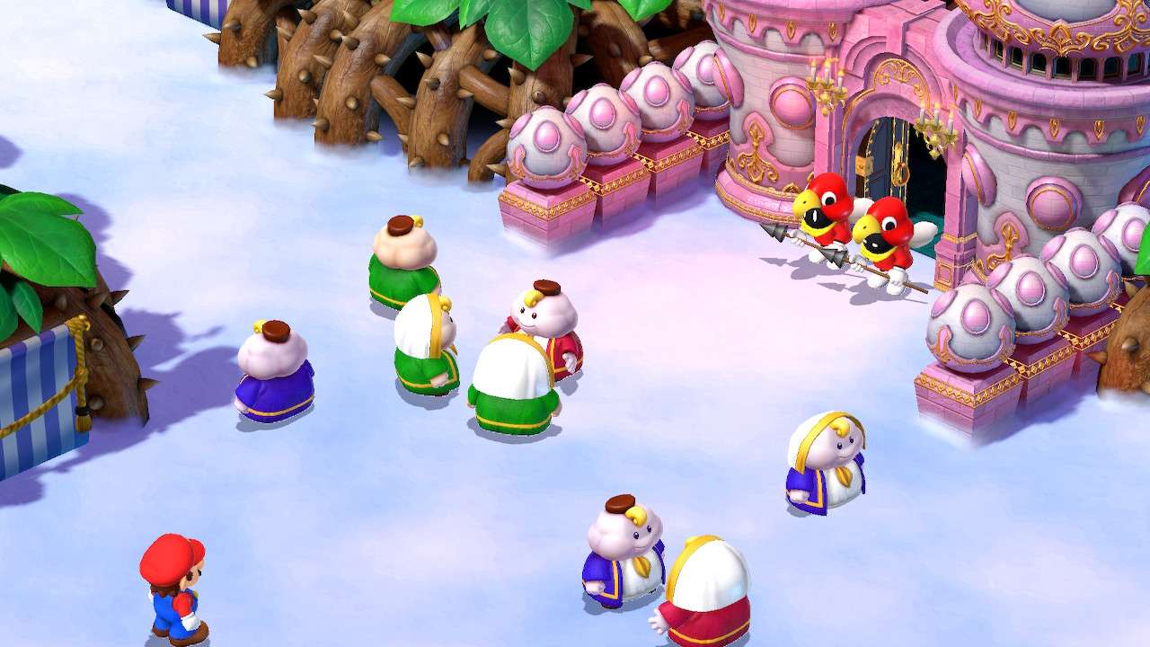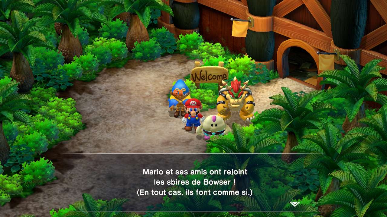 Quelques dialogues ici et là ont été modifiés dans leur esprit, comme une scène où Mario est déguisé en statue, alors présenté par son artiste comme un personnage triste ; Super Mario RPG préfère adoucir cette scène et l’expose désormais comme une figure résolue et forte. Rien de gênant dans les faits et même plutôt raccord avec la vision moderne souhaitée par Nintendo vis-à-vis de la licence et de son héros. Bien que le scénario n’ait jamais été le focus principal d’un titre Mario, même lorsqu’il s’essaie au jeu de rôles, Super Mario RPG peine à susciter notre intérêt. Mélange raté entre le monde de Mario et de l’heroic fantasy, l’univers manque cruellement de liant, tandis que ses nouvelles figures ne parviennent pas à se montrer suffisamment intéressantes pour développer chez le joueur une attache particulière. Si Mallow possède bel et bien une quête personnelle et un développement tangible, Geno lui, parait fade et trop peu intégré au reste du groupe. Finalement, c’est davantage du côté des personnages déjà existants que l’on se plait à suivre et découvrir de nouveaux pans de leur personnalité, à l’image d’un Bowser pleurnichard et soucieux de son image ou d’une princesse Peach enfin désireuse de passer à l’action.