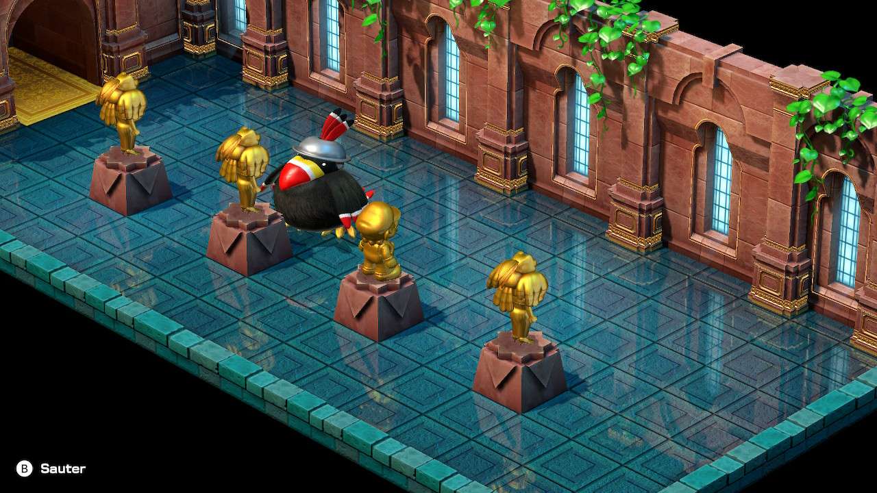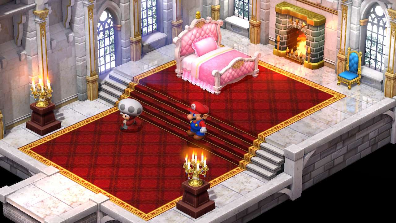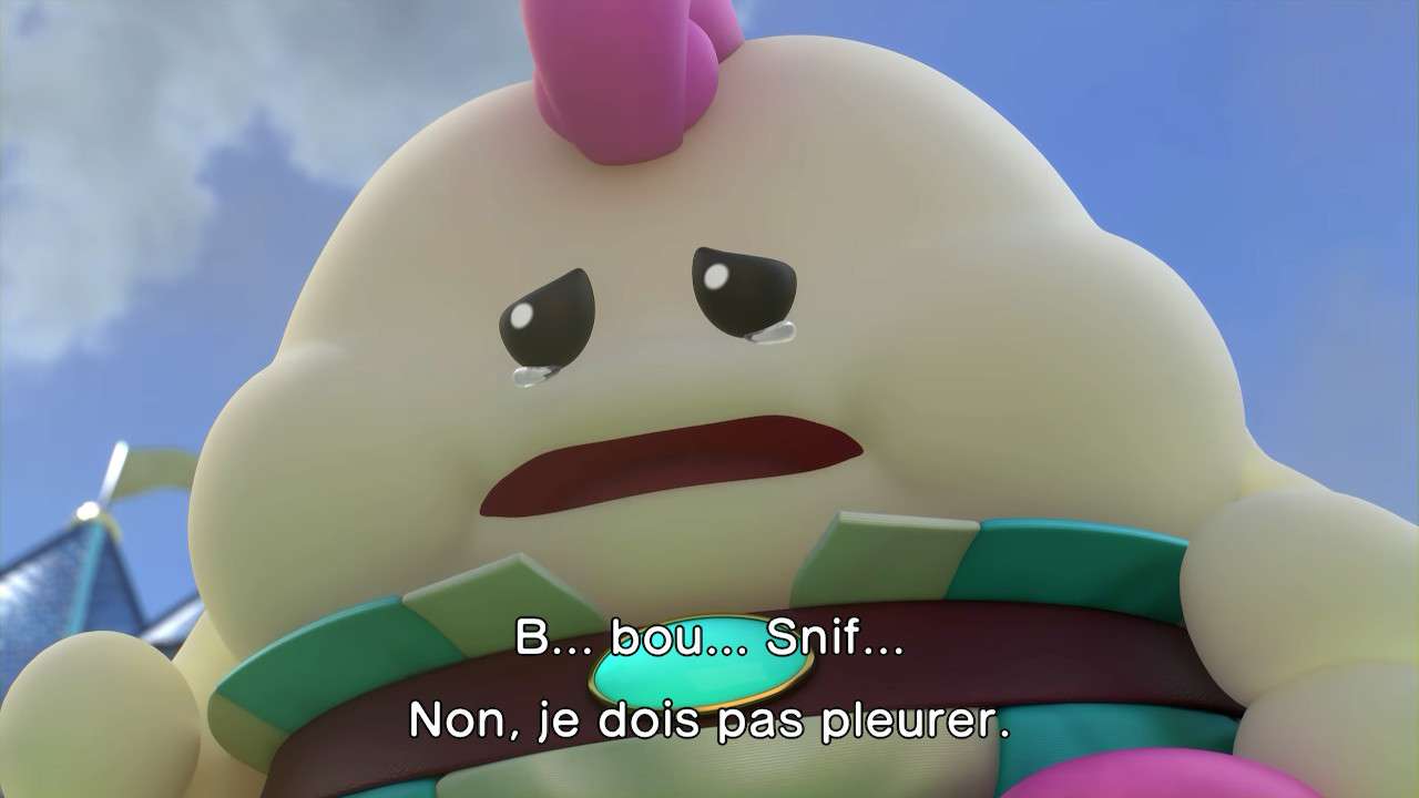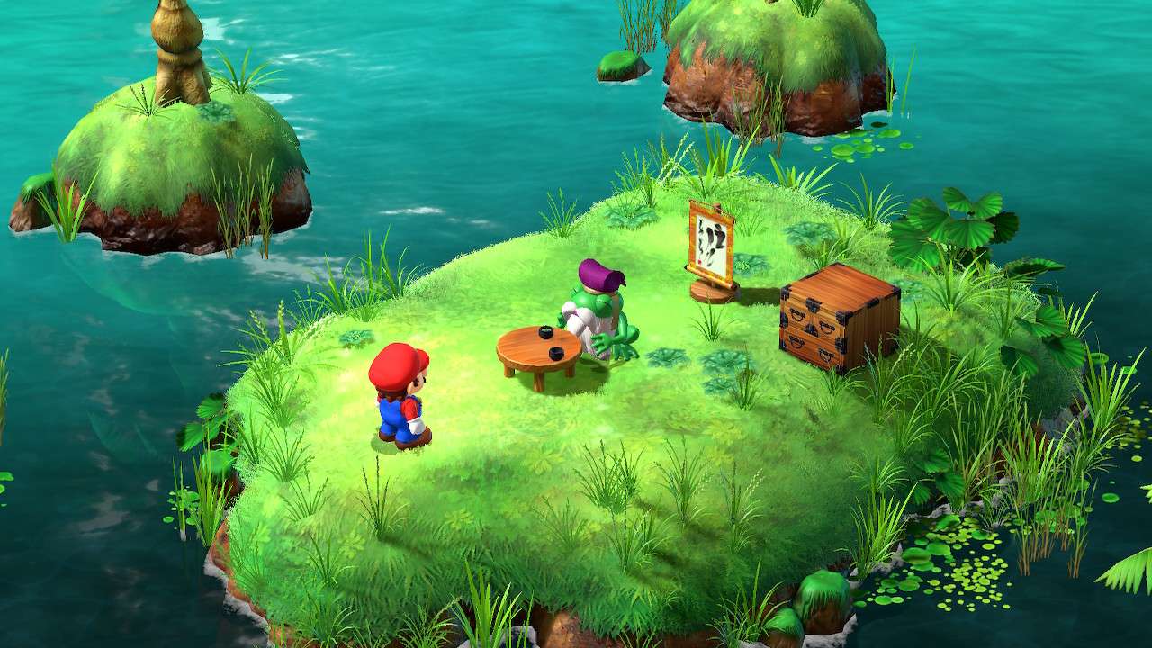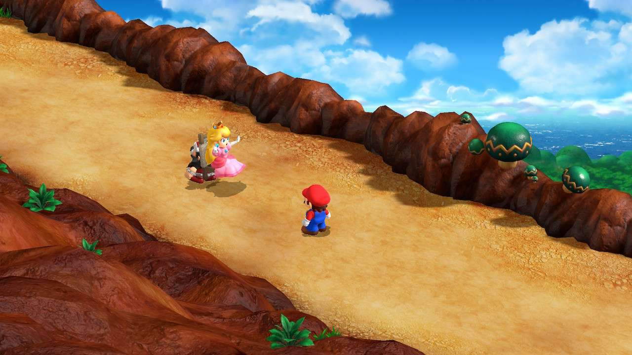 Quelques dialogues ici et là ont été modifiés dans leur esprit, comme une scène où Mario est déguisé en statue, alors présenté par son artiste comme un personnage triste ; Super Mario RPG préfère adoucir cette scène et l’expose désormais comme une figure résolue et forte. Rien de gênant dans les faits et même plutôt raccord avec la vision moderne souhaitée par Nintendo vis-à-vis de la licence et de son héros. Bien que le scénario n’ait jamais été le focus principal d’un titre Mario, même lorsqu’il s’essaie au jeu de rôles, Super Mario RPG peine à susciter notre intérêt. Mélange raté entre le monde de Mario et de l’heroic fantasy, l’univers manque cruellement de liant, tandis que ses nouvelles figures ne parviennent pas à se montrer suffisamment intéressantes pour développer chez le joueur une attache particulière. Si Mallow possède bel et bien une quête personnelle et un développement tangible, Geno lui, parait fade et trop peu intégré au reste du groupe. Finalement, c’est davantage du côté des personnages déjà existants que l’on se plait à suivre et découvrir de nouveaux pans de leur personnalité, à l’image d’un Bowser pleurnichard et soucieux de son image ou d’une princesse Peach enfin désireuse de passer à l’action.