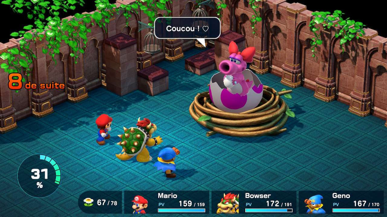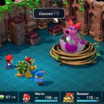 Chaque attaque trio possède une cinématique qui lui est propre, toutes étant particulièrement réussies et plaisantes à visionner ; pour les plus pressés ou ceux qui parviennent à recharger la jauge d’action rapidement, il est possible de passer lesdites cinématiques à l’aide d’un bouton. Côté personnages, Mario est un personnage équilibré, possédant des techniques de feu et de saut. Mallow peut soigner une cible unique, mais aussi et surtout user de compétences liées à la foudre et la glace. Geno est un personnage rapide et dont les dégâts sont importants. Bowser est résistant et fort, mais dont la vitesse et la magie sont faiblardes, capable d’utiliser des techniques d’empoisonnement et d’effroi. Peach quant à elle, est davantage orienté soutien avec ses soins, sa capacité de faire revivre un allié tombé au combat, mais aussi d’annuler les altérations d’état du groupe comme le poison, la peur, la transformation ou le silence.