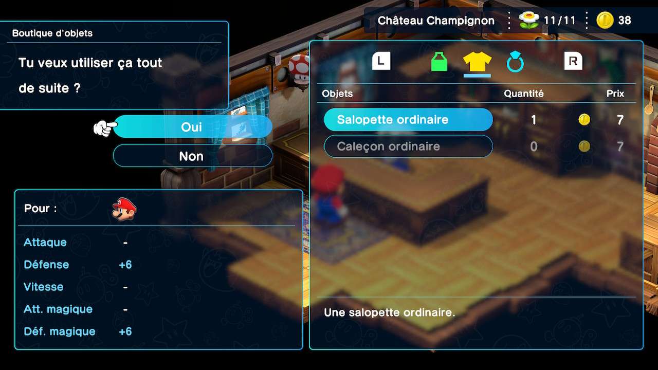 Il y a bien la carotte de la progression des personnages, laquelle peut pousser les plus déterminés à enchaîner les affrontements, mais là aussi la personnalisation du groupe reste somme toute sommaire. À chaque passage de niveau, Mario et ses amis proposent au joueur d’augmenter un groupe de caractéristiques parmi trois : l’attaque et la défense, les points de vie ou l’attaque magique et la défense magique. Côté équipements ce n’est guère mieux, en attestent les trois pauvres emplacements dédiés à l’arme du personnage, son armure et son accessoire. À la manière des Final Fantasy de l’époque, chaque nouvelle boutique n’offre qu’un type d’équipement à acheter pour chaque héros, généralement meilleur que celui alors porté par le joueur. Finalement, seule la gestion du système de mana – représentée par les Points Fleur – parait intéressante. Nécessaires pour lancer une technique, les Points Fleurs peuvent être augmentés en trouvant des objets précis et en les consommant. Surtout, le groupe se partage l’entièreté de la jauge, demandant alors une certaine réflexion quant à leur utilisation optimale.