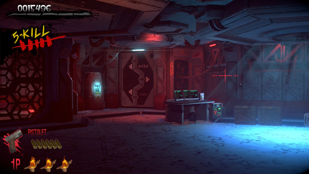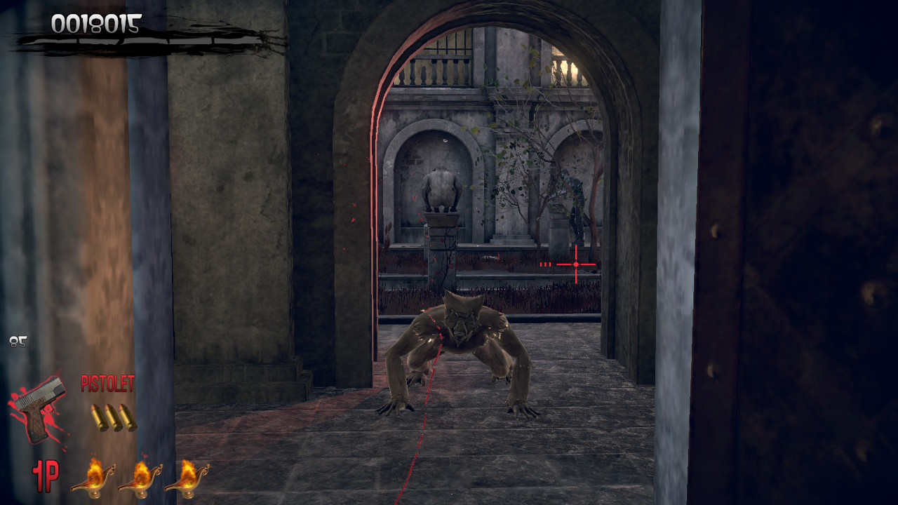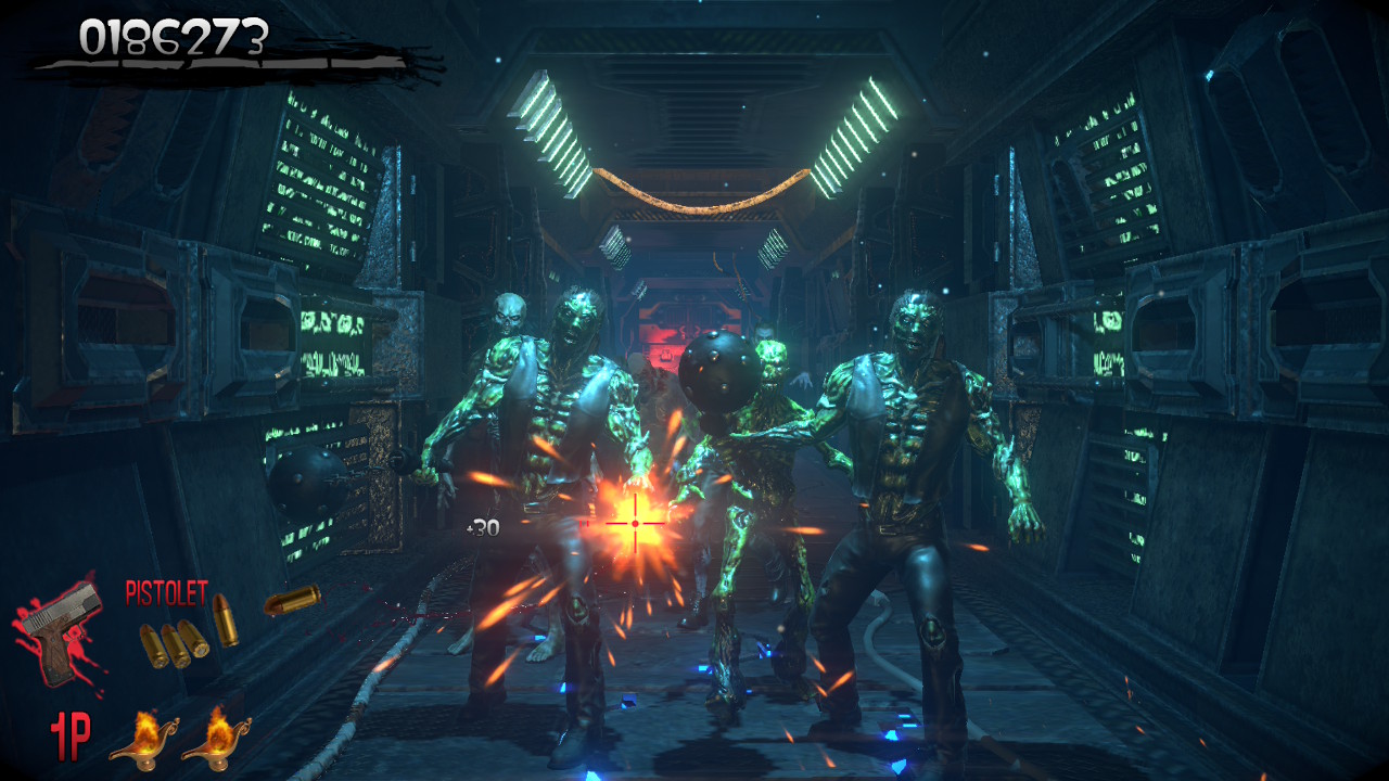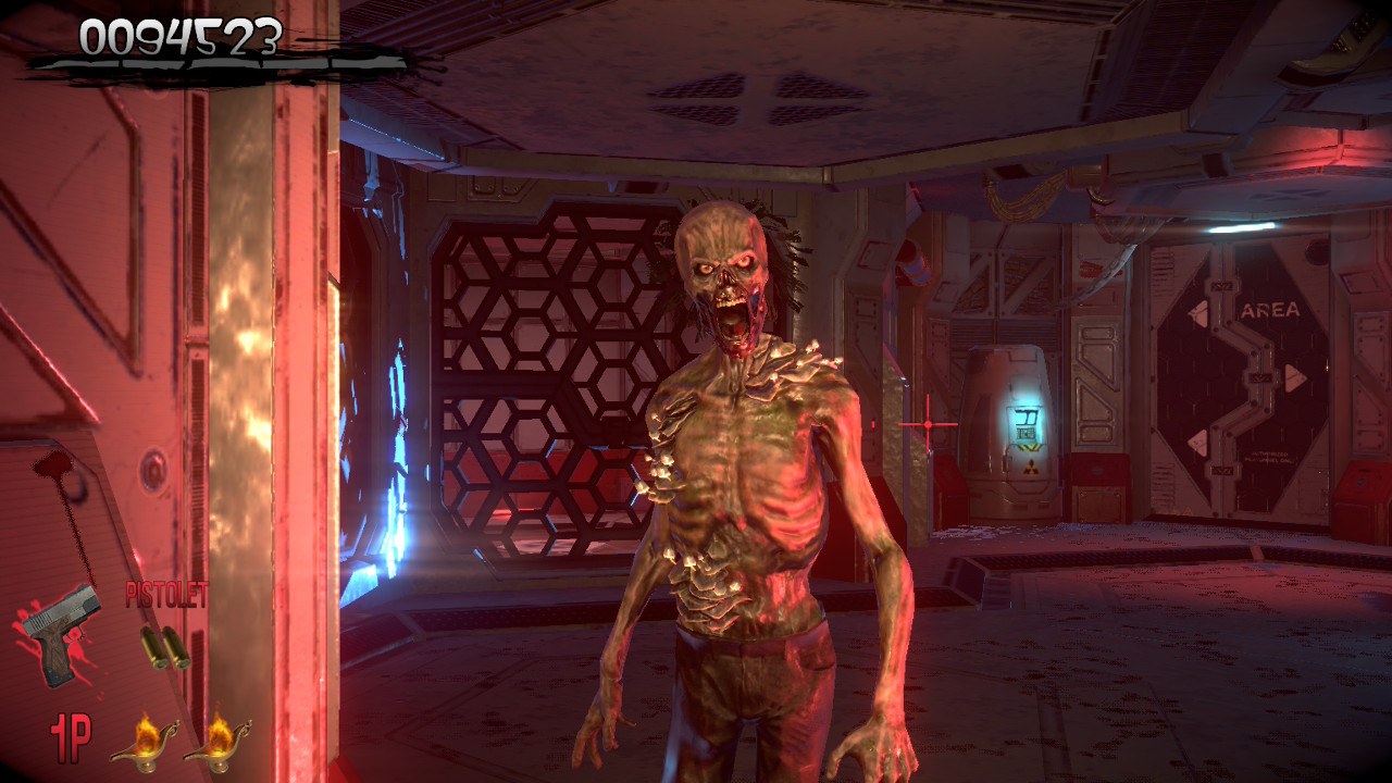 Côté scénario, il ne faut pas s’attendre à des miracles : on incarne Thomas Rogan ou l’agent G au choix, chargés d’explorer un manoir où le professeur Curien mène de sordides expériences. Sans surprise, le domaine grouille de zombies et de créatures mutantes qu’il faudra réduire en charpie. Rien de plus qu’un prétexte aux fusillades, mais c’est tout l’esprit arcade de l’époque.