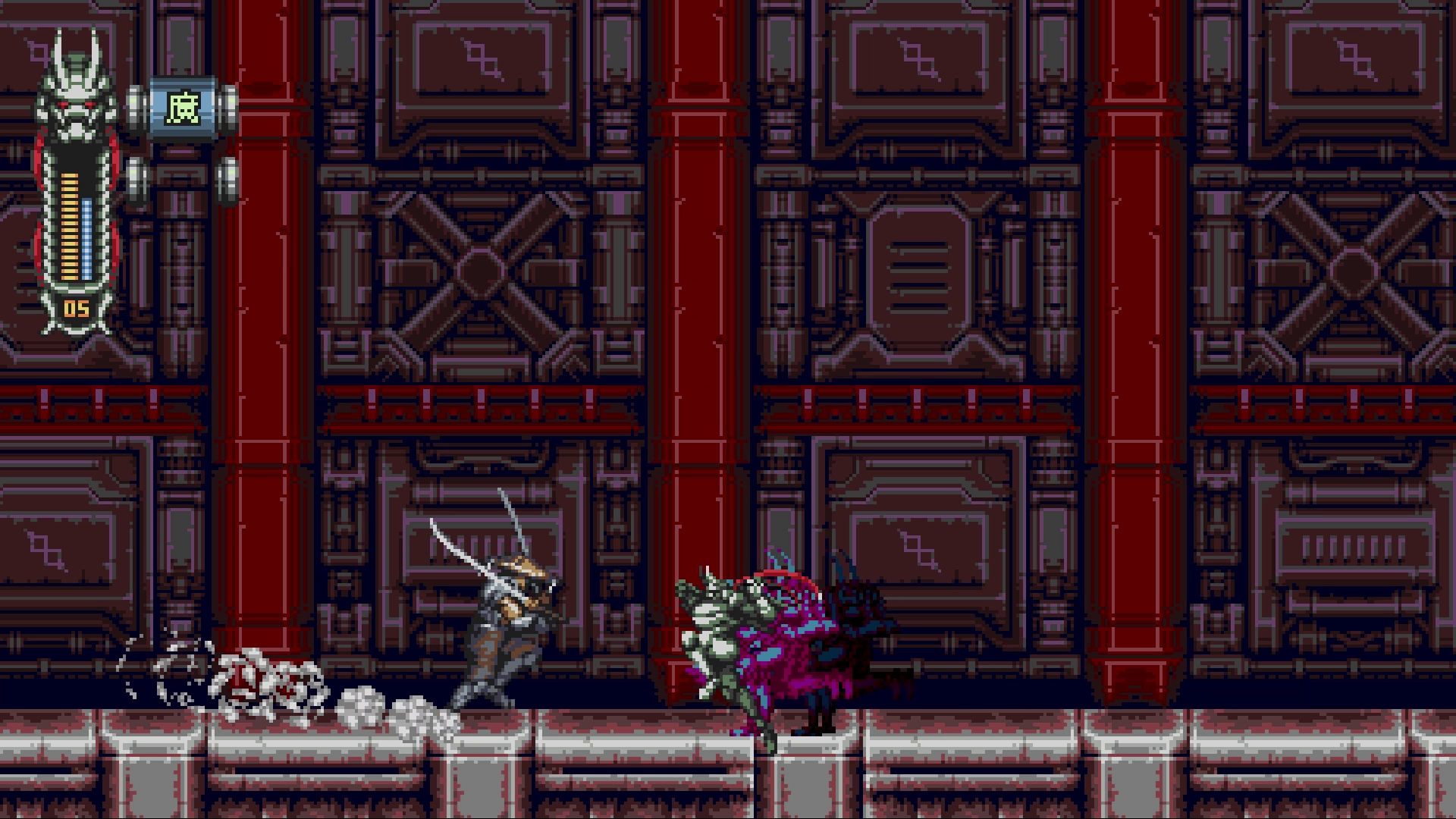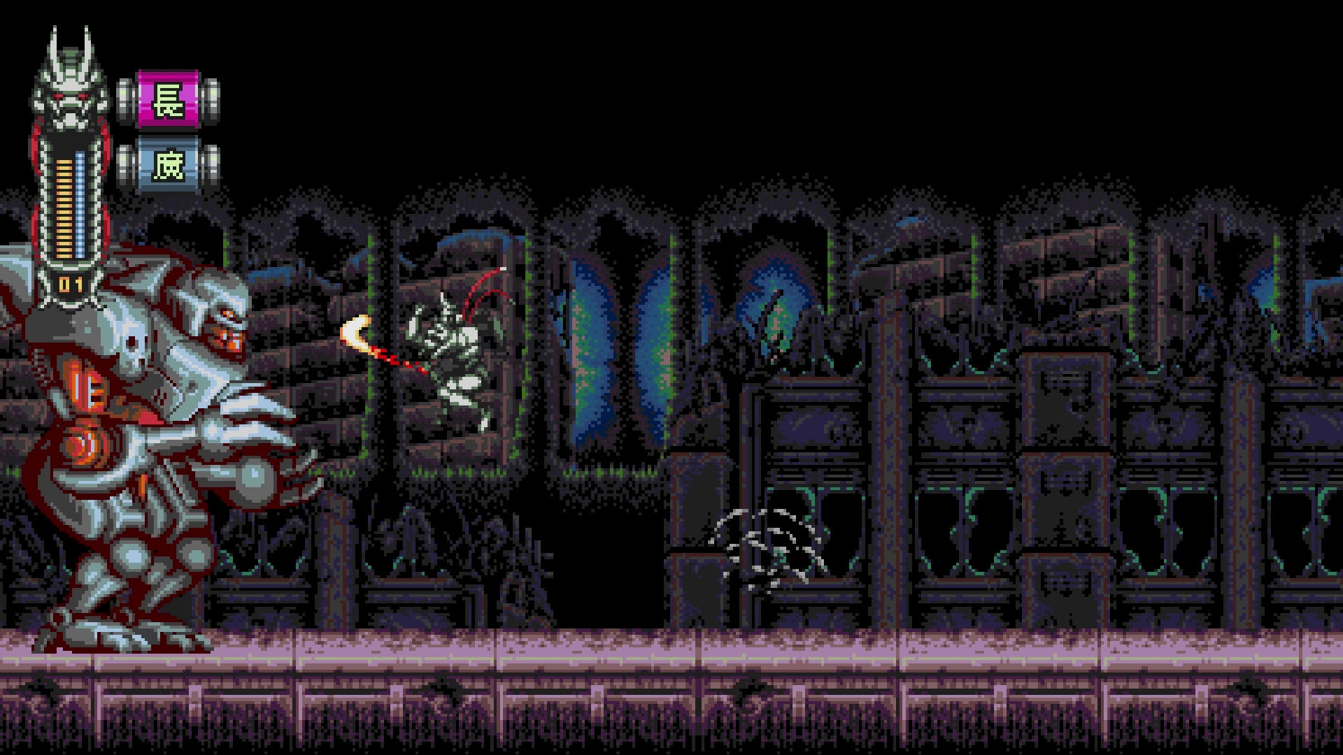 Tout cela donne lieu à une expérience particulièrement jouissive à prendre en main, avec une physique de saut certes un peu old school, mais à laquelle on se fait plutôt rapidement. C’est alors un véritable plaisir de mener le cyborg ninja à travers sa quête de justice, rapidement jonchée de cadavres pixelisés. D’autant que la réalisation est particulièrement réussie entre ses superbes graphismes 16 bits, ses musiques chiptune qui tabassent, et même quelques voix digitalisées. On se prend d’ailleurs tellement au jeu qu’on ne peut que regretter que l’aventure se termine un peu trop vite, ou en tout cas, qu’il n’y ait pas de véritables options ou contenus bonus capables de relancer l’intérêt sur la durée.