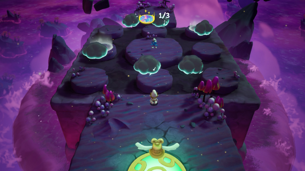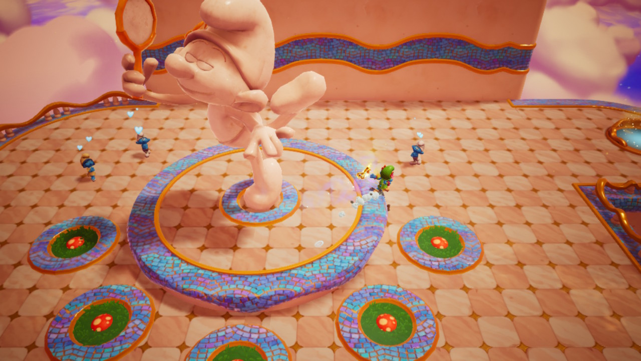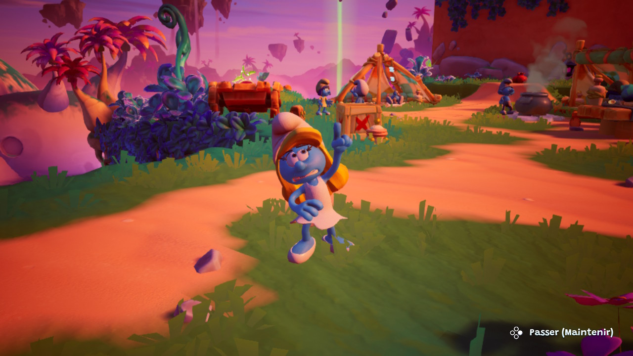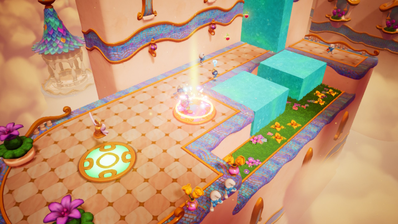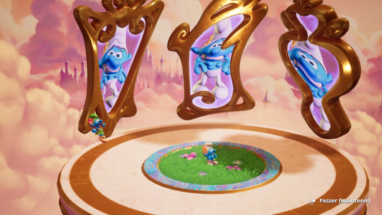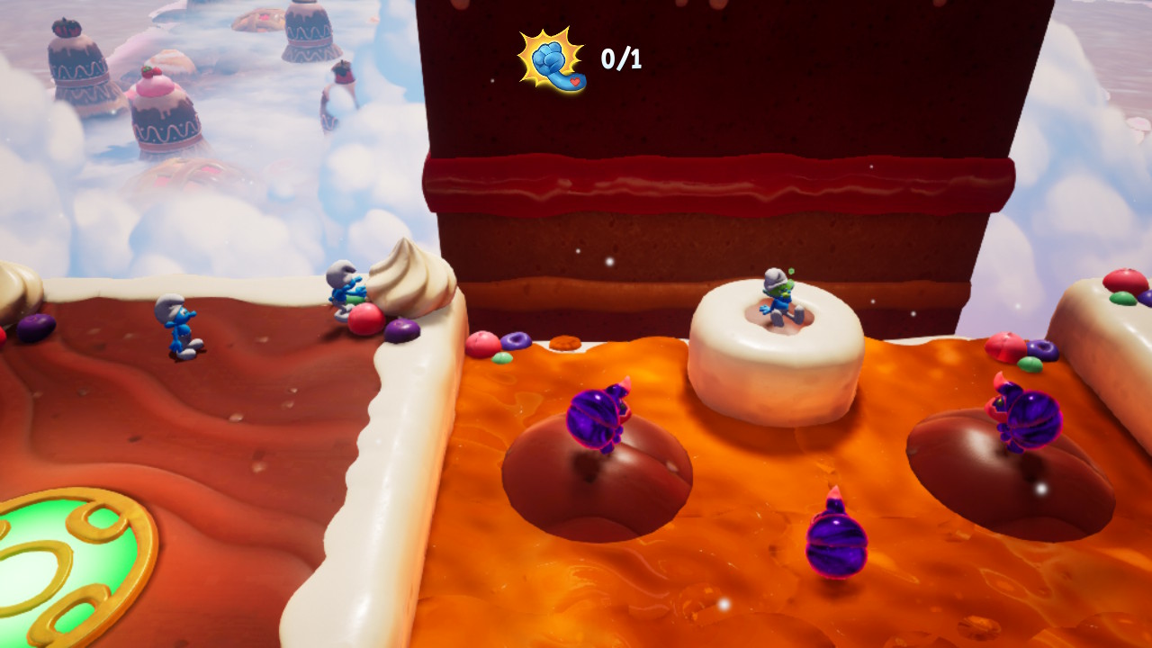 Si l’aventure se déguste joyeusement, c’est aussi parce qu’il faut reconnaître qu’il n’y a aucune réelle faute technique. Côté prise en main, le jeu est hyper souple, avec des petites techniques à assimiler qui seront surtout mises à l’épreuve lors du dernier niveau. Côté graphisme, le jeu s’en sort à merveille. Certes, les plateaux ne sont pas garnis de détails mais l’ensemble est vraiment mignon et bien animé. Les tenues que l’on peut acheter auprès du Schtroumpf tailleur sont amusantes. A noter qu’il y en a 2 en DLC… et vu ce que ce n’est que de la cosmétique, il y a comme un sentiment d’arnaque derrière. En tout cas, on se plaît à se balader dans ce village qui prend de plus en plus vie à mesure que l’on réveille les camarades.