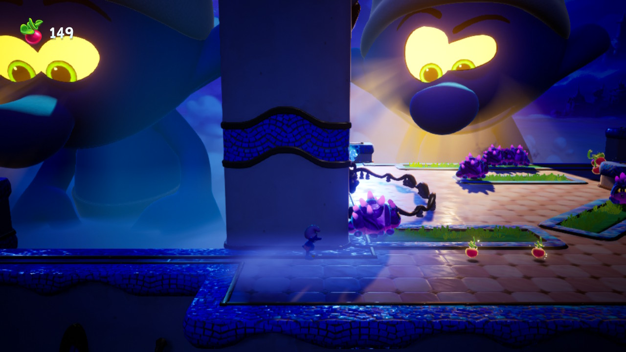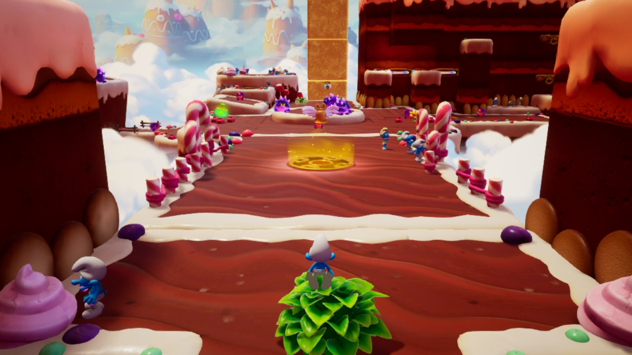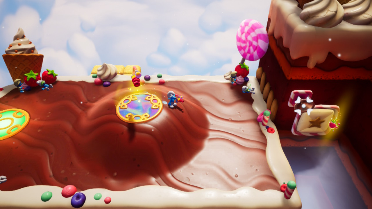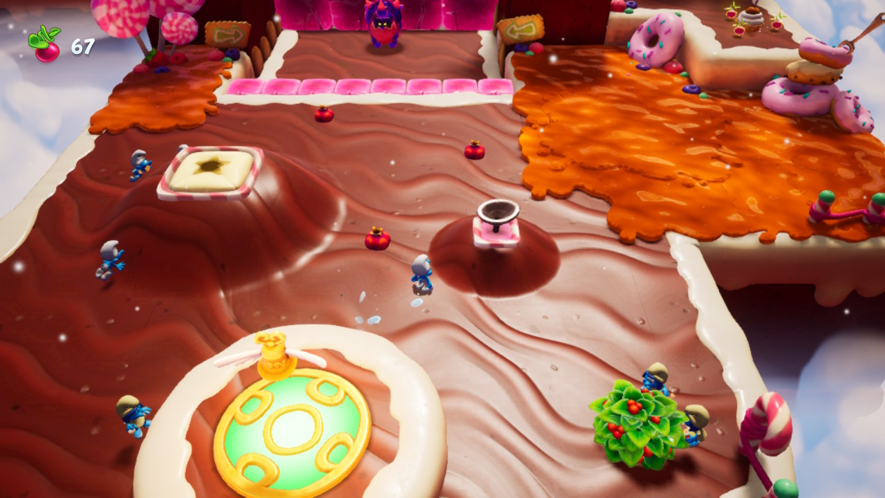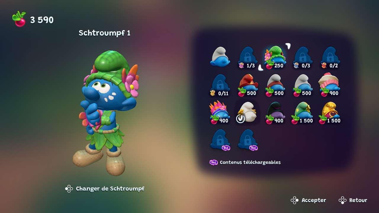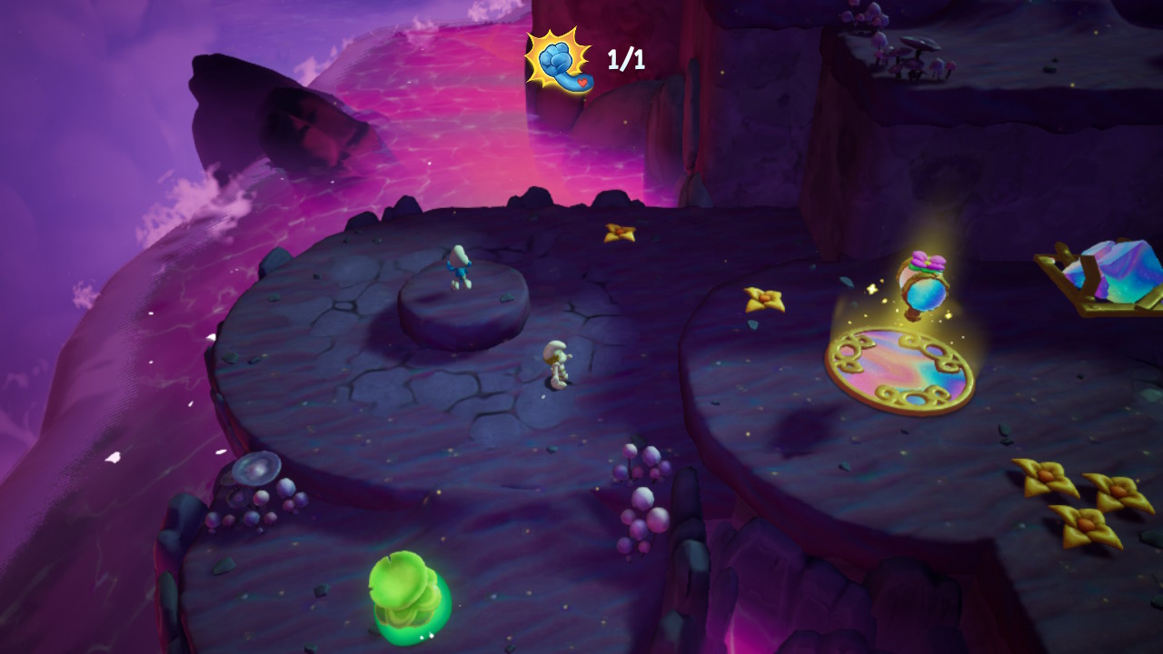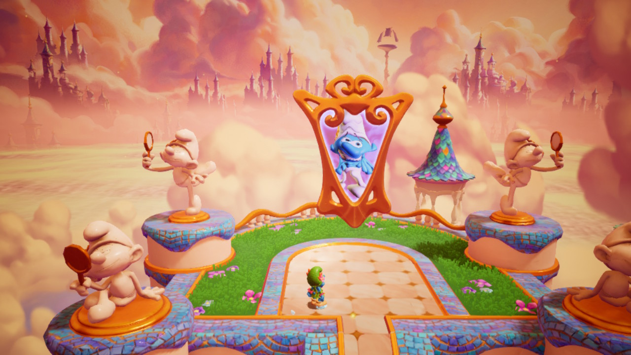 Si l’aventure se déguste joyeusement, c’est aussi parce qu’il faut reconnaître qu’il n’y a aucune réelle faute technique. Côté prise en main, le jeu est hyper souple, avec des petites techniques à assimiler qui seront surtout mises à l’épreuve lors du dernier niveau. Côté graphisme, le jeu s’en sort à merveille. Certes, les plateaux ne sont pas garnis de détails mais l’ensemble est vraiment mignon et bien animé. Les tenues que l’on peut acheter auprès du Schtroumpf tailleur sont amusantes. A noter qu’il y en a 2 en DLC… et vu ce que ce n’est que de la cosmétique, il y a comme un sentiment d’arnaque derrière. En tout cas, on se plaît à se balader dans ce village qui prend de plus en plus vie à mesure que l’on réveille les camarades.