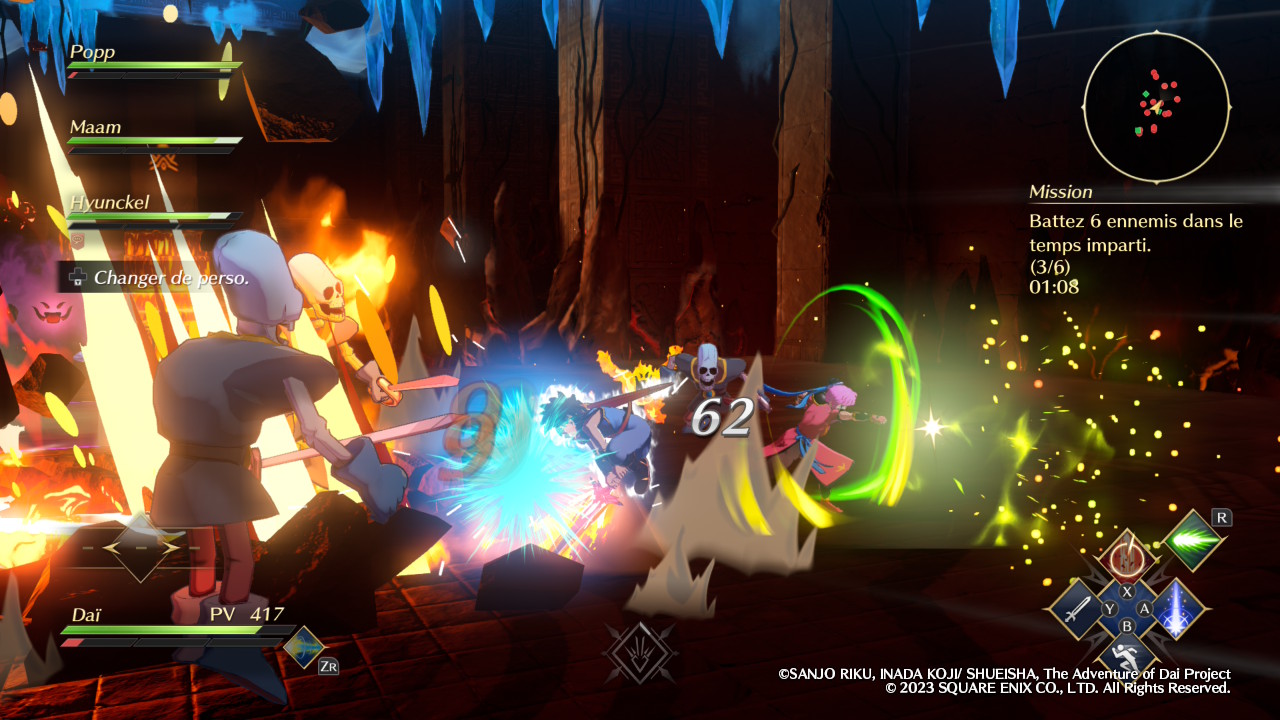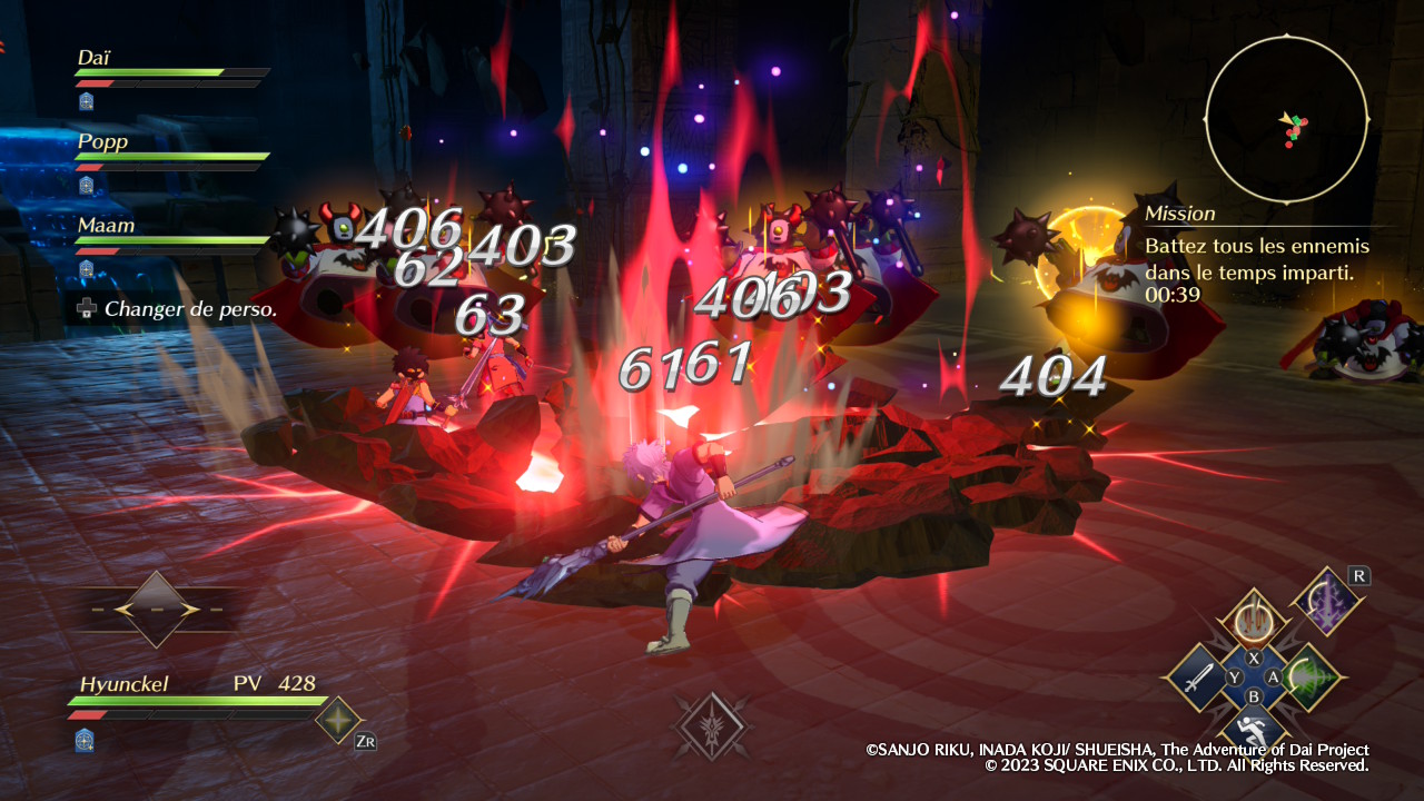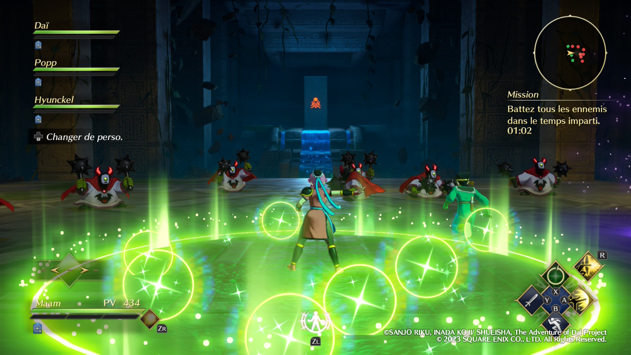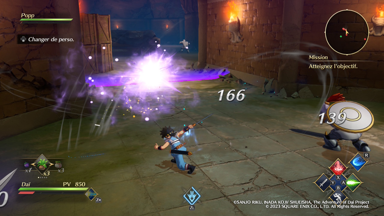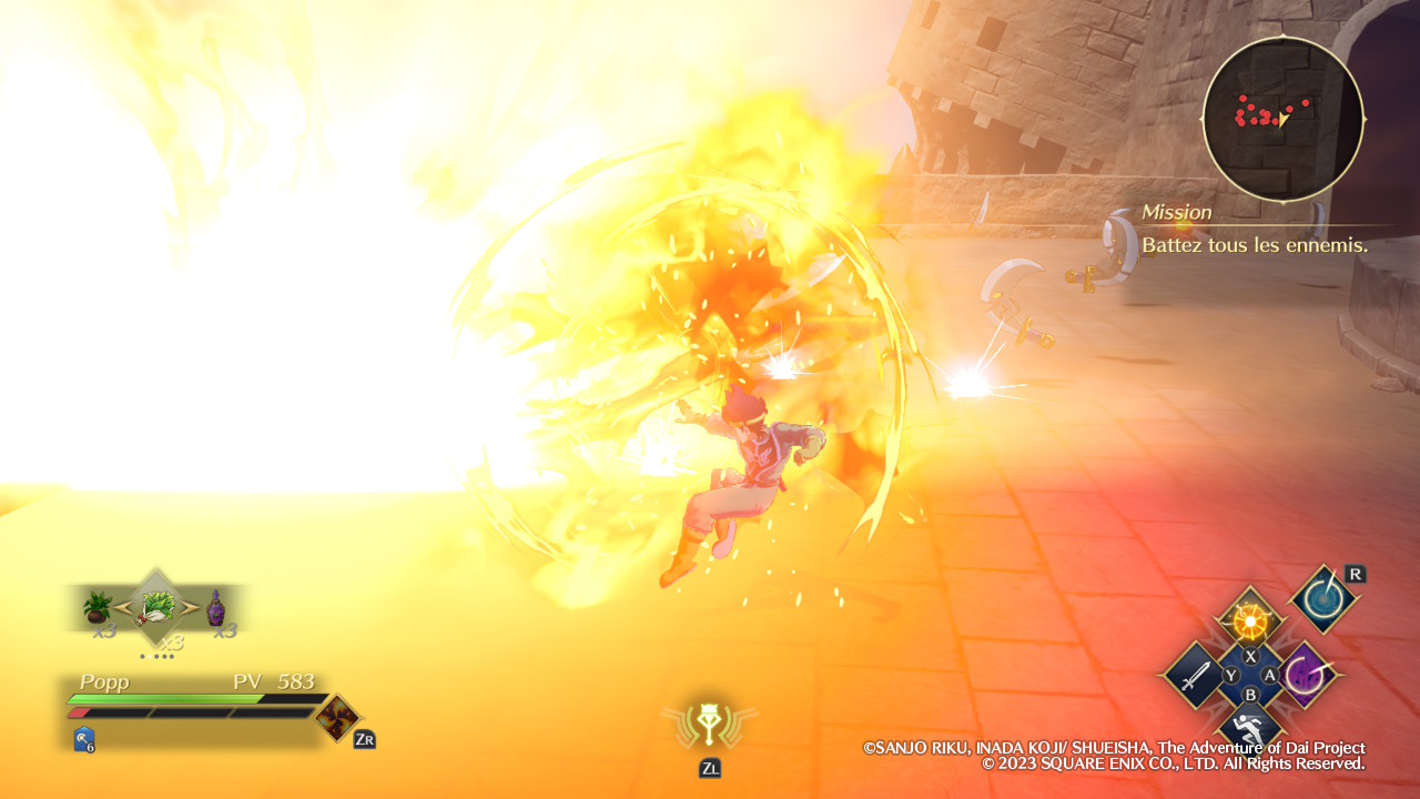 Évidemment, Infinity Strash ne se contente pas de nous faire incarner son protagoniste principal, le fameux Dai. Si l’équipe est malheureusement réduite aux seuls disciples du célèbre Avan, excluant par exemple ce bon vieux Crocodine, elle propose néanmoins un minimum de diversité. Certaines missions offrent d’ailleurs la possibilité de réunir jusqu’à quatre équipiers et le fait de pouvoir alterner entre eux en temps réel permet de varier les plaisirs. En tant que héros, Dai est ainsi autant à l’aise avec son épée qu’avec la magie offensive, et l’activation de son aura draconique, lorsque la jauge correspondante est suffisamment remplie, augmente ses statistiques de manière significative. Popp, jeune mage vantard dont la couardise cache en réalité une incroyable force de caractère, est pour sa part logiquement spécialisé dans le combat à distance grâce à ses magies élémentaires. En méditant, il peut réduire le temps de recharge de l’ensemble de ses sorts afin de pouvoir s’en servir plus souvent.