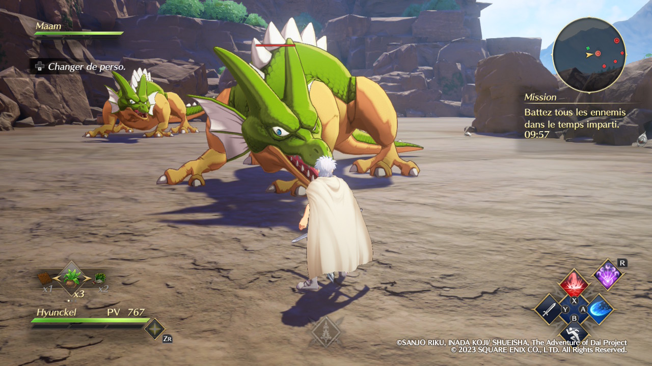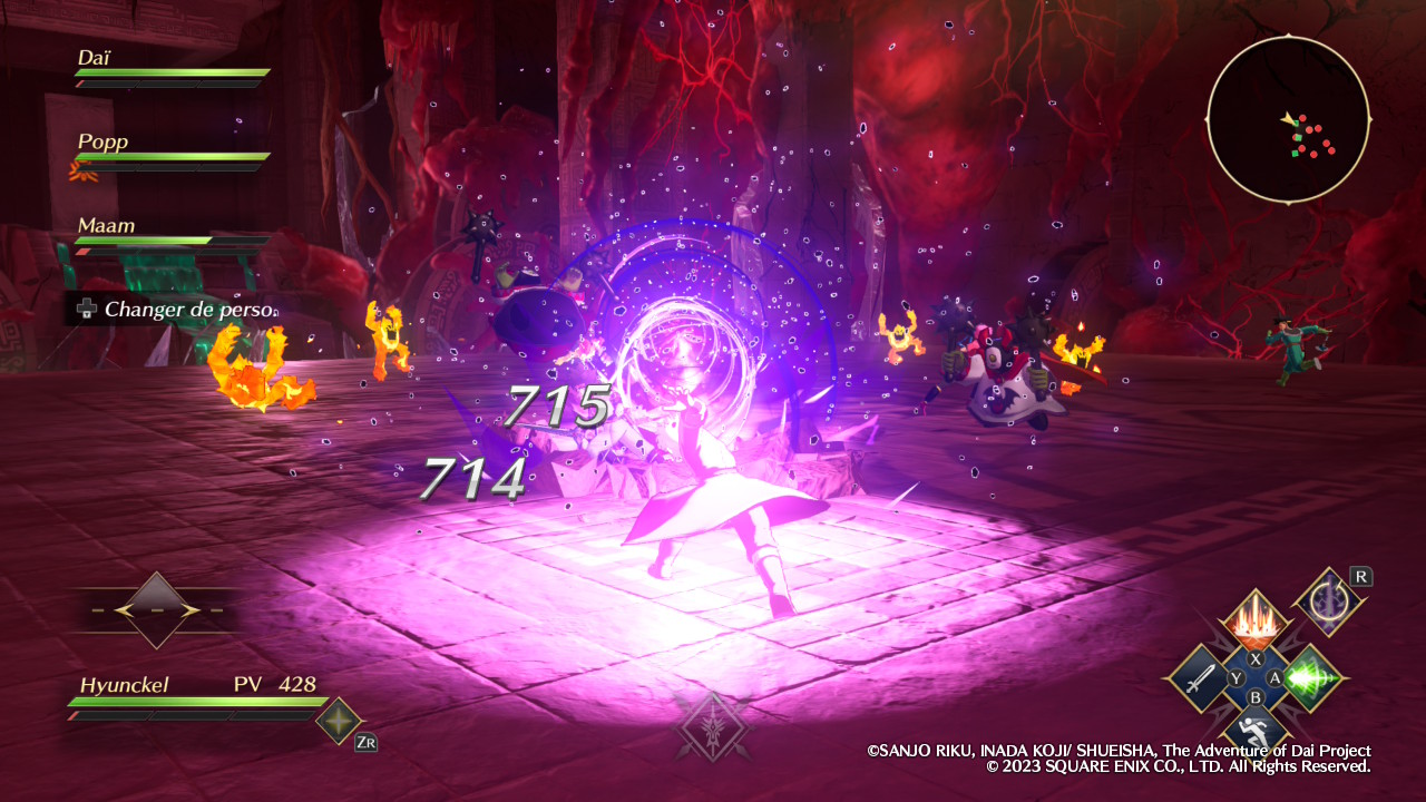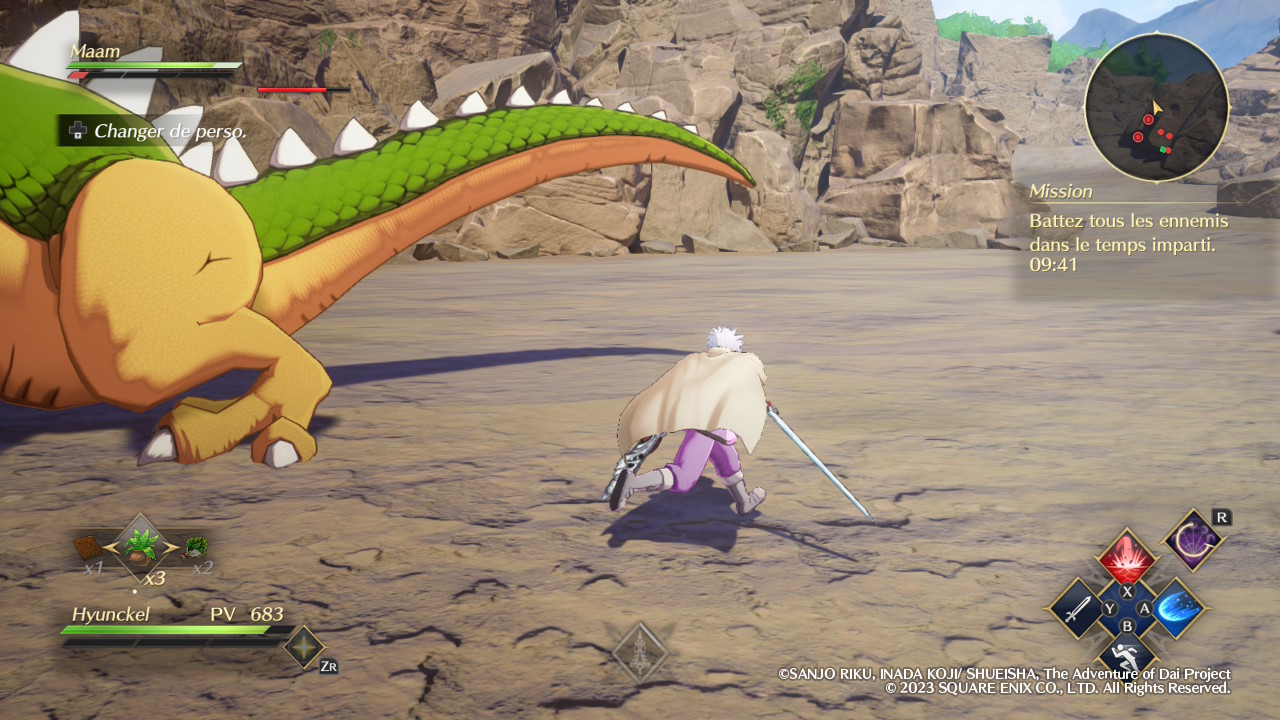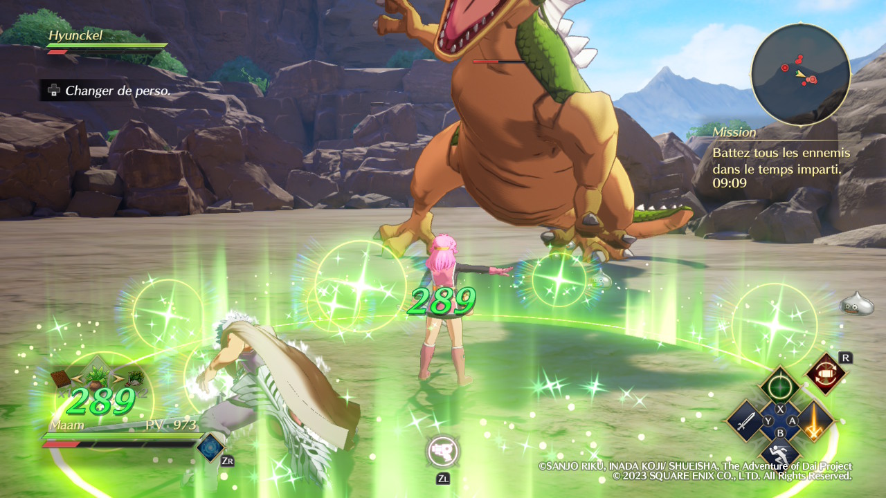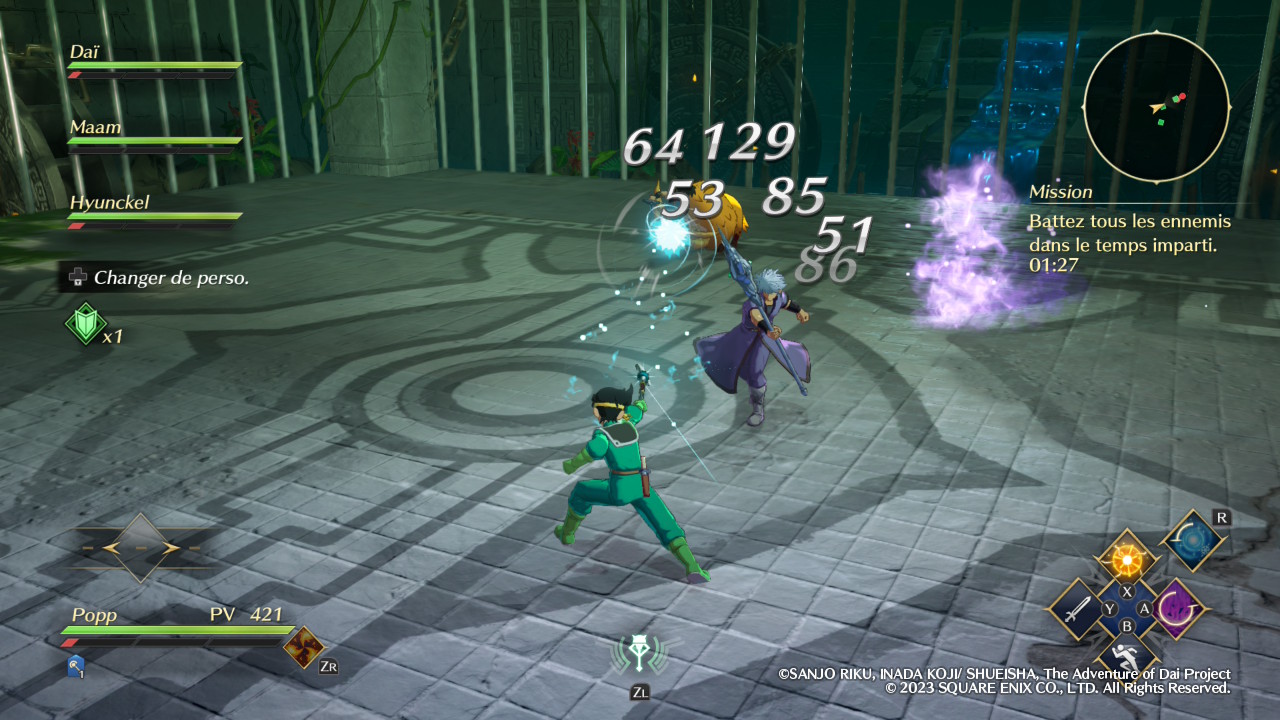 Évidemment, Infinity Strash ne se contente pas de nous faire incarner son protagoniste principal, le fameux Dai. Si l’équipe est malheureusement réduite aux seuls disciples du célèbre Avan, excluant par exemple ce bon vieux Crocodine, elle propose néanmoins un minimum de diversité. Certaines missions offrent d’ailleurs la possibilité de réunir jusqu’à quatre équipiers et le fait de pouvoir alterner entre eux en temps réel permet de varier les plaisirs. En tant que héros, Dai est ainsi autant à l’aise avec son épée qu’avec la magie offensive, et l’activation de son aura draconique, lorsque la jauge correspondante est suffisamment remplie, augmente ses statistiques de manière significative. Popp, jeune mage vantard dont la couardise cache en réalité une incroyable force de caractère, est pour sa part logiquement spécialisé dans le combat à distance grâce à ses magies élémentaires. En méditant, il peut réduire le temps de recharge de l’ensemble de ses sorts afin de pouvoir s’en servir plus souvent.