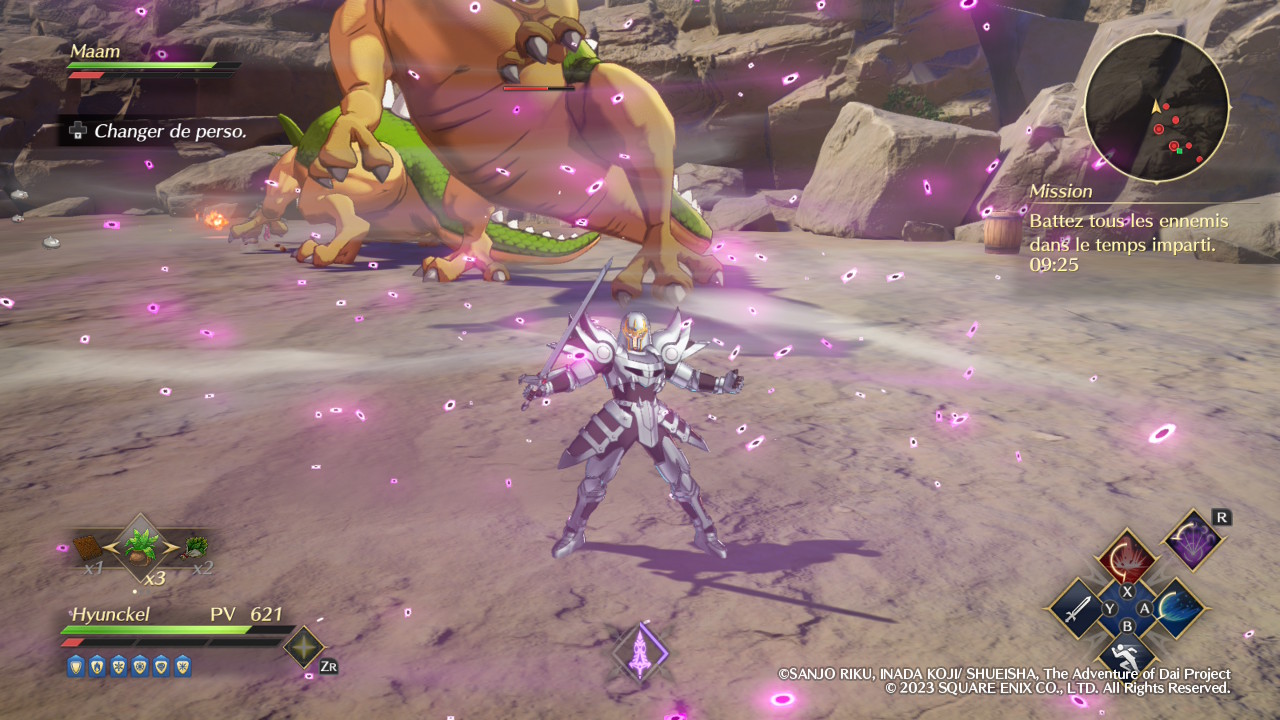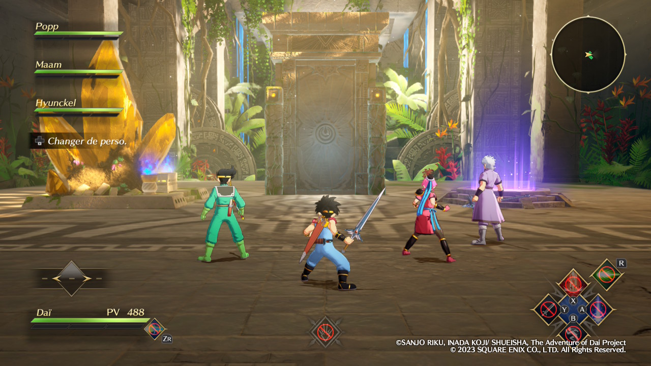 Présenté comme un action-RPG, Infinity Strash – Dragon Quest : The Adventure of Dai est en pratique plus proche du beat them all enrichi que du jeu de rôle en temps réel. Par certains côtés, la formule rappelle d’ailleurs celle des Warriors d’Omega Force, déjà employée dans les deux Dragon Quest Heroes et désormais bien connue des fans de Nintendo. Sauf qu’ici, il n’y a ni exploration, ni dimension stratégique à prendre en compte. Les environnements se limitent généralement à des arènes exiguës et les affrontements restent très bourrins, bien qu’assez spectaculaires lorsque les techniques spéciales commencent à pleuvoir dans tous les sens. Sans forcément impressionner d’un point de vue technique, avec un framerate limité à 30 images par seconde, une résolution parfois un peu basse et un brin d’aliasing disgracieux, ces phases de combat ont ainsi l’avantage d’être en 3D et bénéficient d’une direction artistique colorée somme toute plaisante. Ce constat vaut toutefois surtout lorsqu’on joue sur Switch 2 grâce à la rétrocompatibilité de la machine. Sur sa grande sœur, on note en effet des soucis assez gênants, comme de gros ralentissements et des gels d’image intempestifs qui cassent totalement l’action, en particulier dans le mode Sanctuaire.