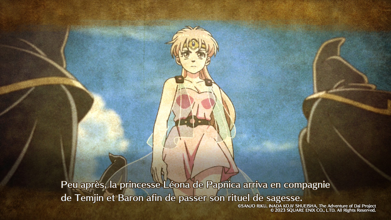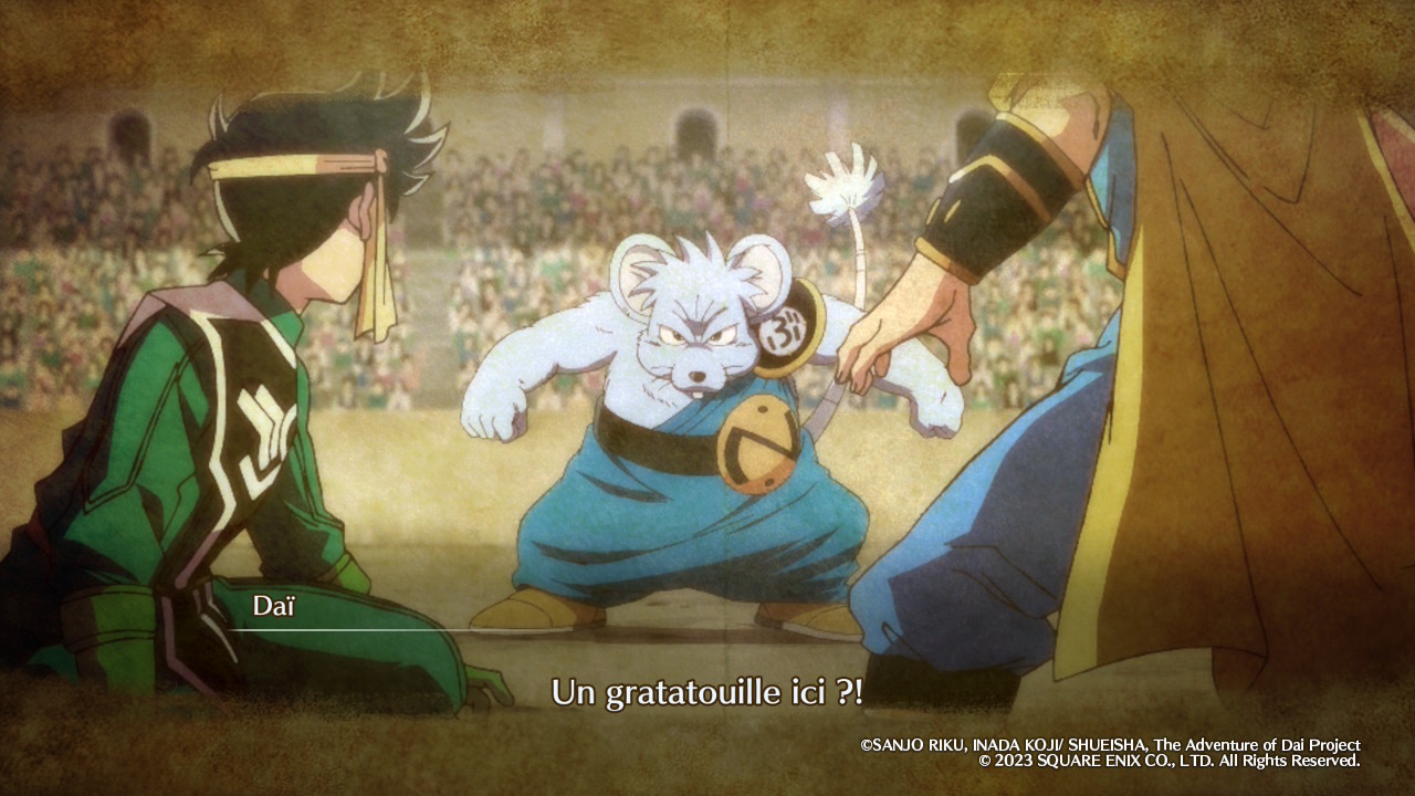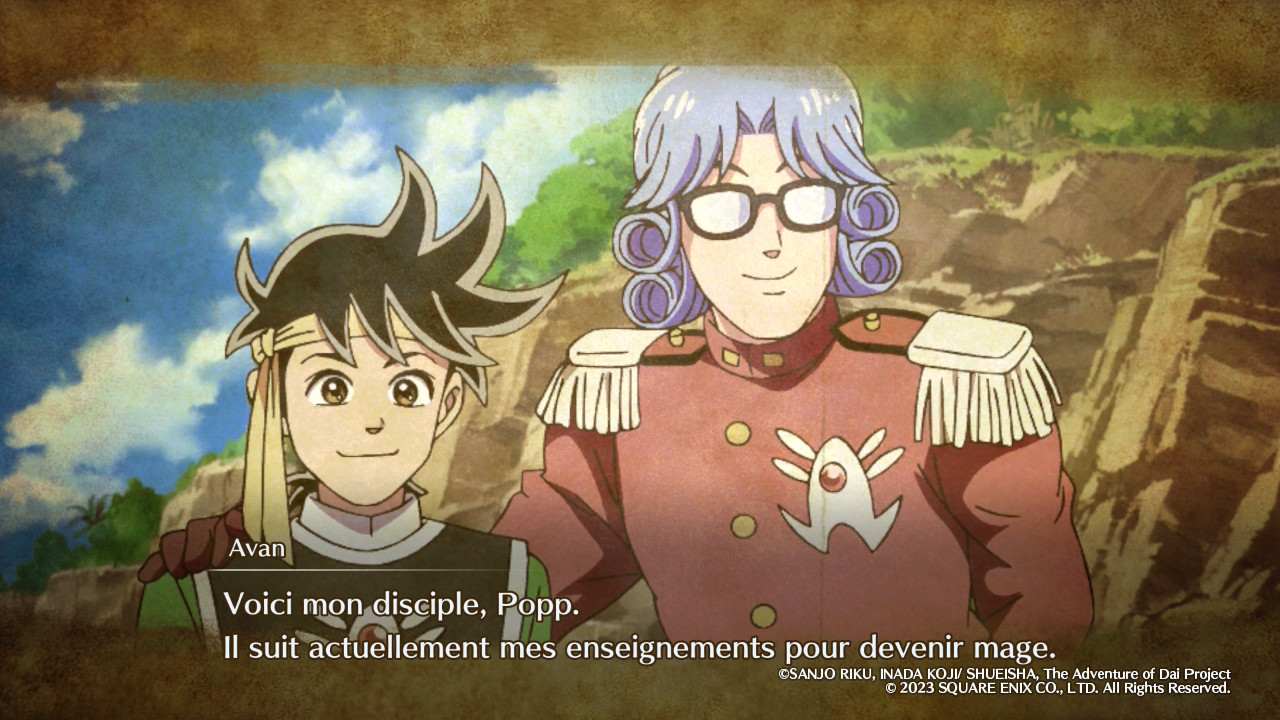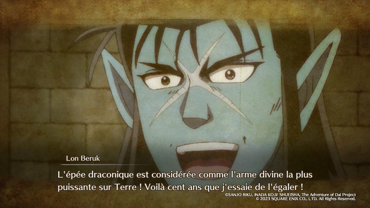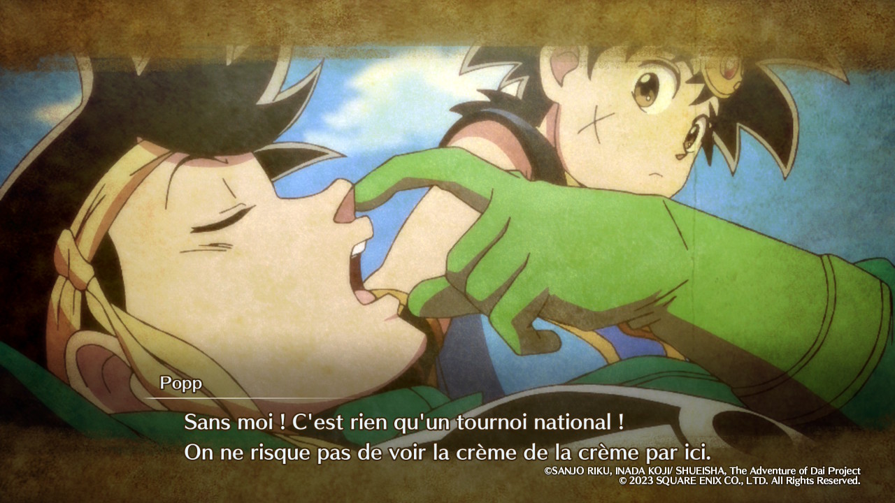 Au-delà de sa prépublication initiale dans Weekly Shōnen Jump entre 1989 et 1996, de sa compilation en 37 tomes par Shūeisha et de son édition française évoquée en introduction, Dragon Quest : Dai no Daibōken a évidemment connu, au fil des années, diverses rééditions, localisations, adaptations et autres œuvres dérivées, changeant au passage de titre français pour devenir Dragon Quest : La Quête de Daï. Sans refaire tout l’historique, il est nécessaire de mentionner au moins l’anime produit par Toei Animation entre 2020 et 2022 puisque les illustrations utilisées par les développeurs de Game Studio et KAI GRAPHICS pour les scènes cinématiques d’Infinity Strash en sont directement tirées. On parle bien ici d’illustrations, et non d’extraits vidéo, le jeu faisant le choix de nous raconter son histoire de manière assez statique avec un enchaînement d’images fixes agrémentées de quelques effets visuels. Or, on ne va pas se le cacher, cette approche est un peu déconcertante, voire carrément décevante si on s’attendait à un minimum d’ambition technique. Il y a bien quelques passages en 3D, mais ils sont assez rares, et on passera finalement la plupart de son temps à regarder ce qu’on pourrait qualifier de diaporamas améliorés.