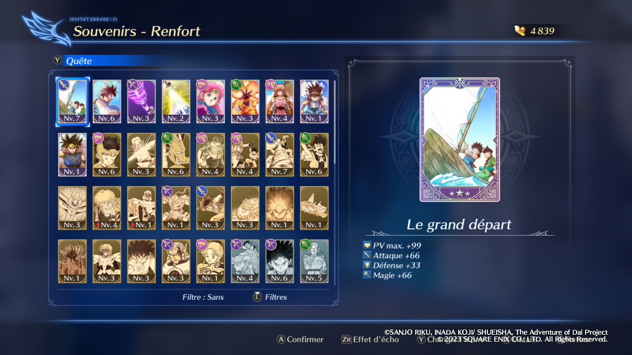 Chaque membre du quatuor dispose donc de sa propre manière de se battre et cela va se traduire dans l’évolution naturelle de leurs statistiques qu’on pourra accompagner grâce à des souvenirs récoltés au fil de l’aventure. Ces derniers représentent certains moments clés de l’histoire et bénéficient souvent d’illustrations issues du manga, et non de l’anime. Ils existent en trois niveaux, symbolisés par une, deux ou trois étoiles, et peuvent être équipés dans des emplacements dédiés qui se débloquent progressivement lors de la montée de niveau. Plutôt nombreux, les souvenirs offrent des bonus assez variés, parfois compensés par quelques malus, et il sera possible de les améliorer au sein du Sanctuaire, tout comme les talents et les sorts, à condition de disposer des ressources nécessaires. Cerise sur le gâteau, plus on obtiendra de souvenirs au sein de chaque chapitre, plus on disposera de bonus de statistiques supplémentaires.