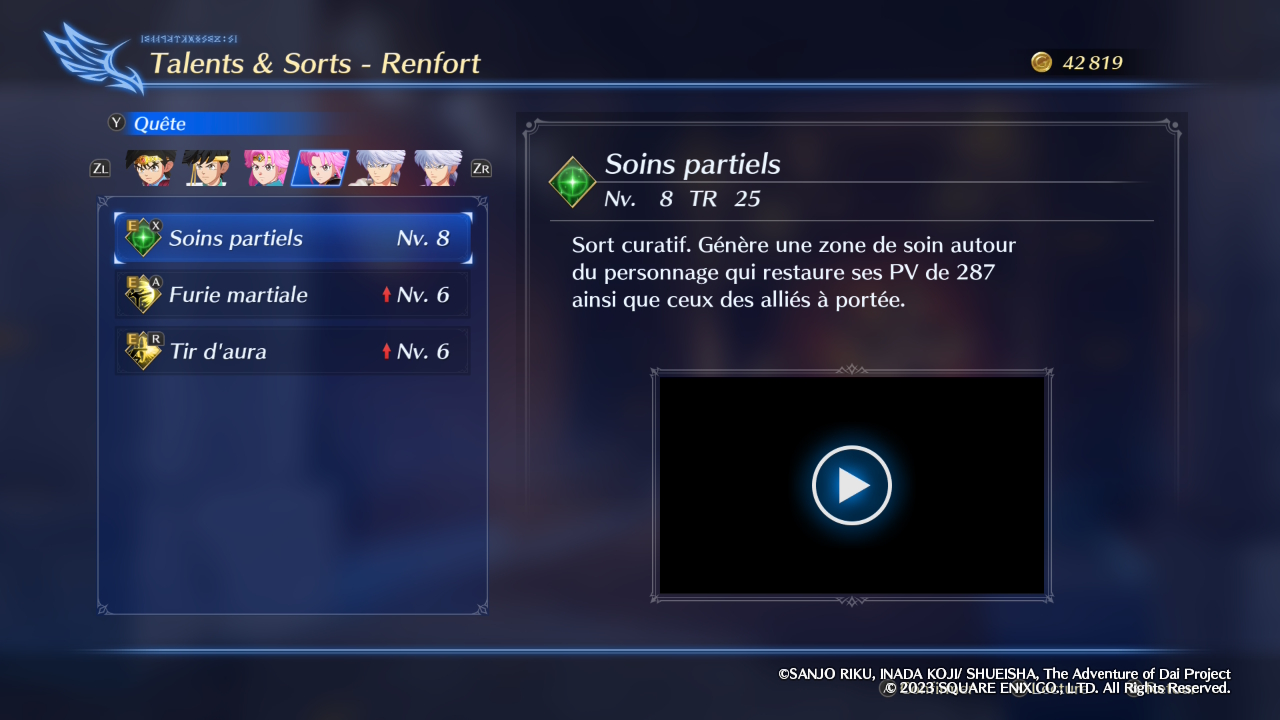Ces chiffres doivent néanmoins être pondérés par le fait que certains talents et sorts ne sont que des versions améliorées d’autres, comme Flamme, Crame et Bang qui finissent par être avantageusement remplacés par Superflamme, Supercrame et Superbang. On retrouve d’ailleurs la même chose au niveau des coups de grâce, puisque Dai, Popp et Hyunckel (en épéiste) pourront en débloquer un second, évidemment plus puissant. À ce petit jeu, c’est d’ailleurs finalement Dai qui s’en sort le mieux avec assez peu de redites dans son panel de techniques et surtout une double approche de guerrier/mage qui offre davantage de latitude dans la manière de le développer, là où ses compères sont plus monolithiques. Une nouvelle fois, on ne peut que regretter le choix d’Infinity Strash de raconter moins de la moitié de l’histoire du manga et de l’anime, puisque cela a forcément un impact sur le déséquilibre existant entre les disciples d’Avan, tous n’ayant pas progressé de manière équivalente à ce stade du récit.