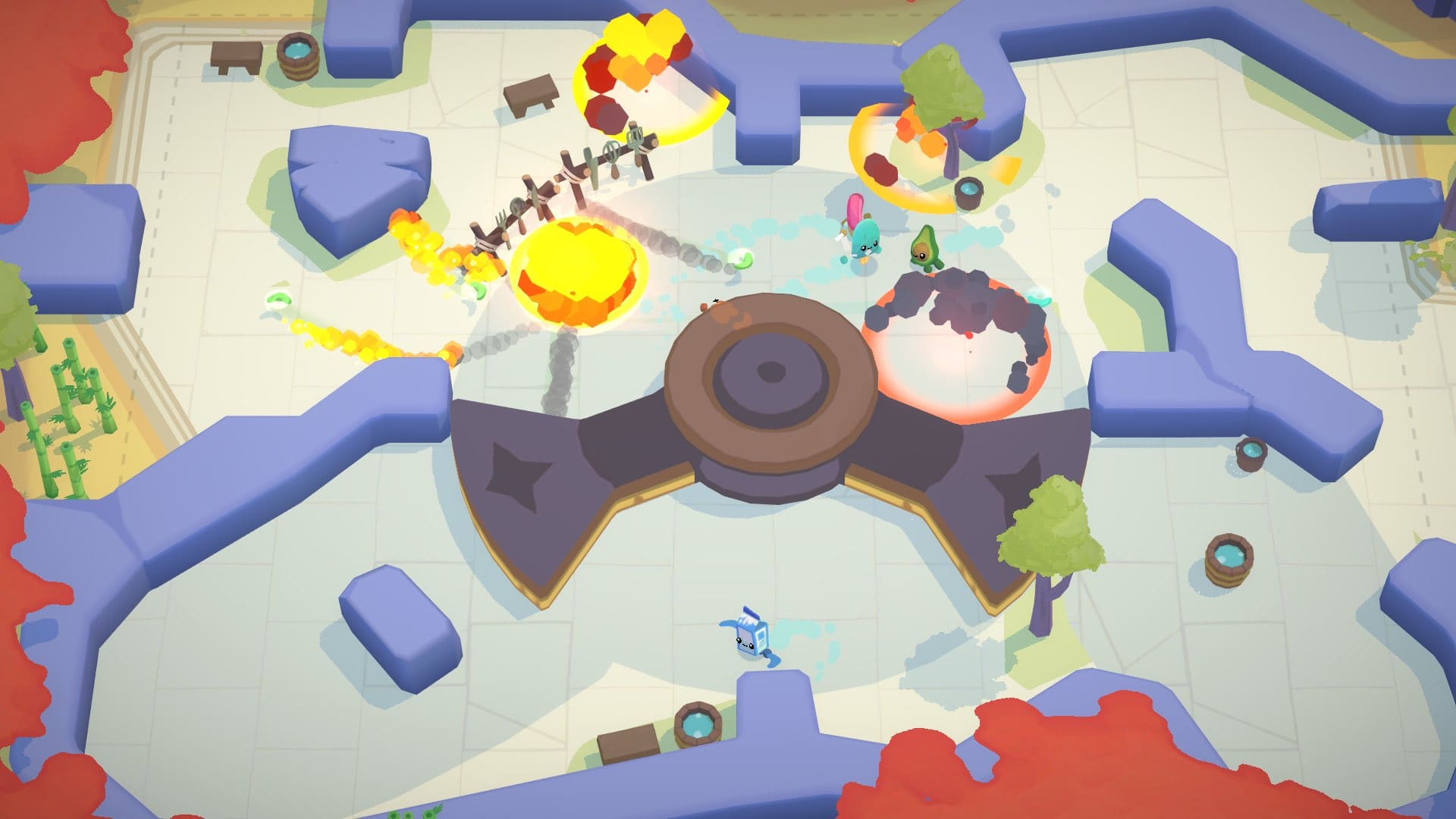 A priori, hors boucliers et ruées en avant, il paraît impossible de se sortir de mauvaises situations. Pire encore : où est donc passé l’art martial tant mis en avant dans le titre du jeu de Cranky Watermelon ? Il est bien là, rassurez-vous, mais plus subtil que le lancer de projectiles ou leurs pouvoirs explosifs. Non content de balancer votre arme au visage de vos adversaires, vous pourrez également vous en servir au corps-à-corps, notamment après une approche sournoise dans le dos de votre cible. Ce coup à bout portant, le joueur pourra également s’en servir pour contrer un coup similaire ou, s’il a le réflexe transcendantal d’un Saiyan, de dévier un tir ennemi. Il s’agit ici de la plus grosse courbe de progression que le jeu a à offrir, avec les trajectoires des lancers de boomerangs. Il faudra quelques parties aux plus talentueux joueurs pour maîtriser cette aptitude vitale et rester ainsi le dernier debout. Enfin, il faudra bien faire attention à ne pas rester dans les zones hors-arène trop longtemps, sous peine d’y laisser la vie. Et si la partie s’éternise trop, alors cette zone se resserre petit à petit, à la manière d’un battle royale.